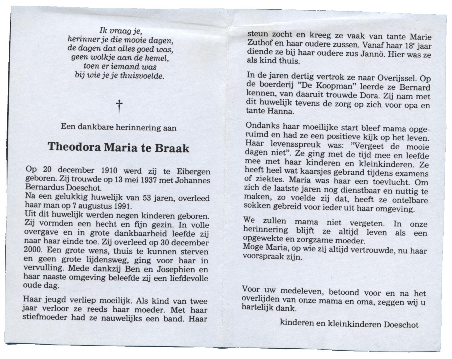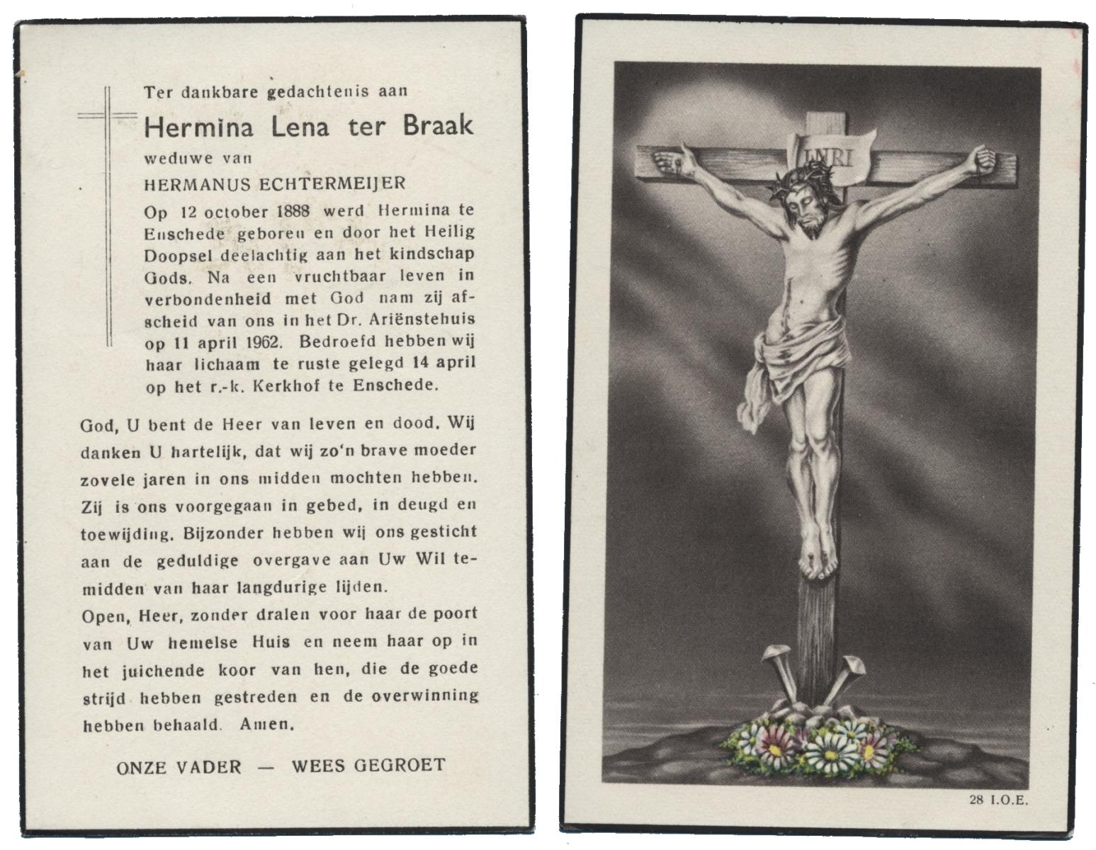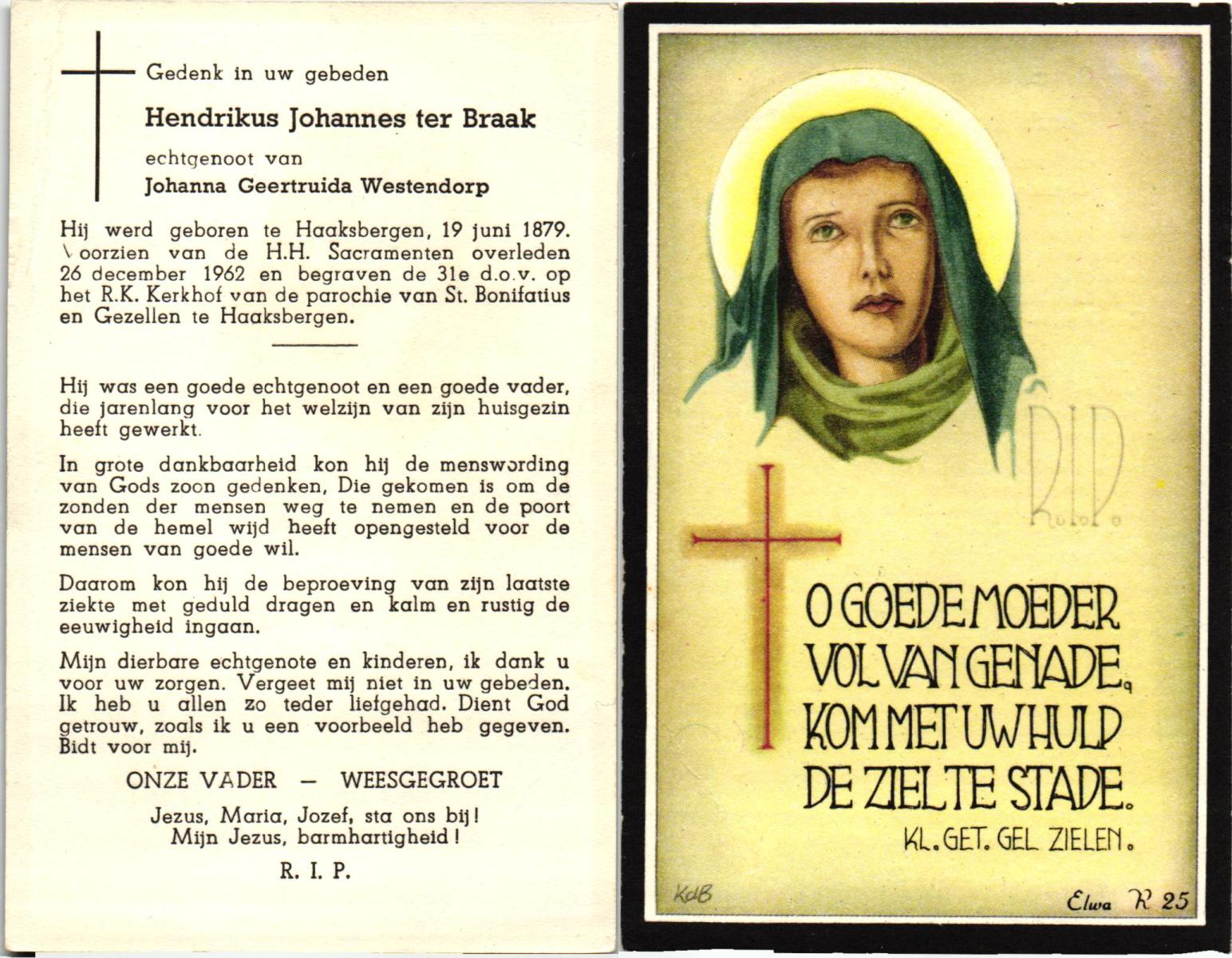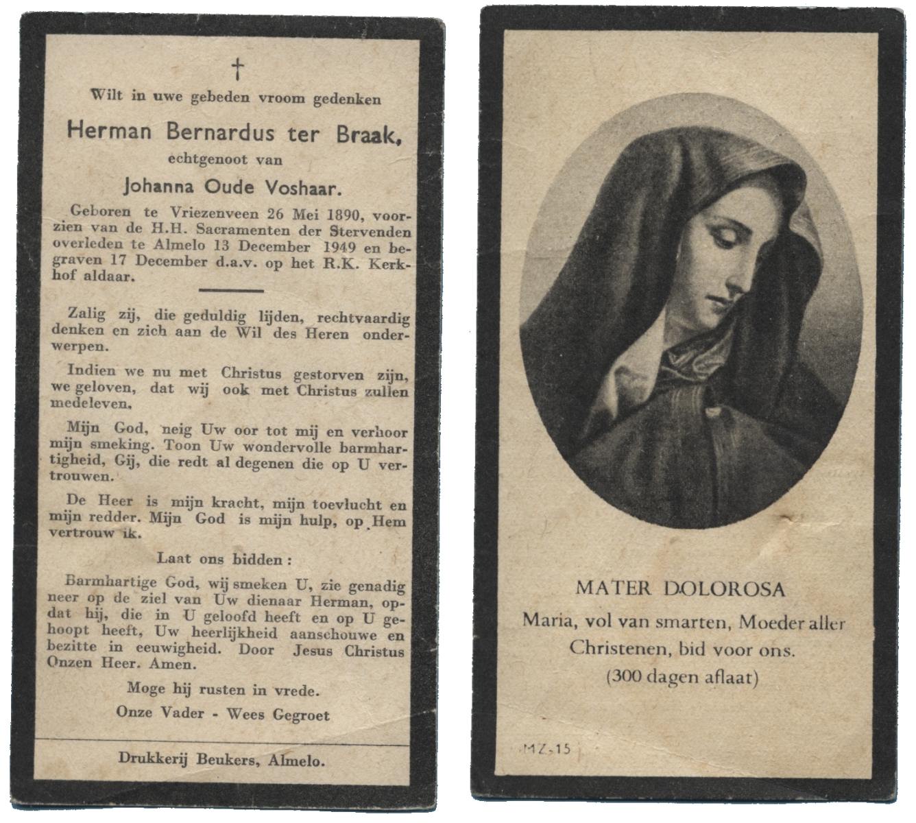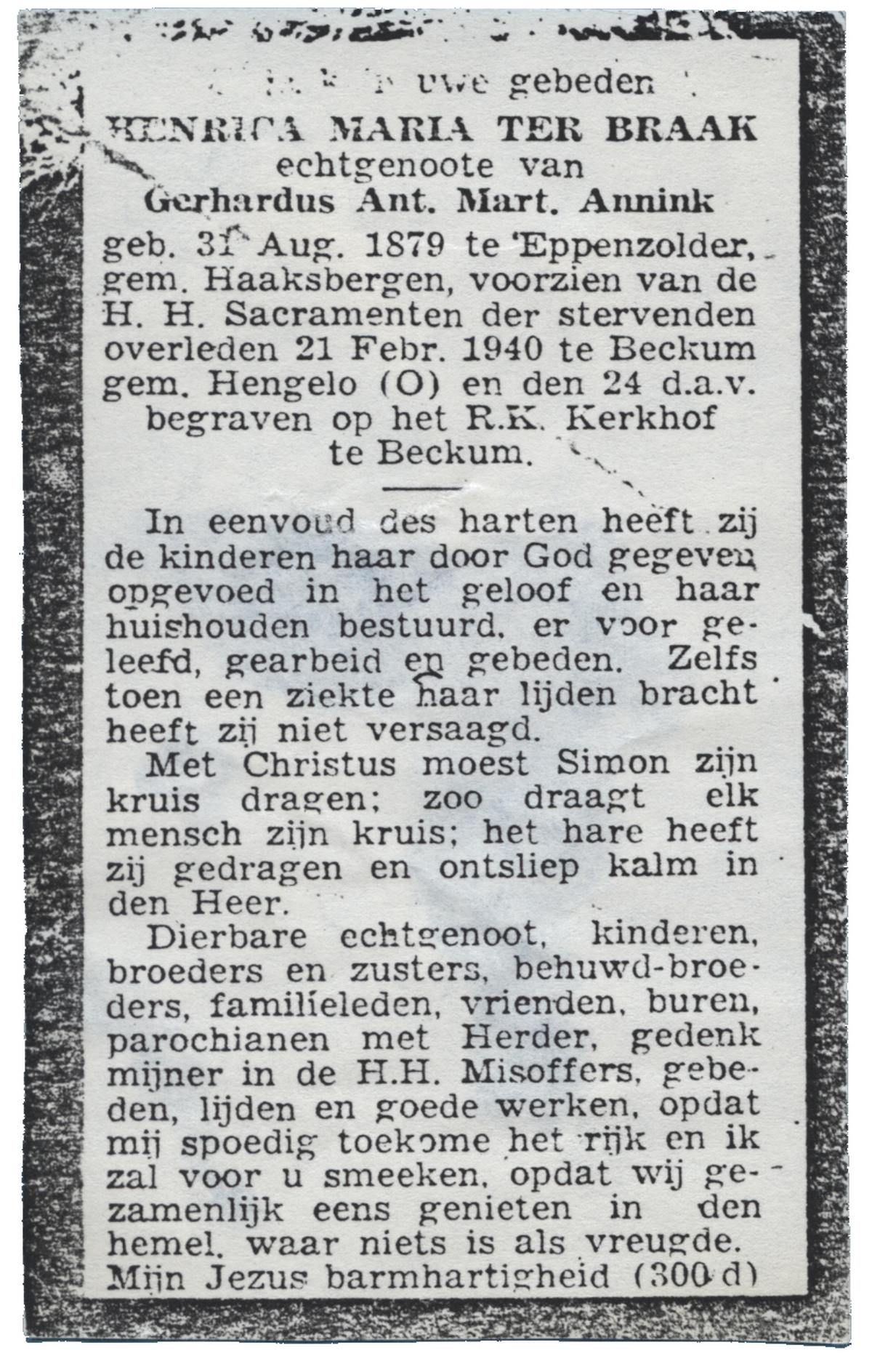 BRAAK, ter, Maria, geboren op 18-08-1863 te Delden, Ambt, overleden op 19-3-1954 te Bornerbroek op 90-jarige leeftijd, begraven op 23-3-1954 te Bornerbroek.