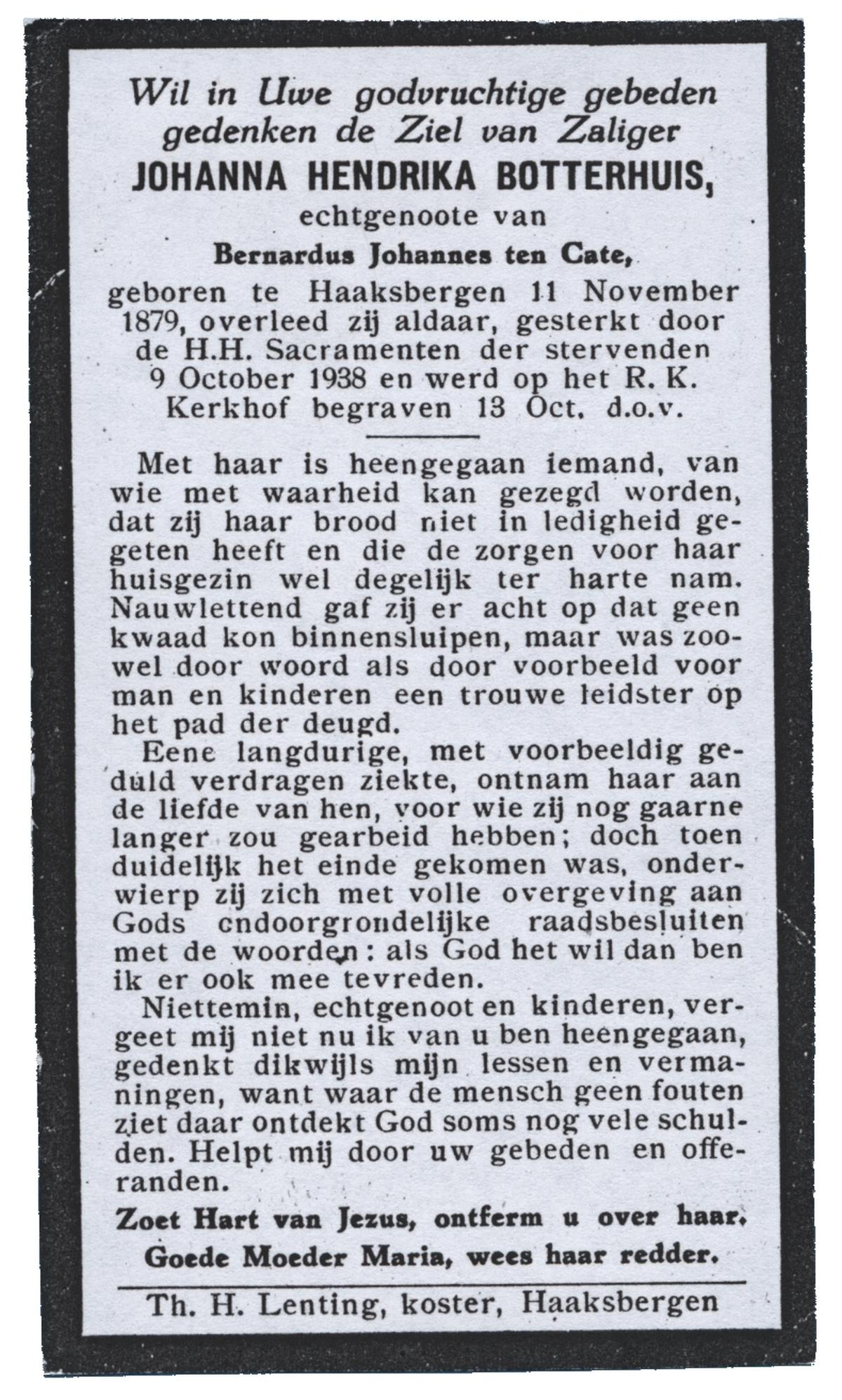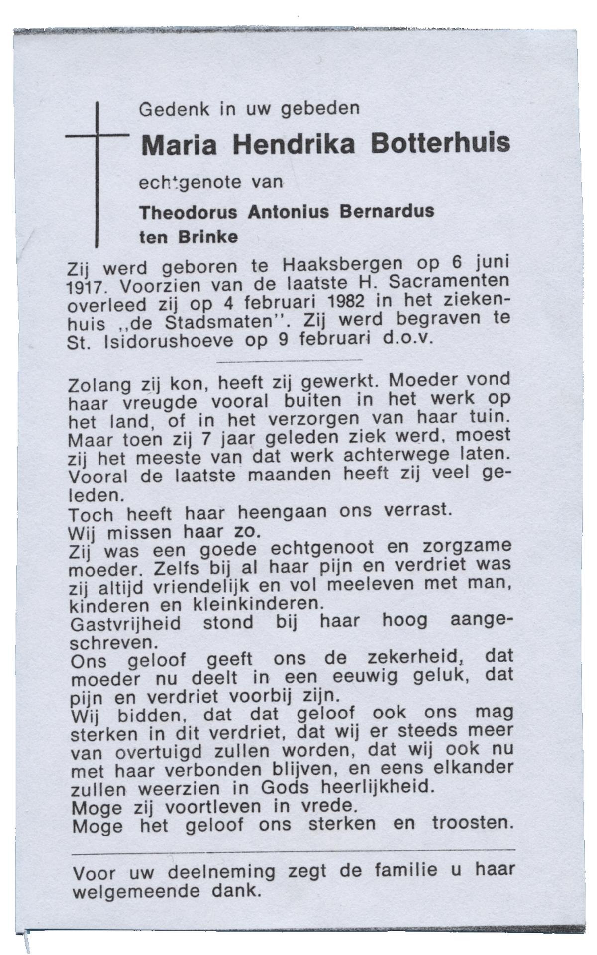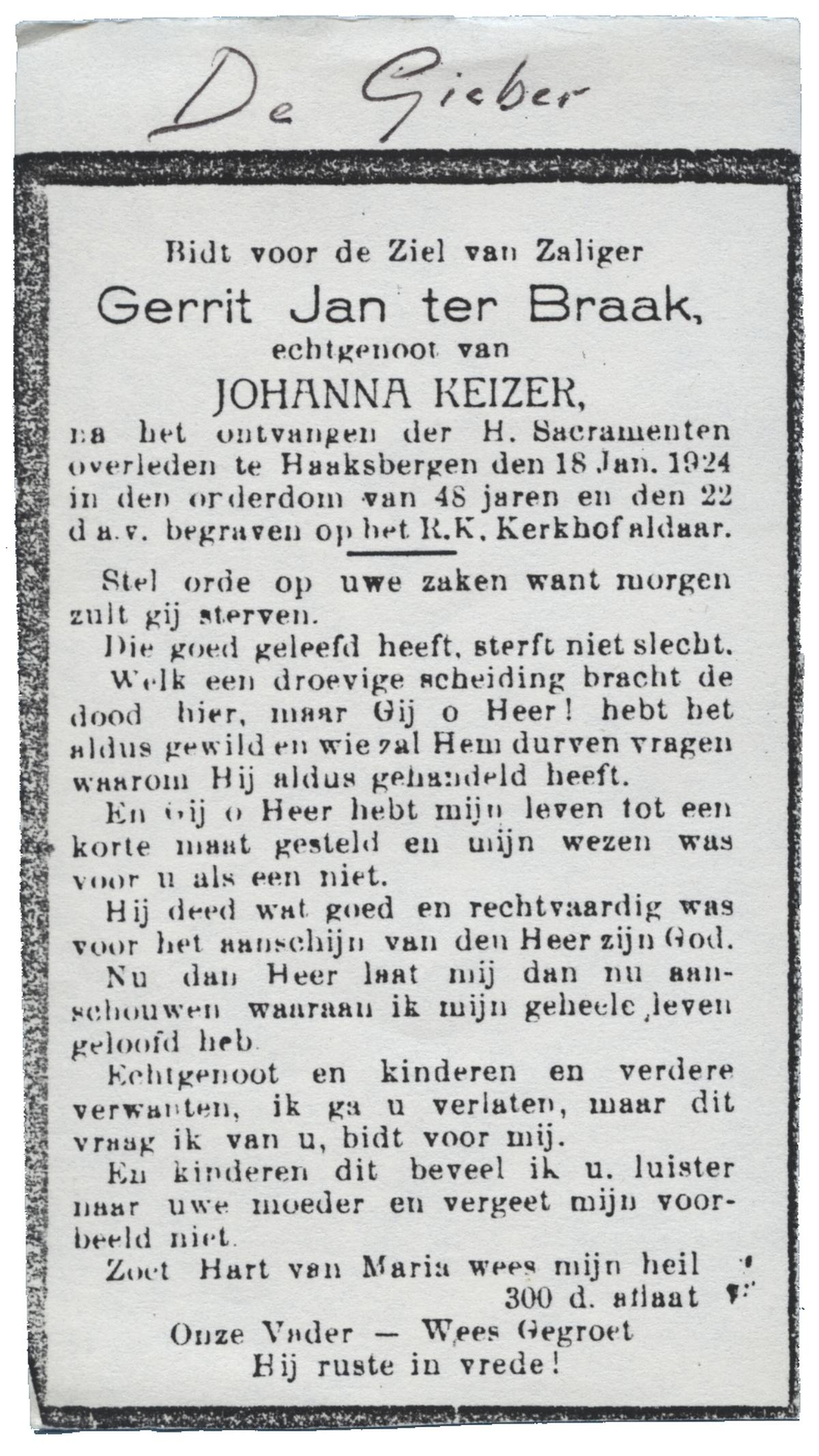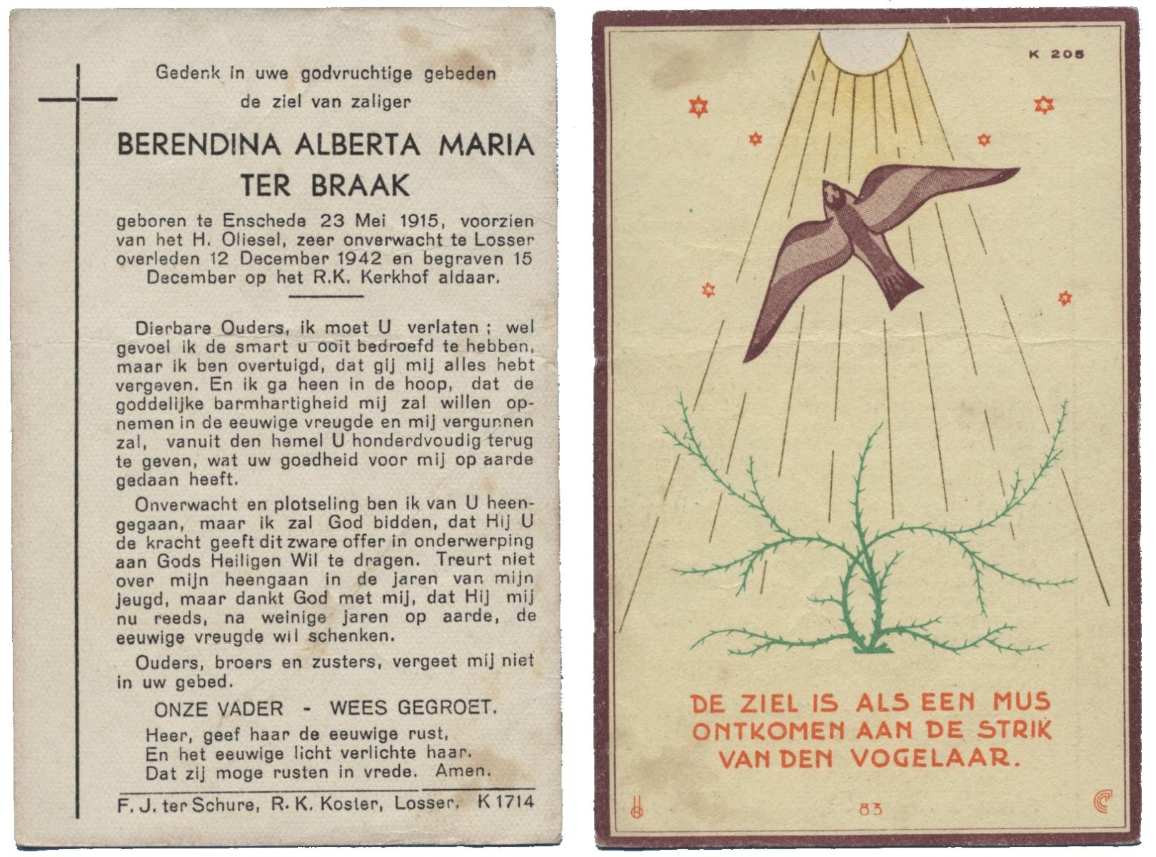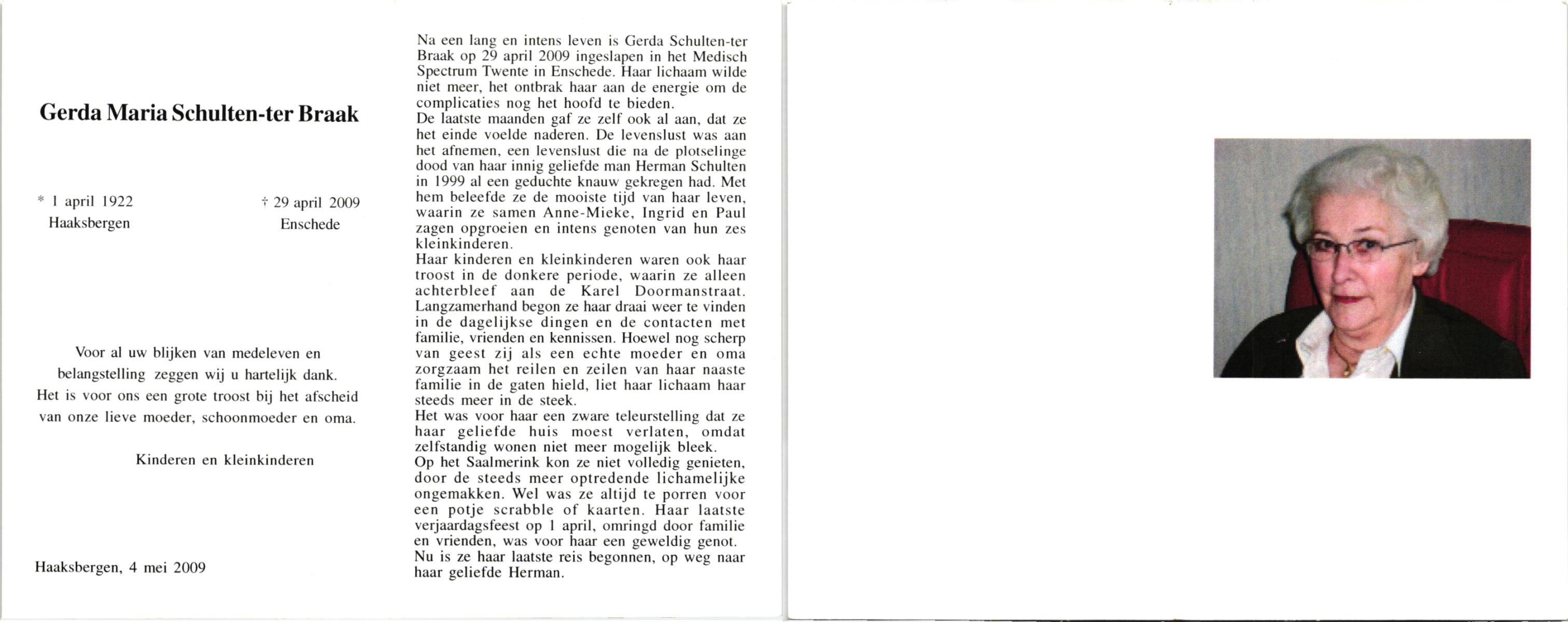 BRAAK, ter, Maria, geboren op 18-08-1863 te Delden, Ambt, overleden op 19-3-1954 te Bornerbroek op 90-jarige leeftijd, begraven op 23-3-1954 te Bornerbroek.