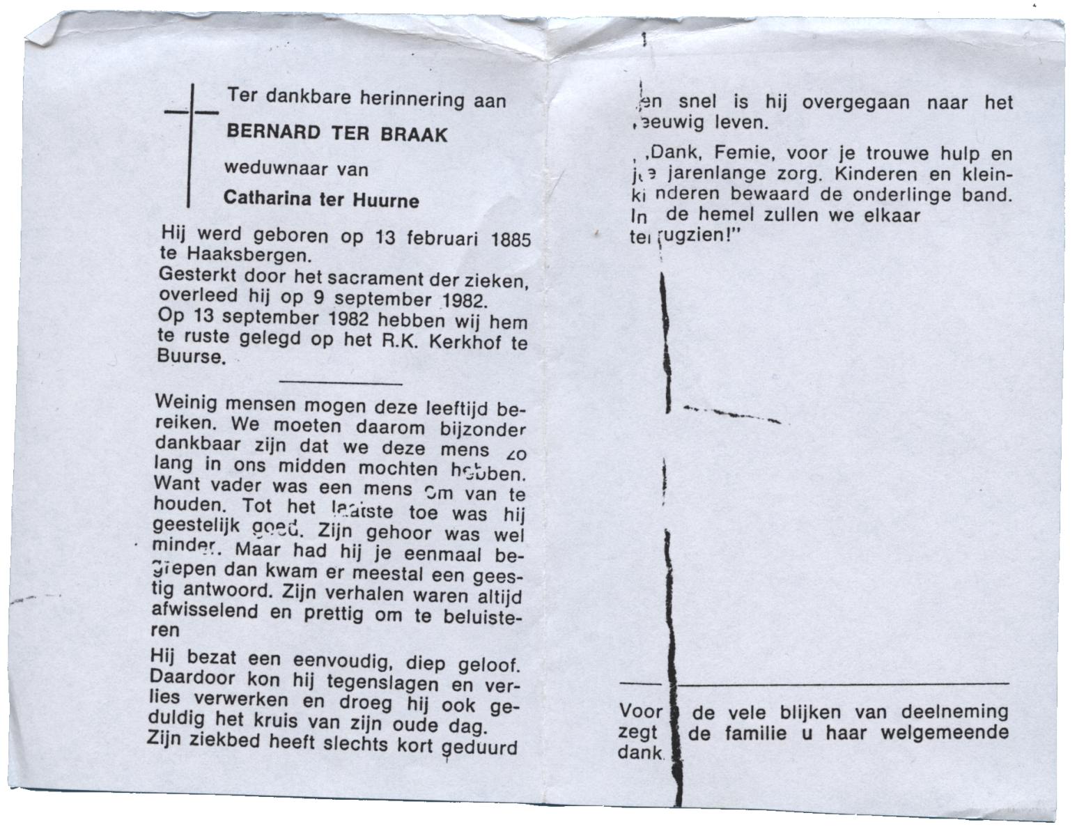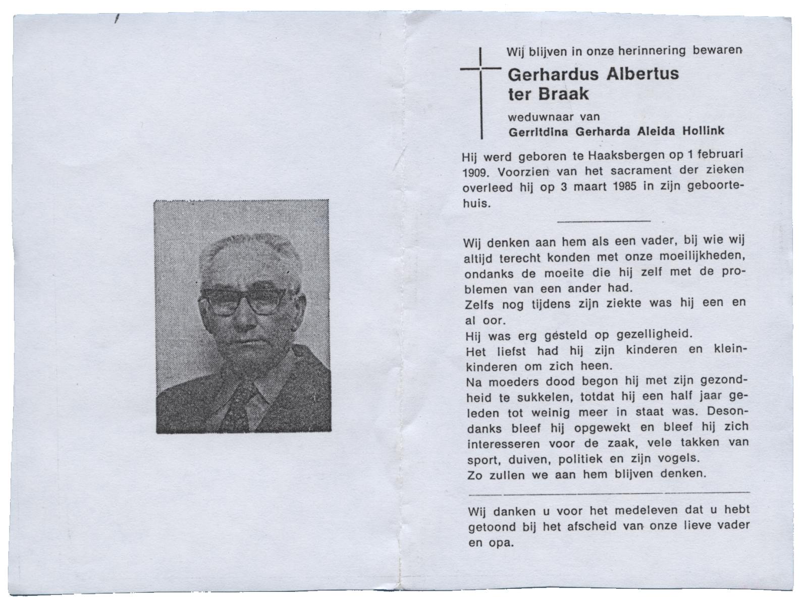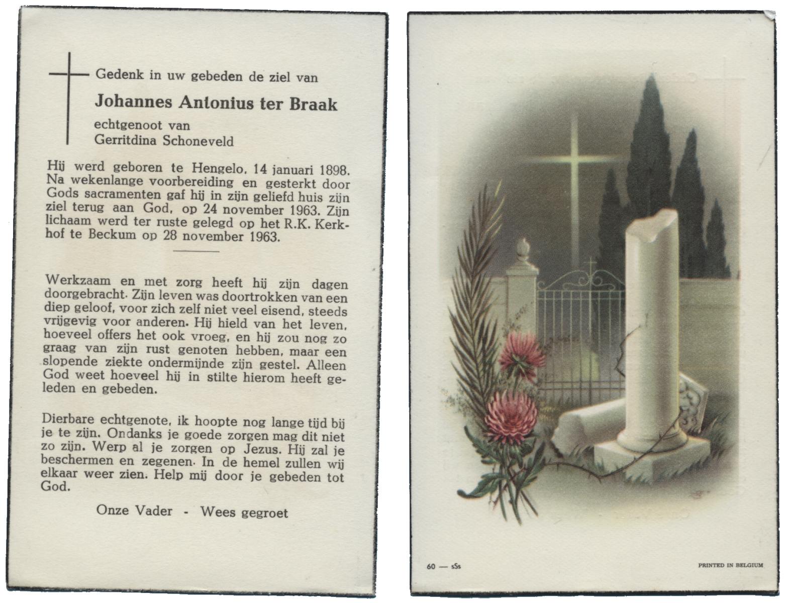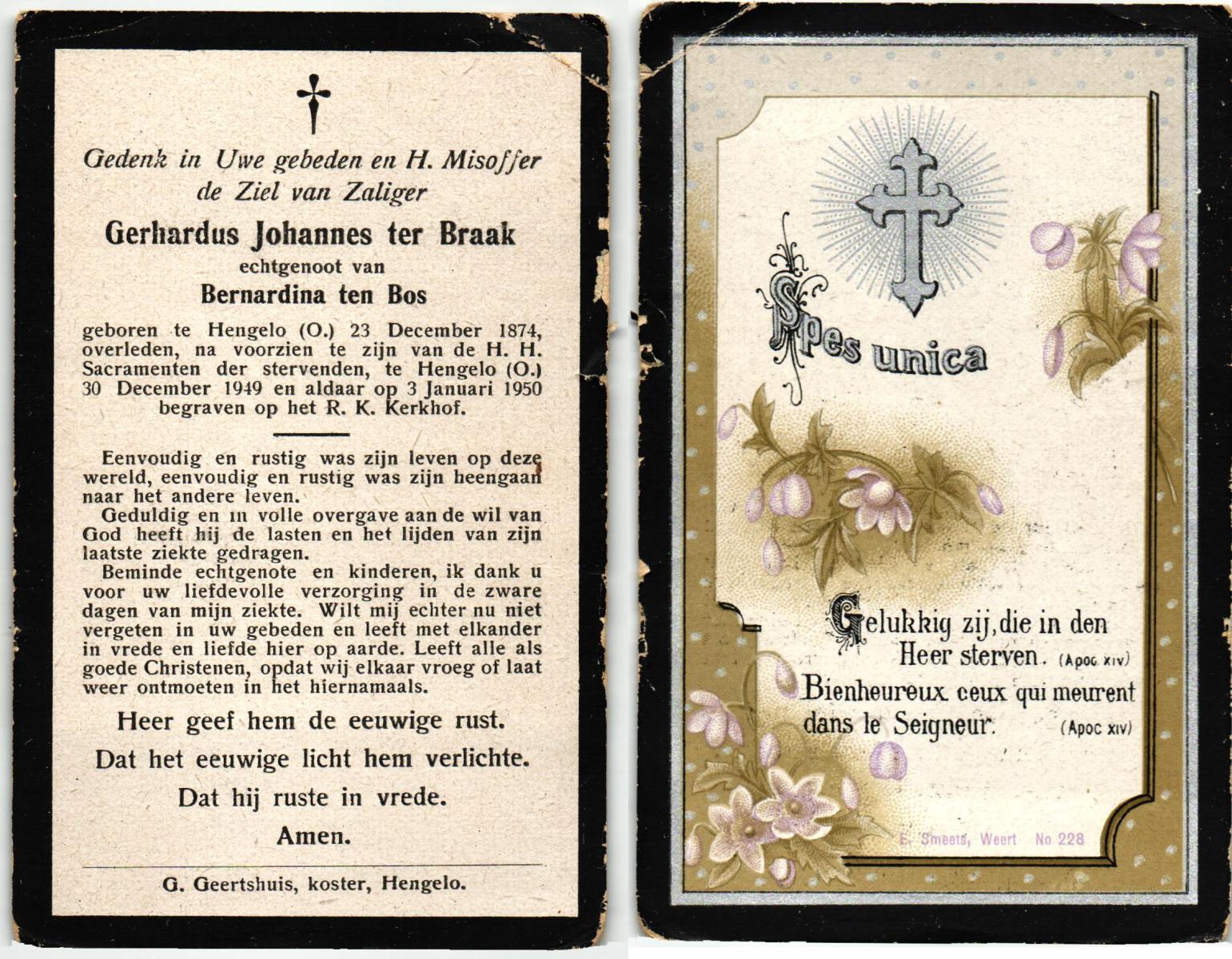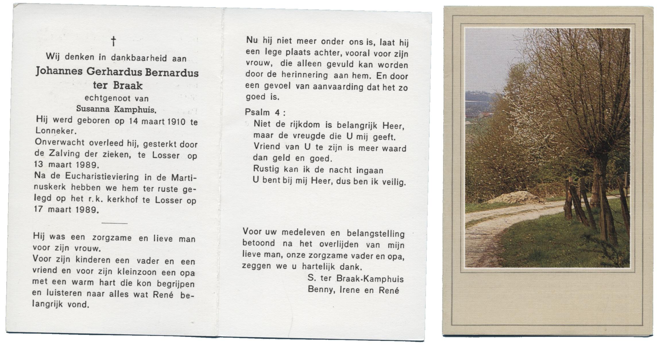 BRAAK, ter, Johannes Gerhardus Bernardus, geboren op 14-3-1910 te Lonneker, overleden op 13-3-1989 te Losser op 78-jarige leeftijd, begraven op 17-3-1989 te Losser.