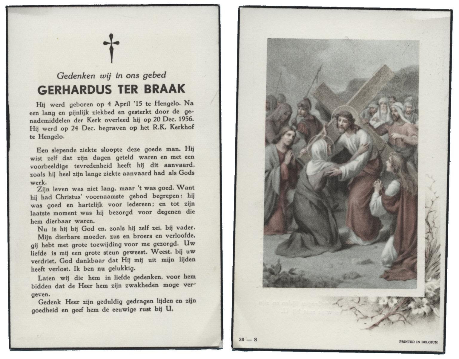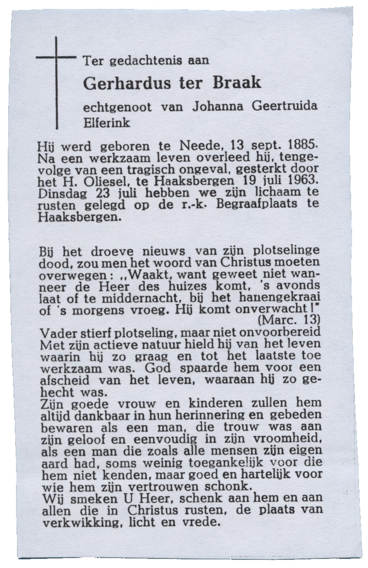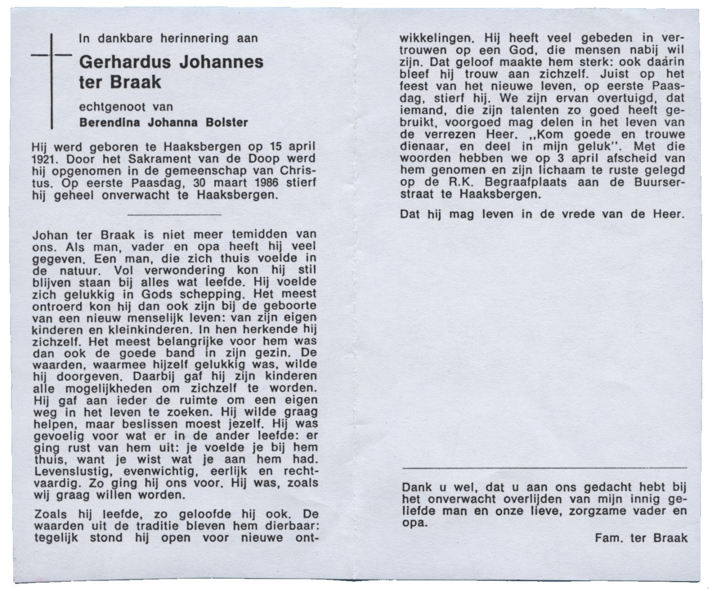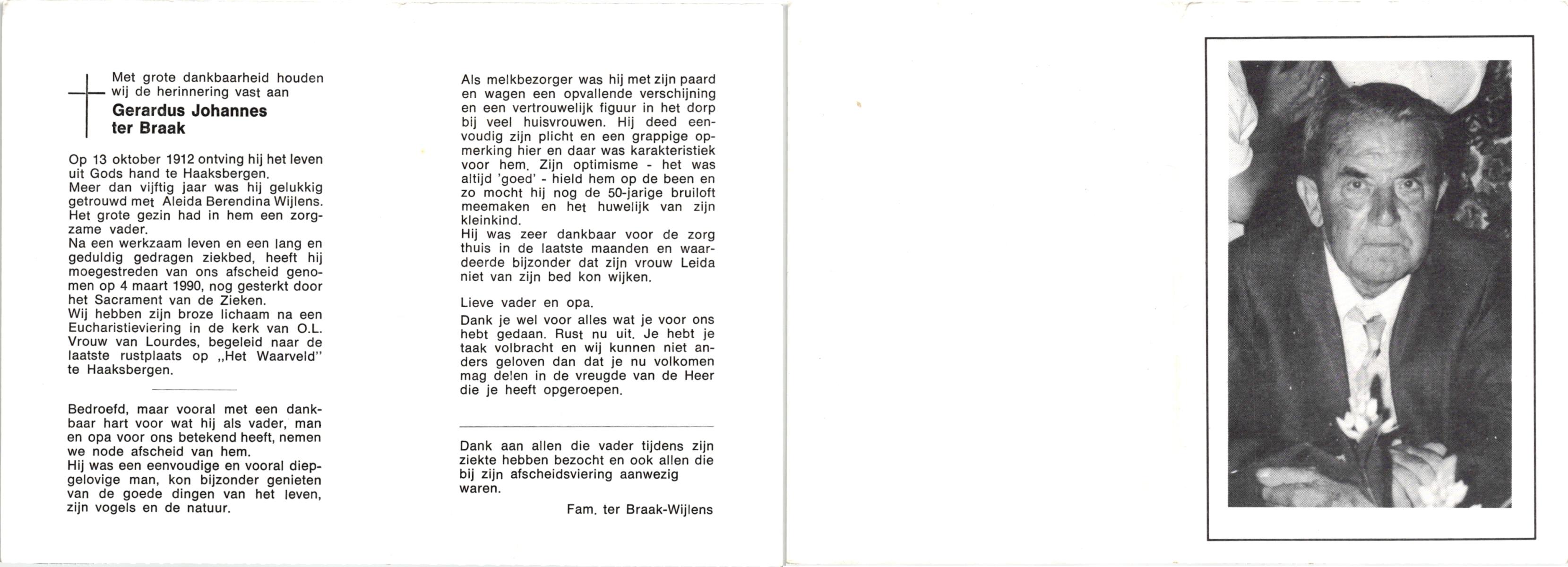 BRAAK, ter, Johannes Gerhardus Bernardus, geboren op 14-3-1910 te Lonneker, overleden op 13-3-1989 te Losser op 78-jarige leeftijd, begraven op 17-3-1989 te Losser.