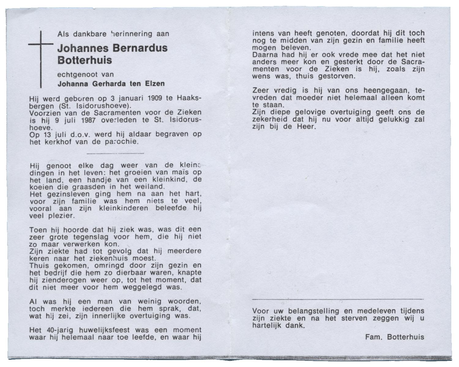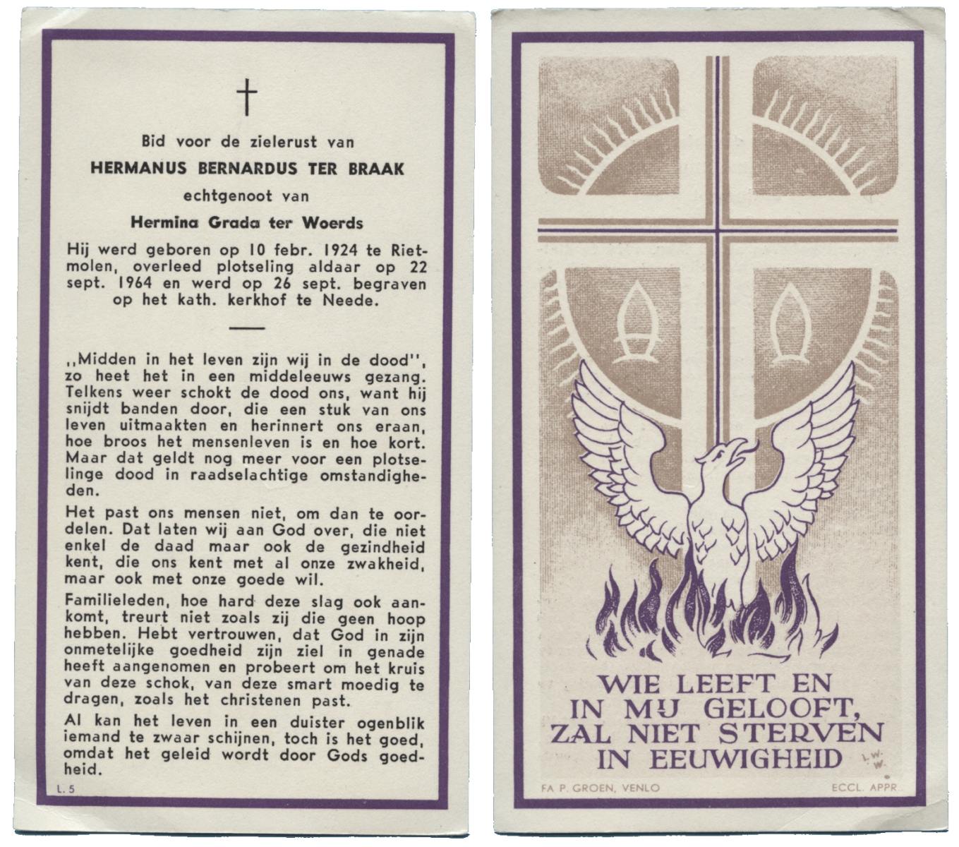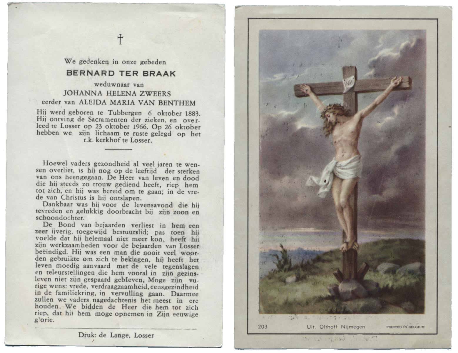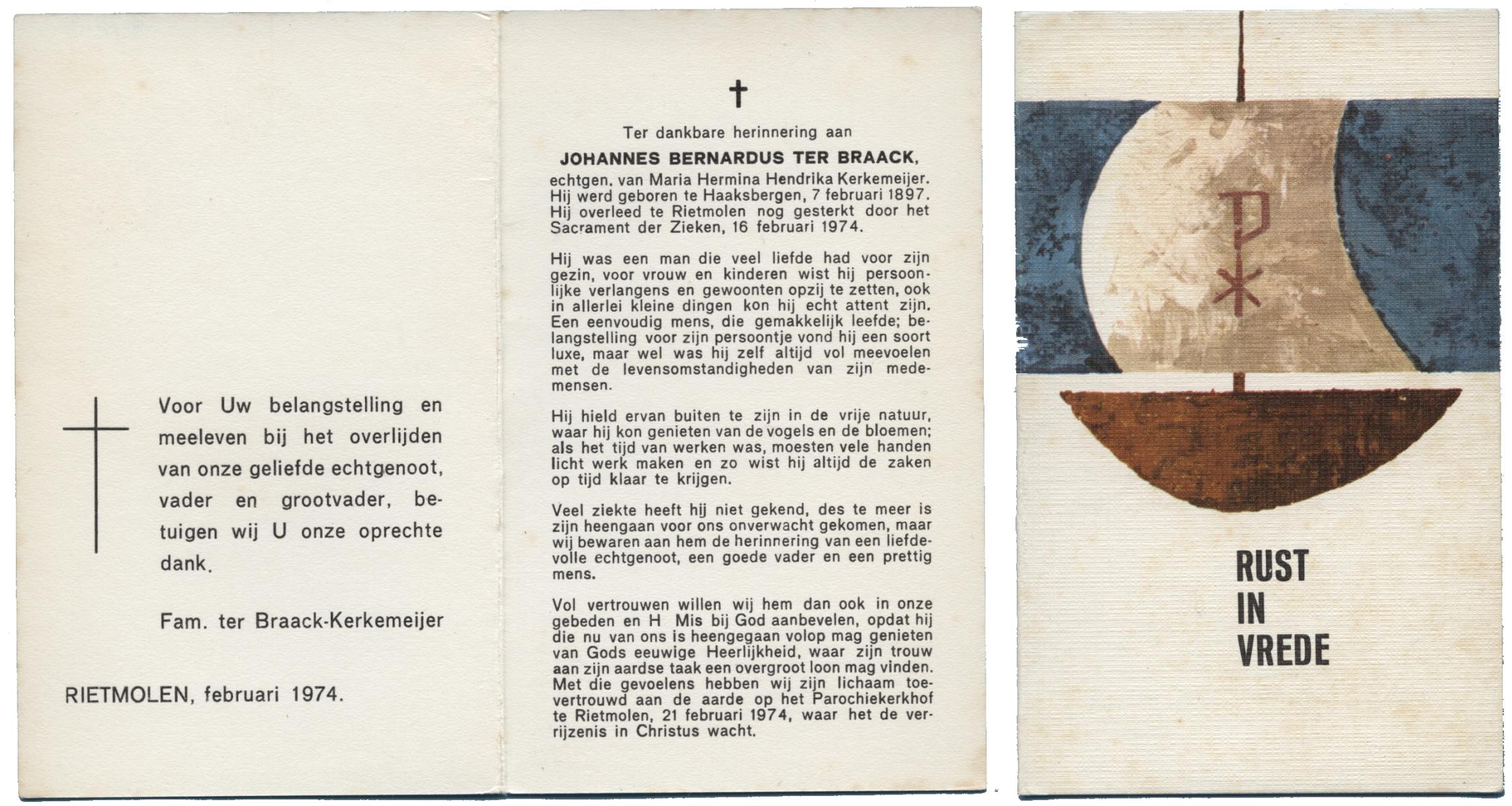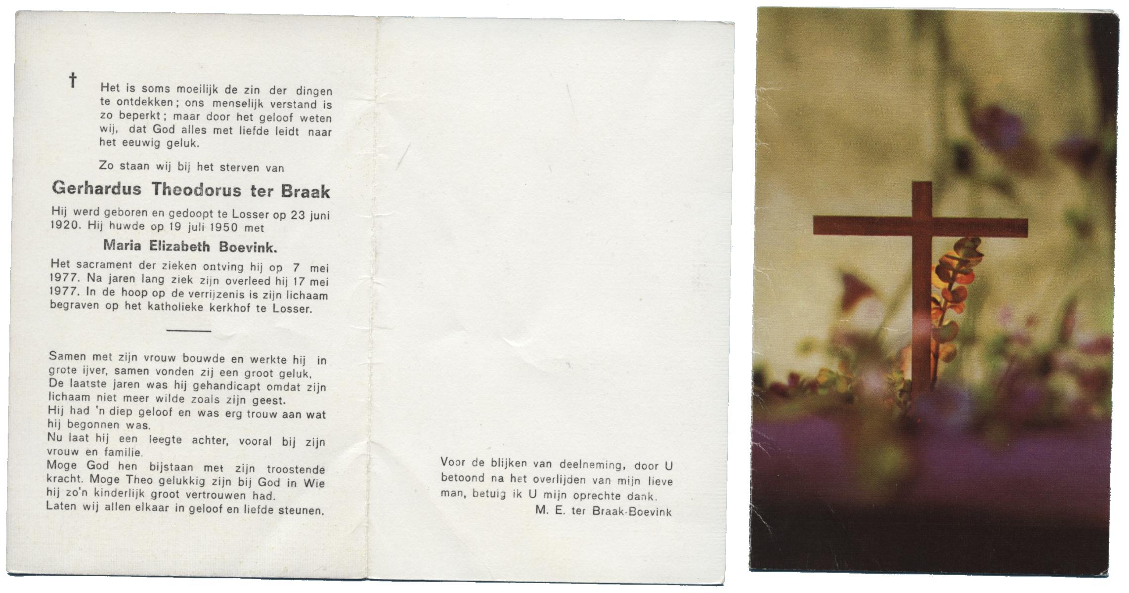 BRAAK, ter, Johannes Gerhardus Bernardus, geboren op 14-3-1910 te Lonneker, overleden op 13-3-1989 te Losser op 78-jarige leeftijd, begraven op 17-3-1989 te Losser.