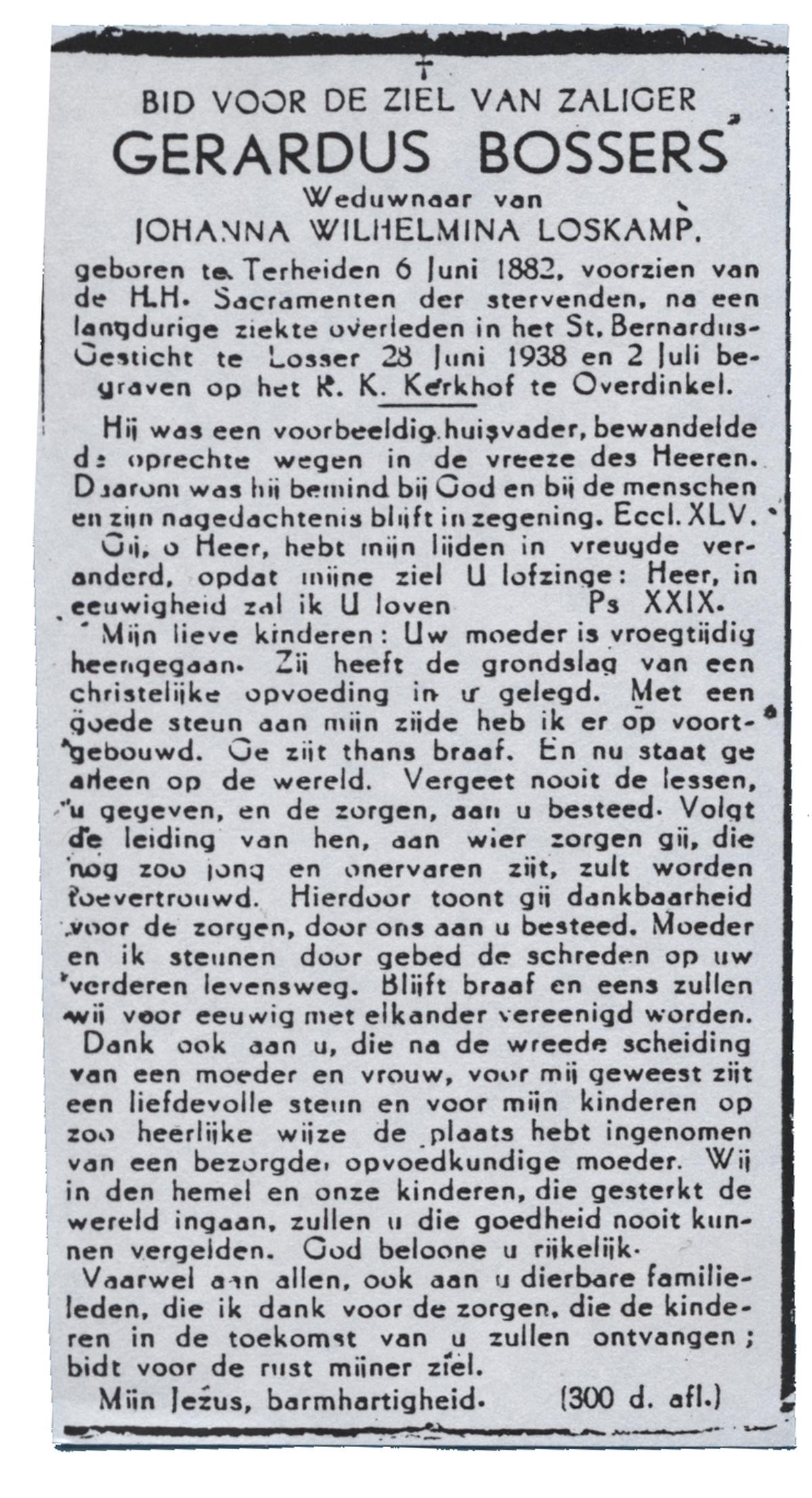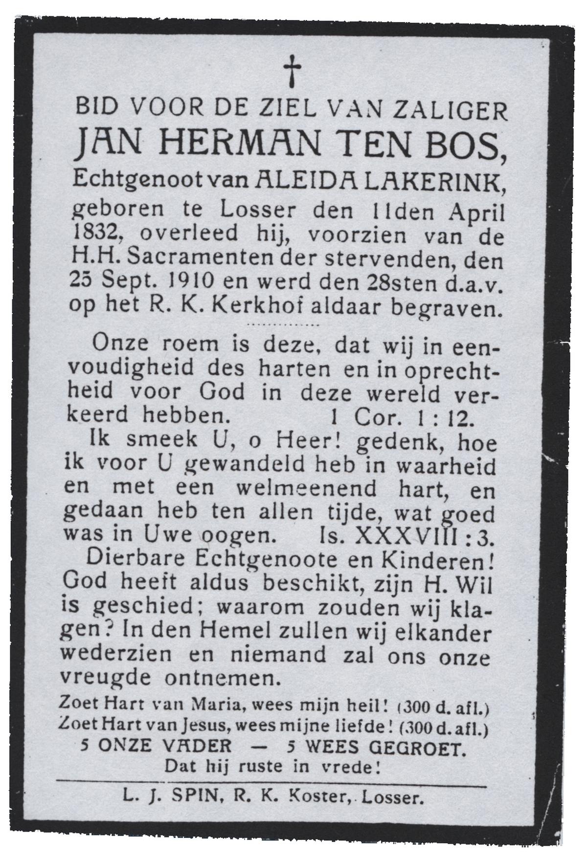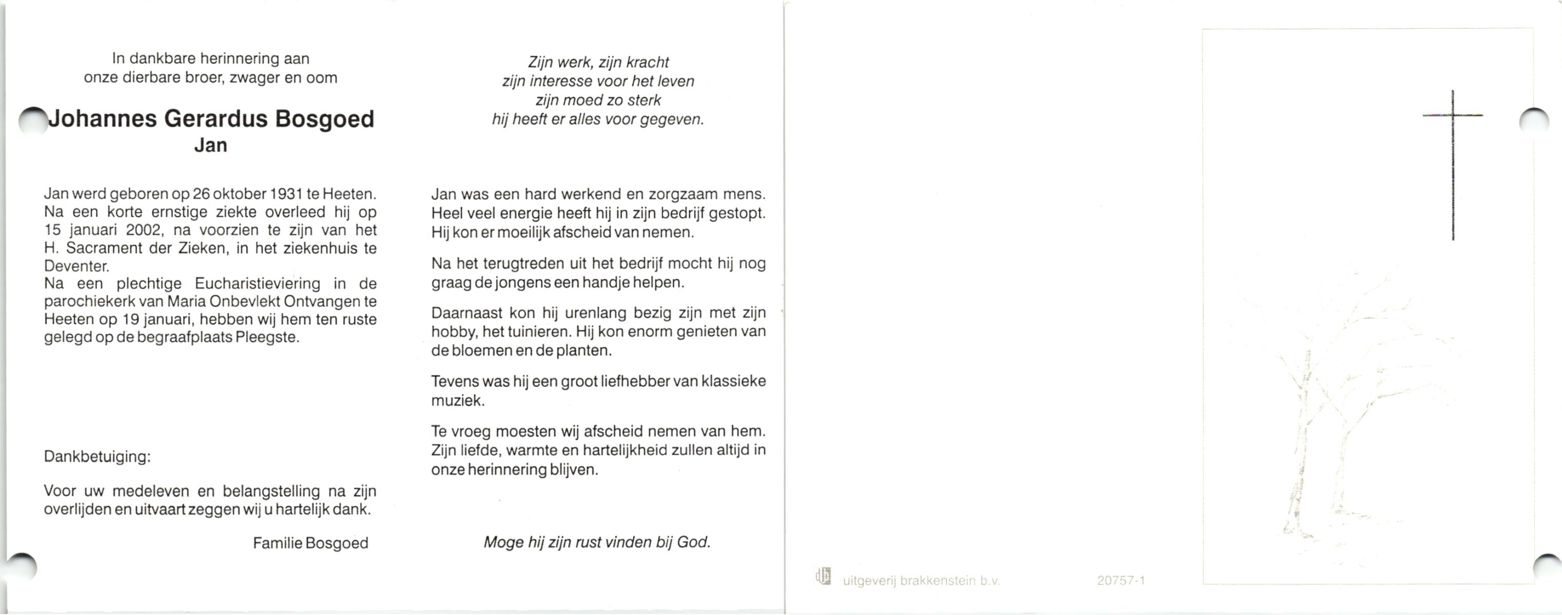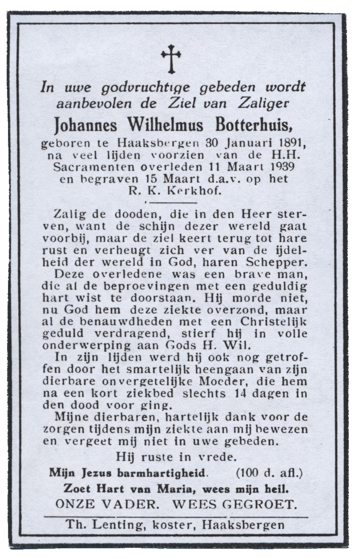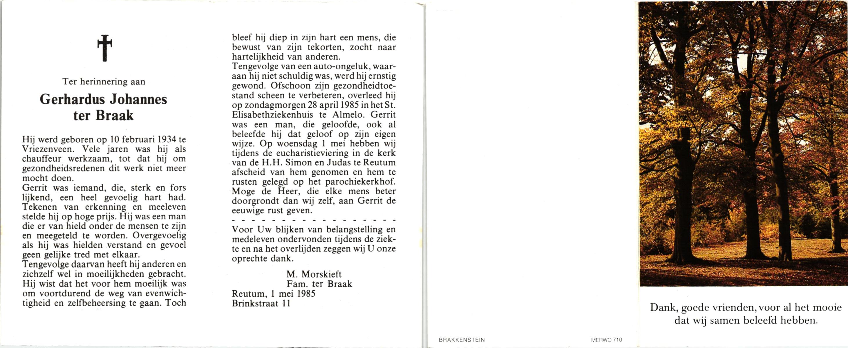 BRAAK, ter, Johannes Gerhardus Bernardus, geboren op 14-3-1910 te Lonneker, overleden op 13-3-1989 te Losser op 78-jarige leeftijd, begraven op 17-3-1989 te Losser.
