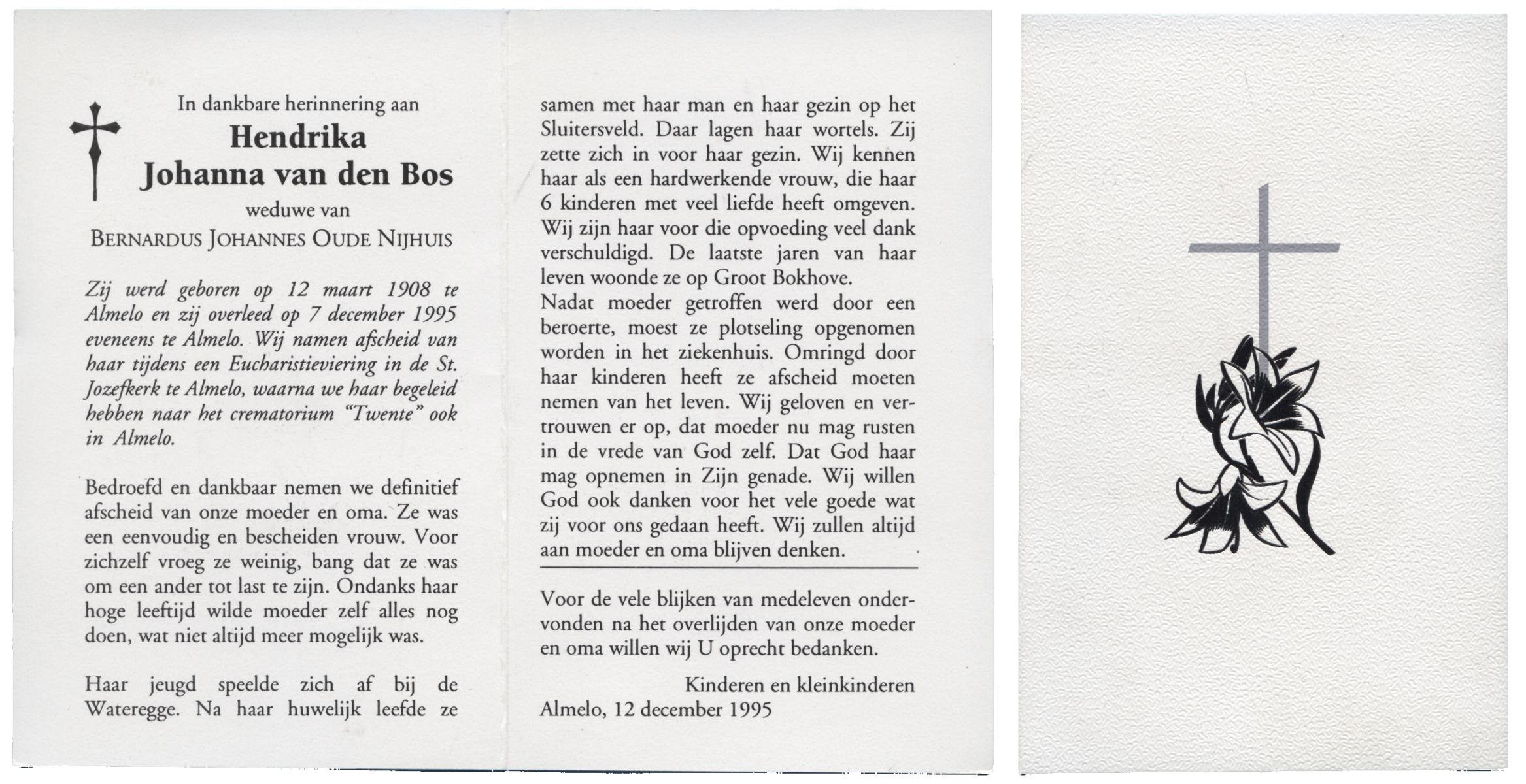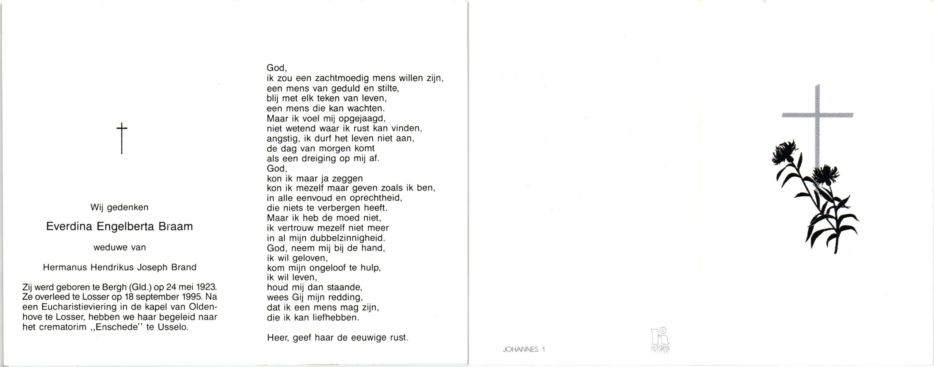 BRAAM, Everdina Engelbertha, geboren op 24-5-1923 te Bergh, Gld., overleden op 18-9-1995 te Losser op 72-jarige leeftijd, gecremeerd te Usselo.