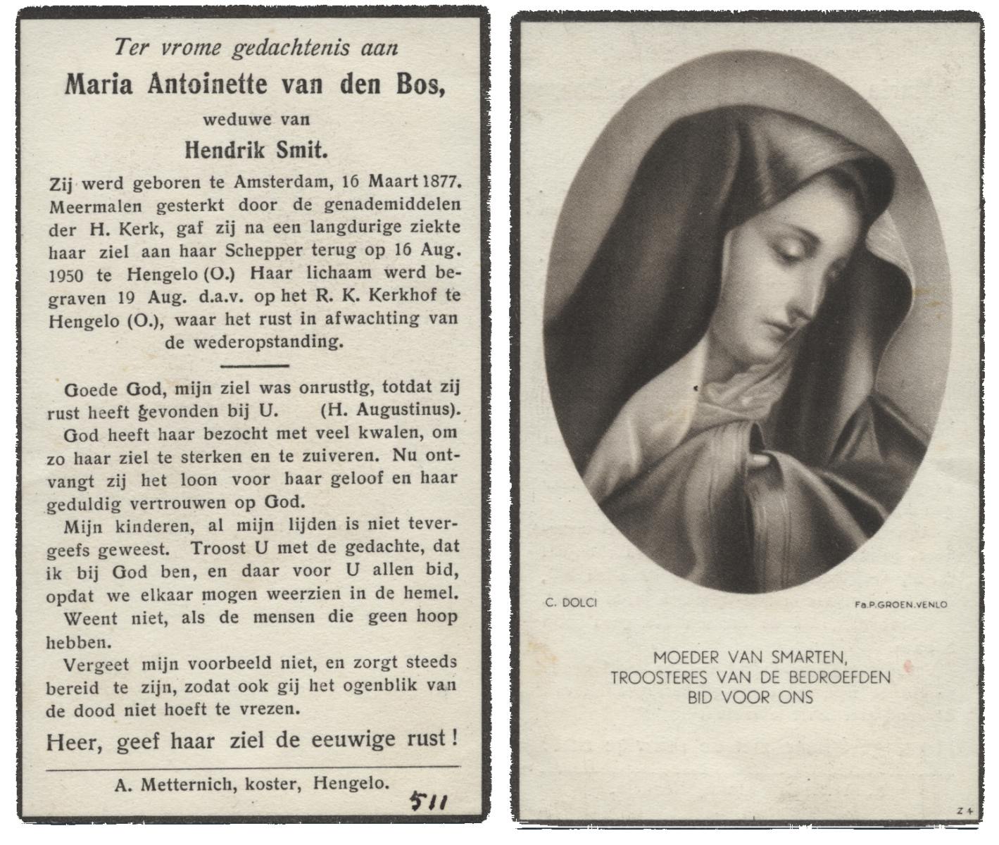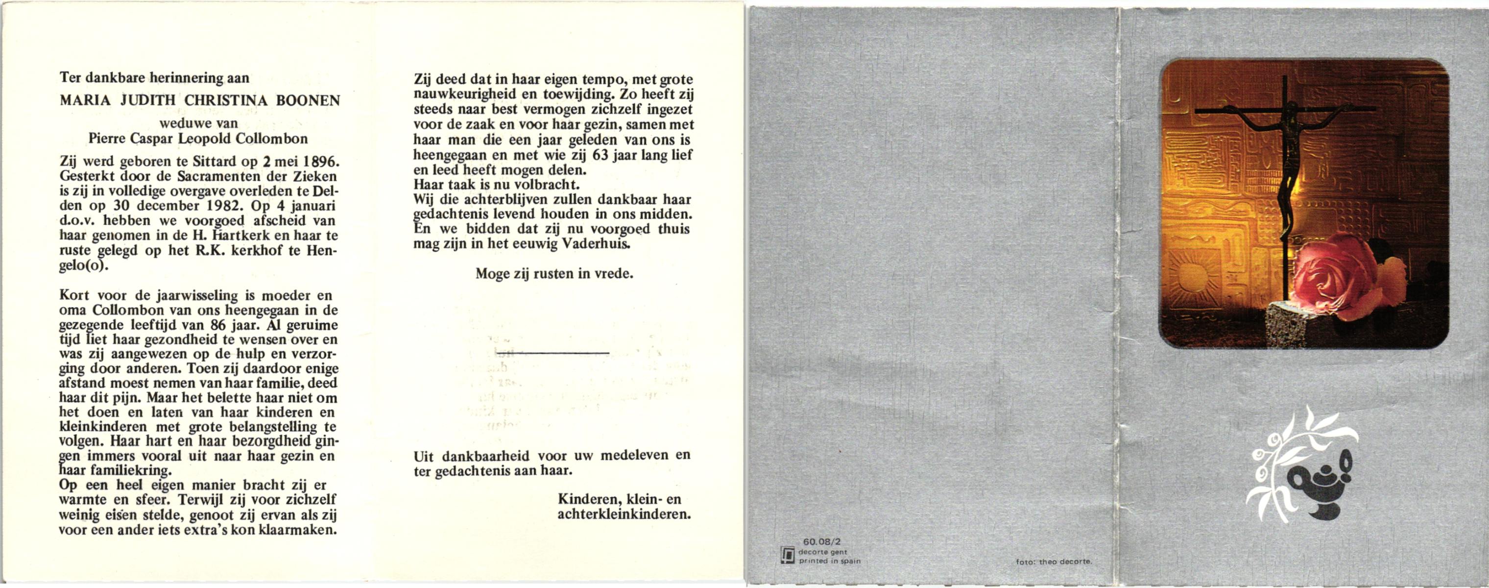 BOONEN, , Maria Judith Christina, geboren op 02-05-1896 te Sittard, overleden op 30-12-1982 te Hengelo (O) op 86-jarige leeftijd, begraven op 4-1-1983 te Hengelo.