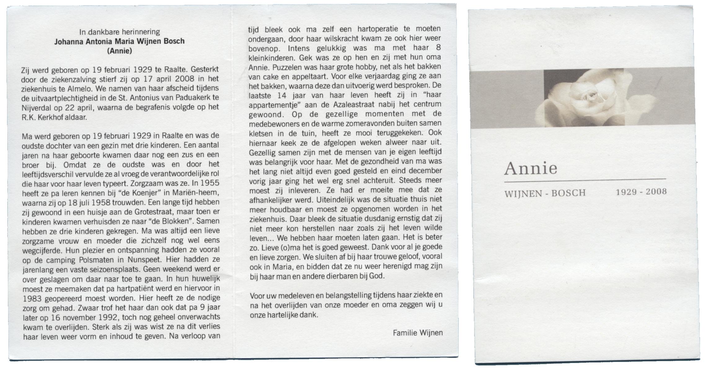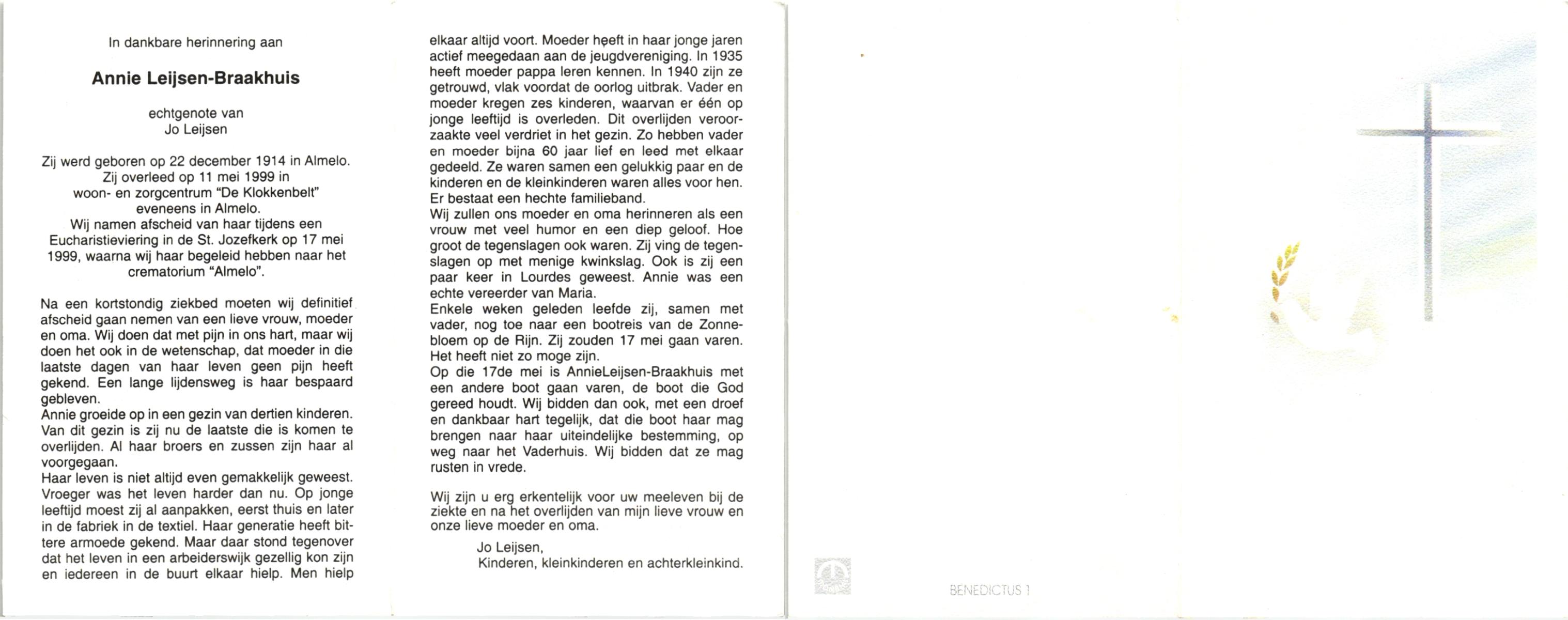 BRAAKHUIS, , Annie, geboren op 22-12-1914 te Almelo, overleden op 11-5-1999 te Almelo op 84-jarige leeftijd, gecremeerd op 17-5-1999 te Almelo.