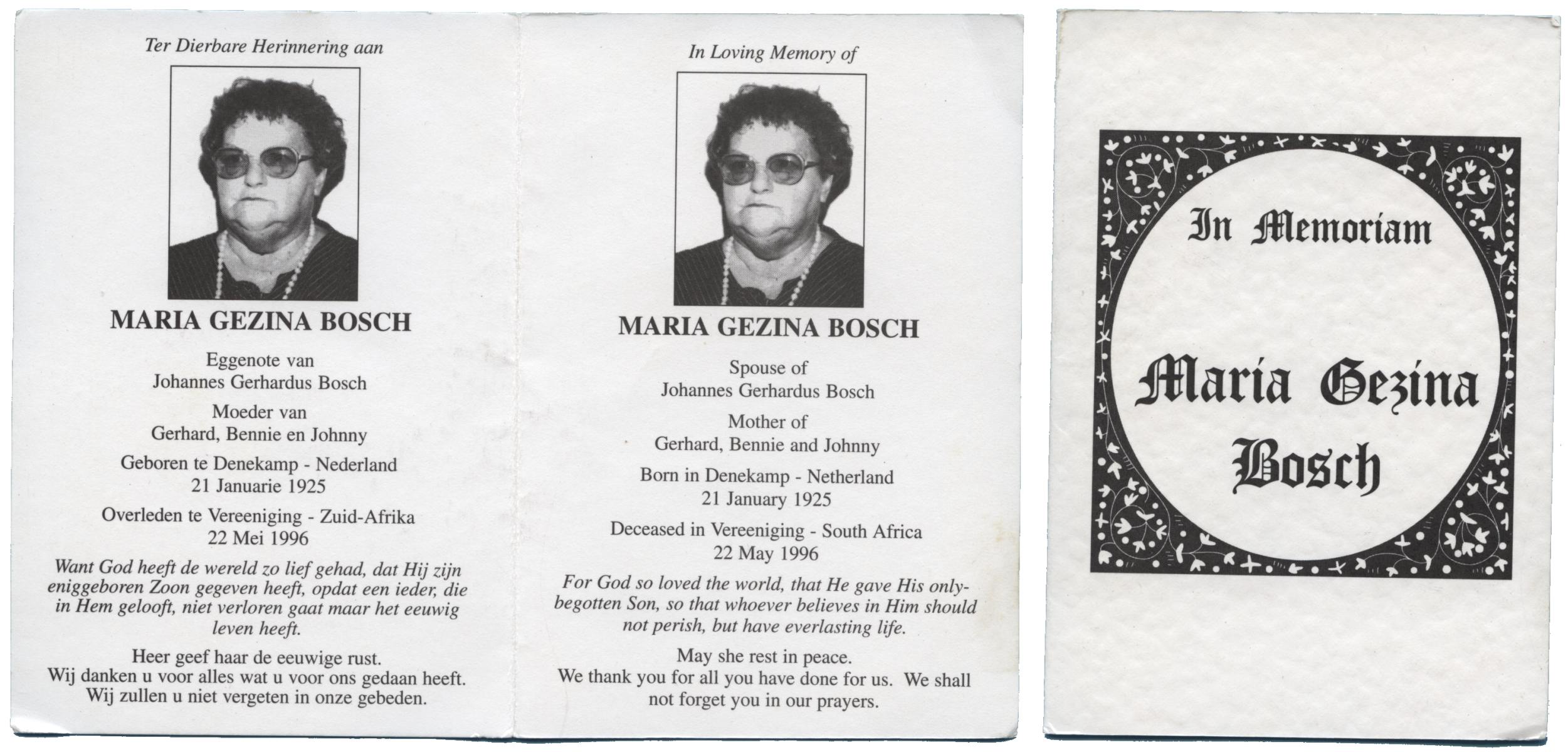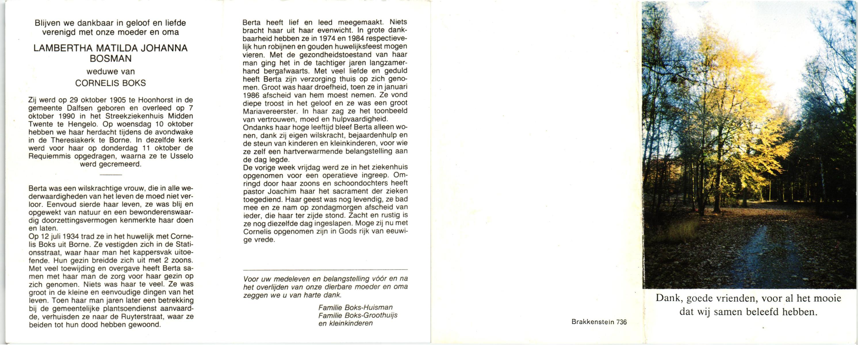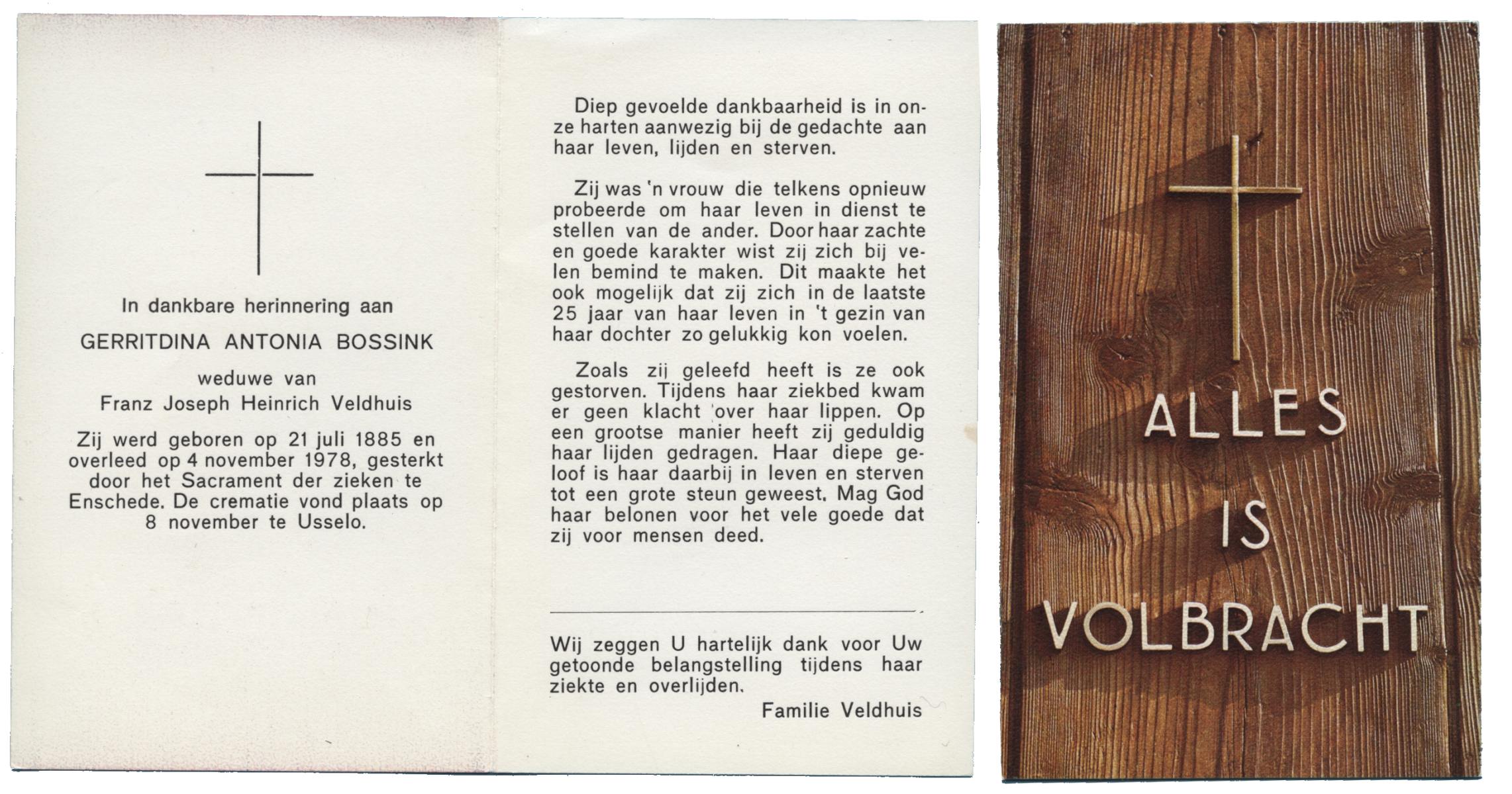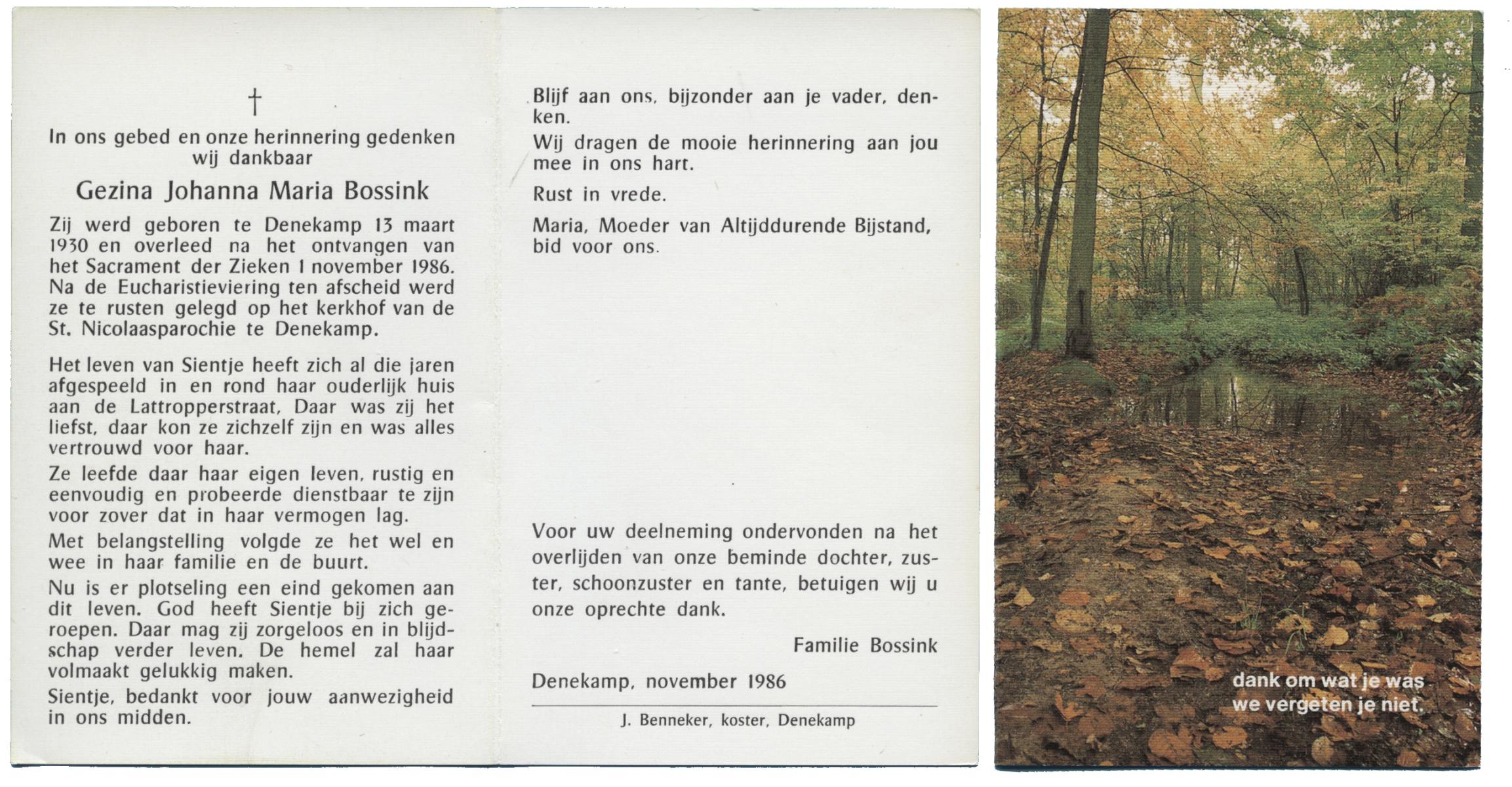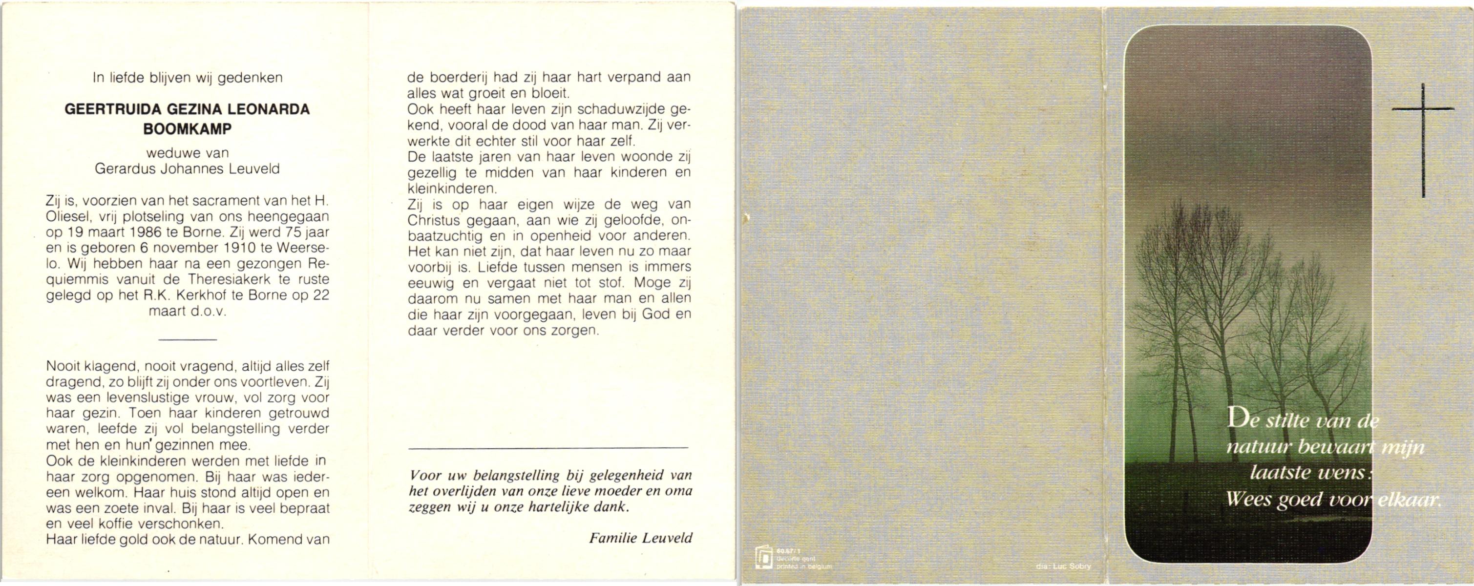BOOMKAMP, , Geertruida Gezina leonarda, geboren op 6-11-1910 te Weerselo, overleden op 19-3-1986 te Borne op 75-jarige leeftijd, begraven op 22-3-1986 te Borne.