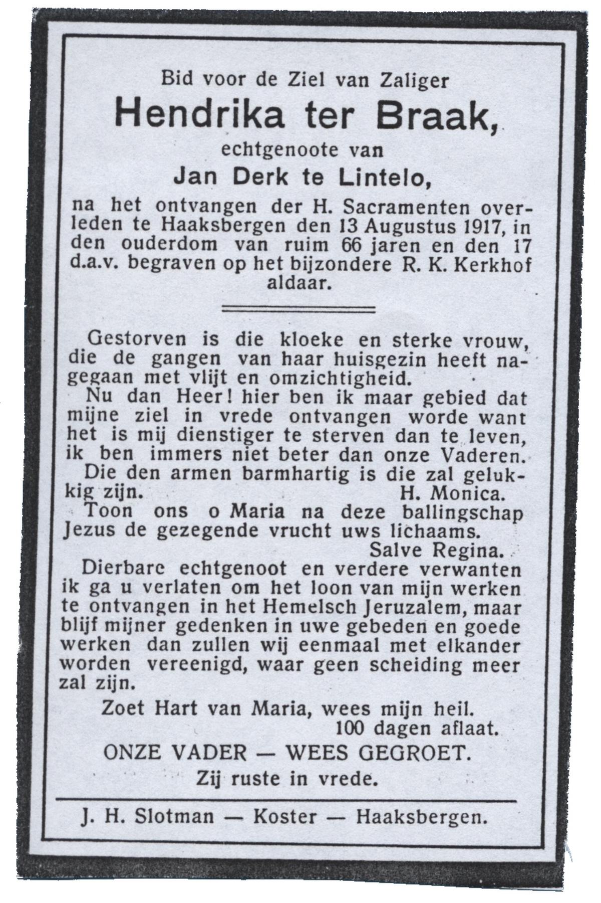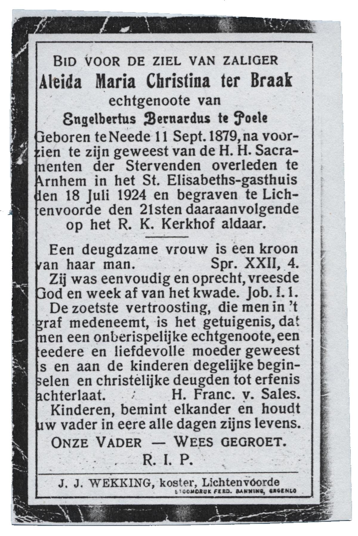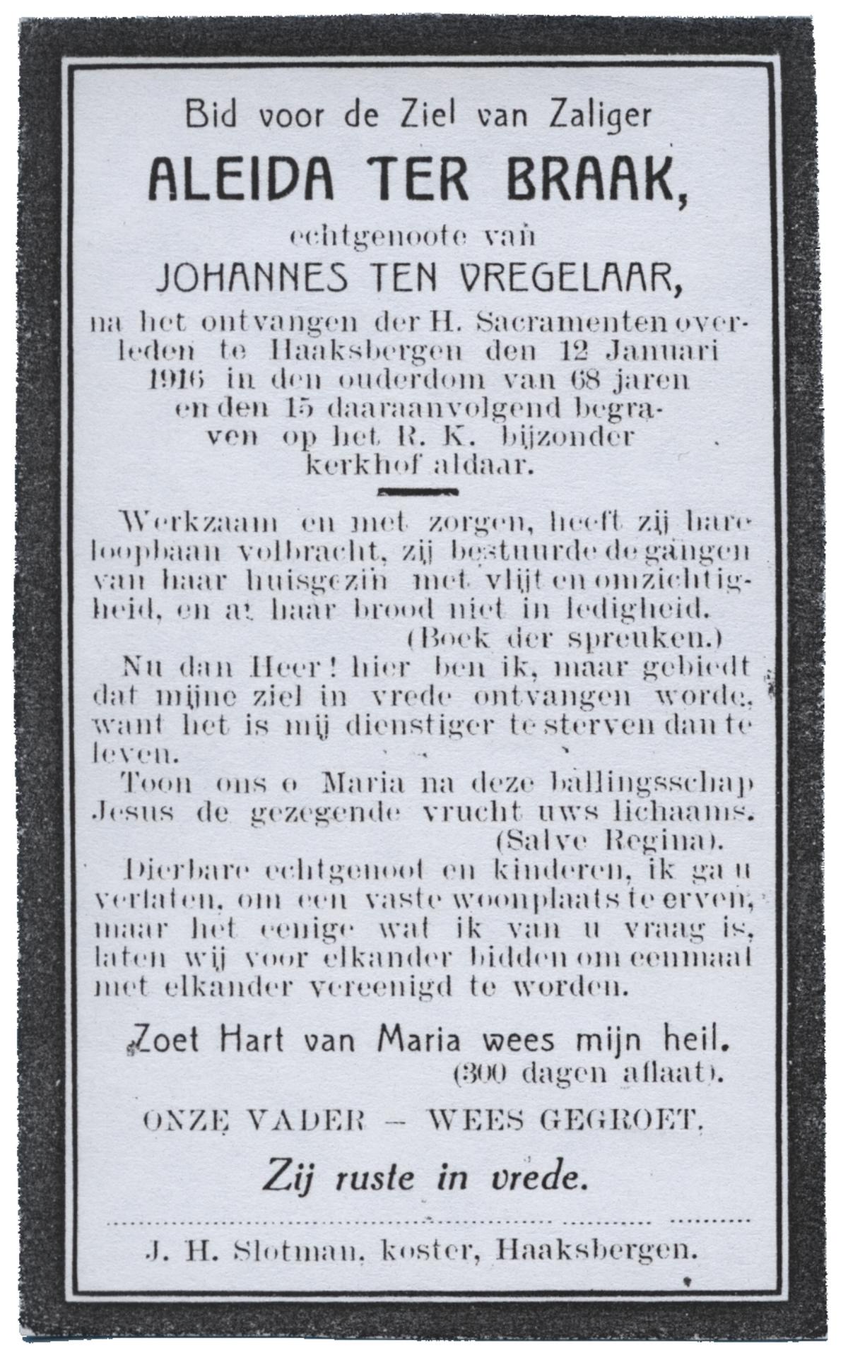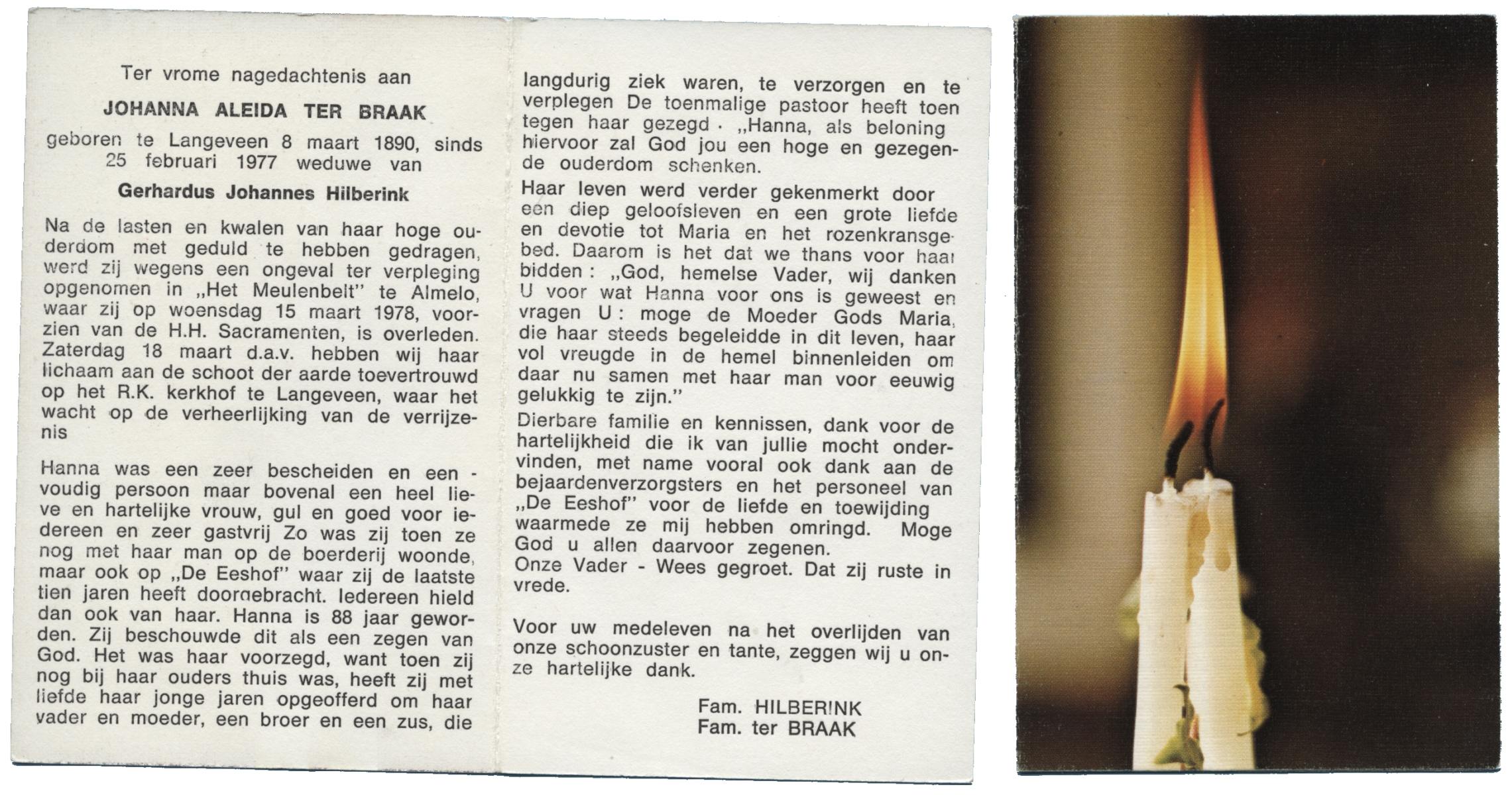 BRAAK, Ter, Johanna Aleida, geboren op 08-03-1890 te Langeveen, overleden op 15-3-1978 te Almelo op 88-jarige leeftijd, begraven op 18-3-1978 te Langeveen.