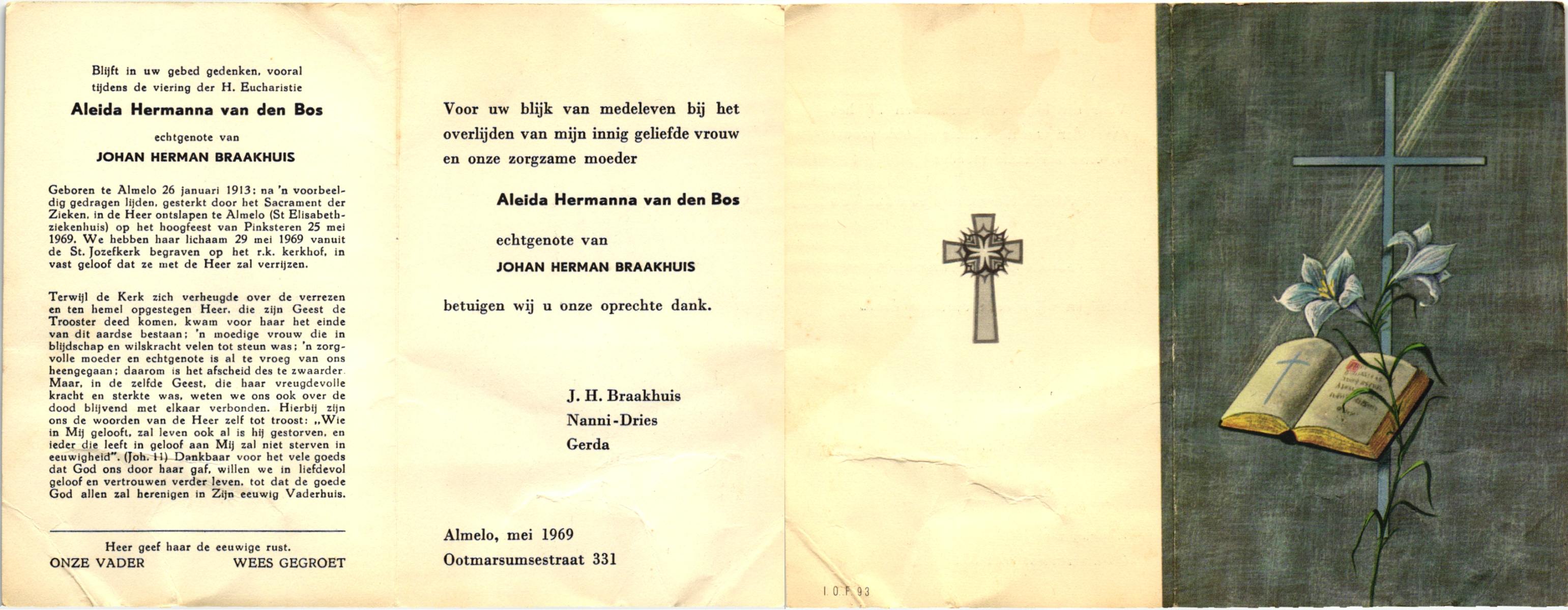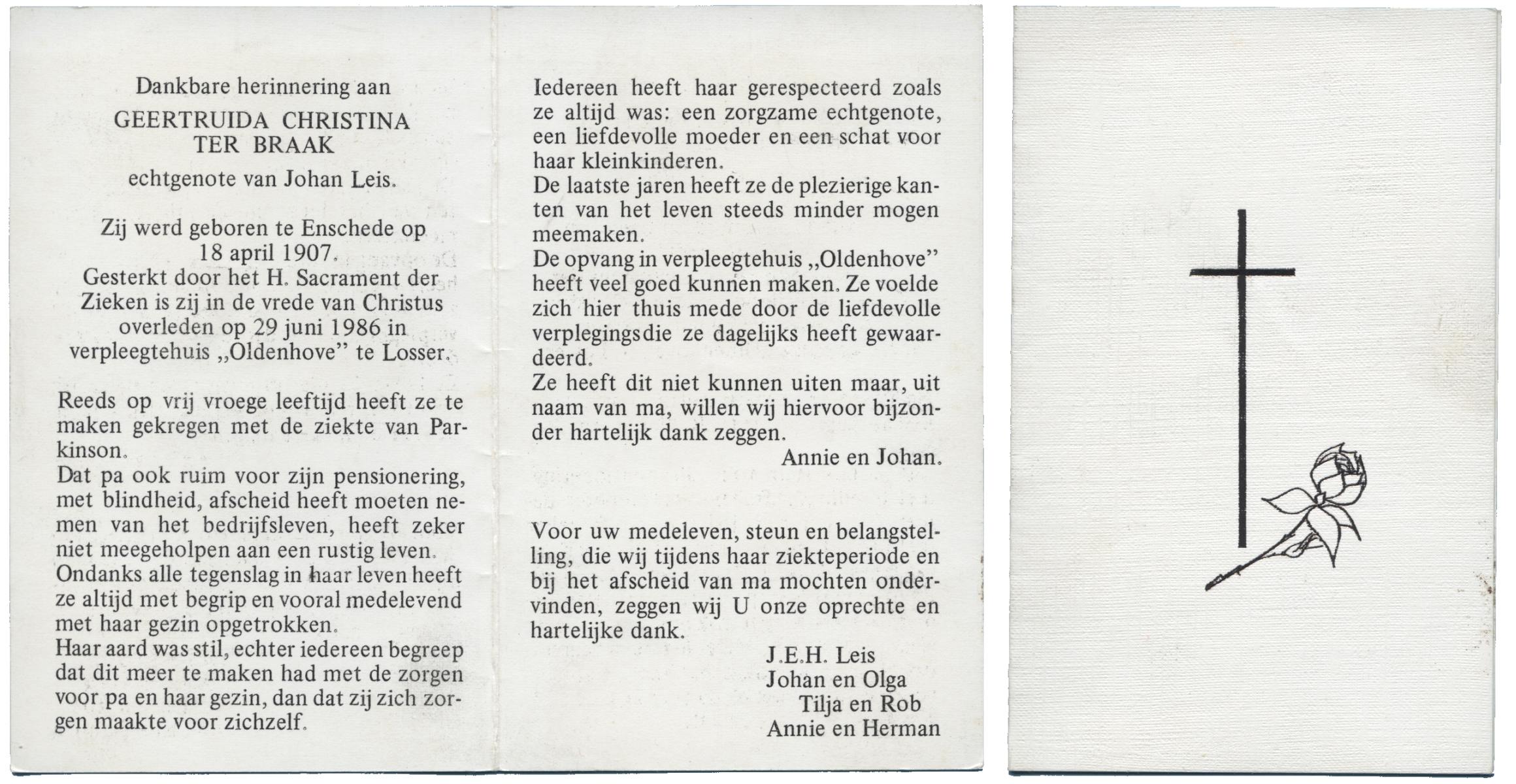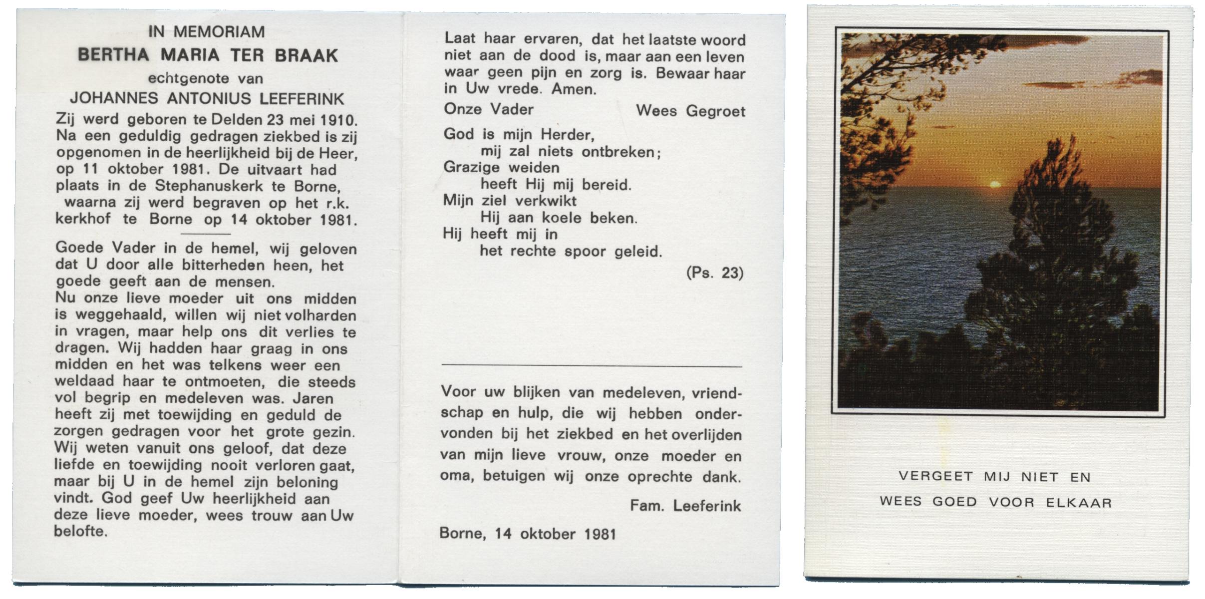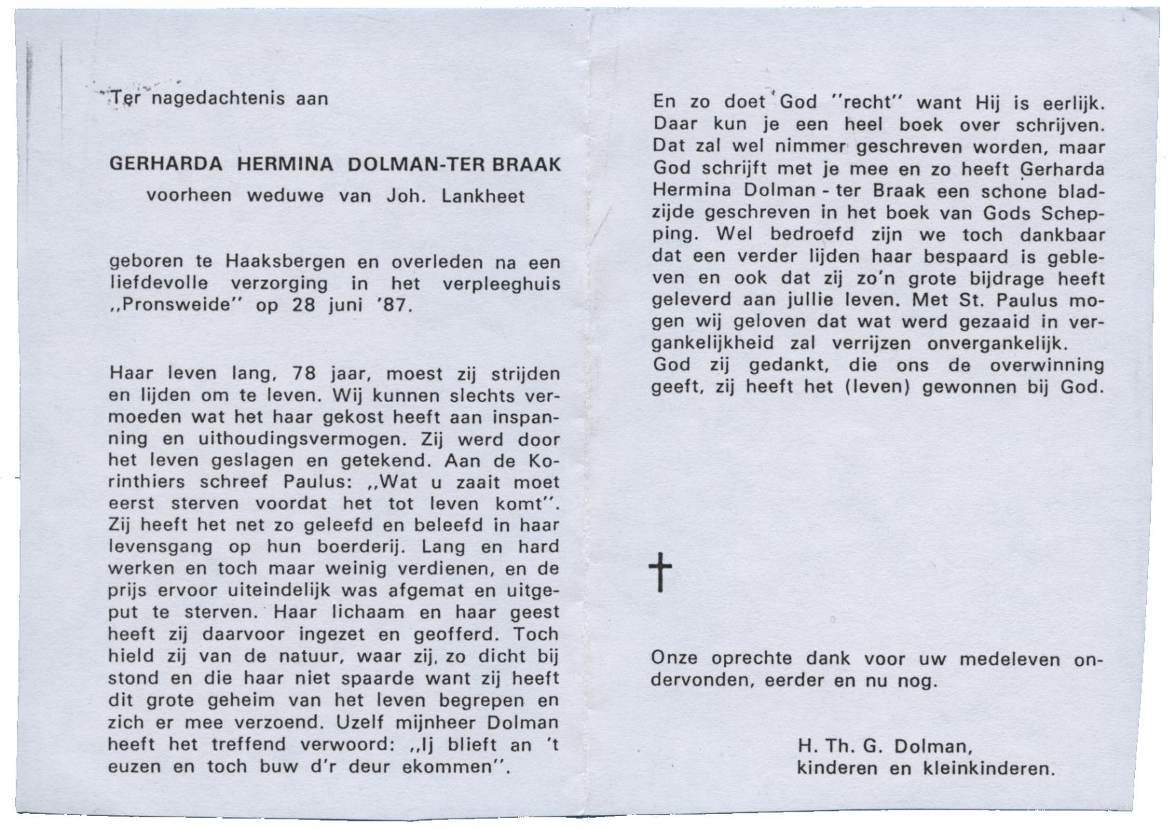 BRAAK, Ter, Johanna Aleida, geboren op 08-03-1890 te Langeveen, overleden op 15-3-1978 te Almelo op 88-jarige leeftijd, begraven op 18-3-1978 te Langeveen.