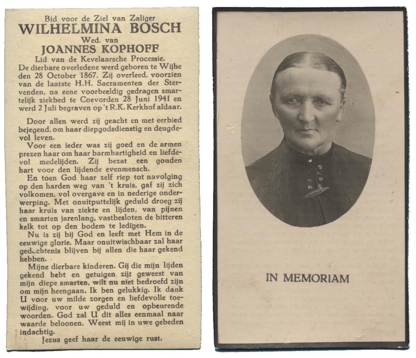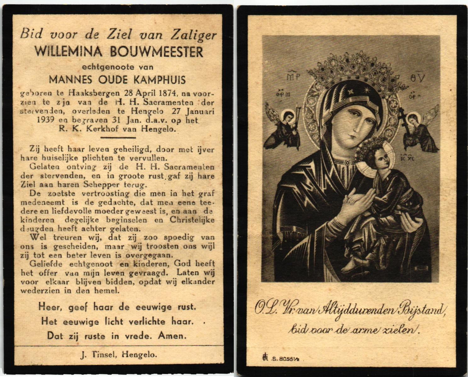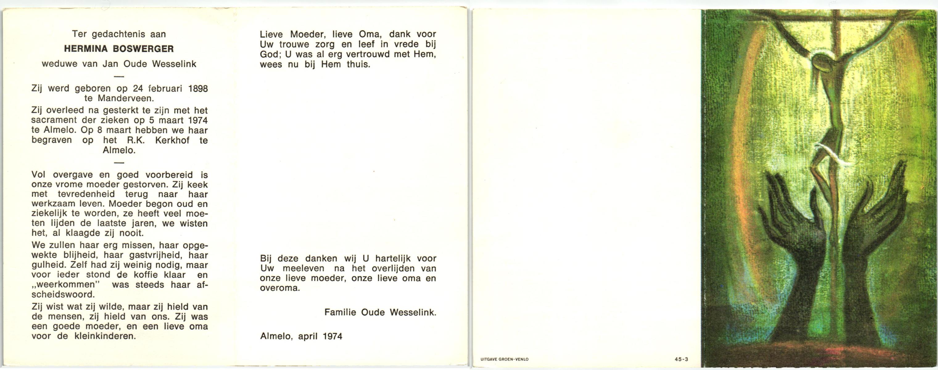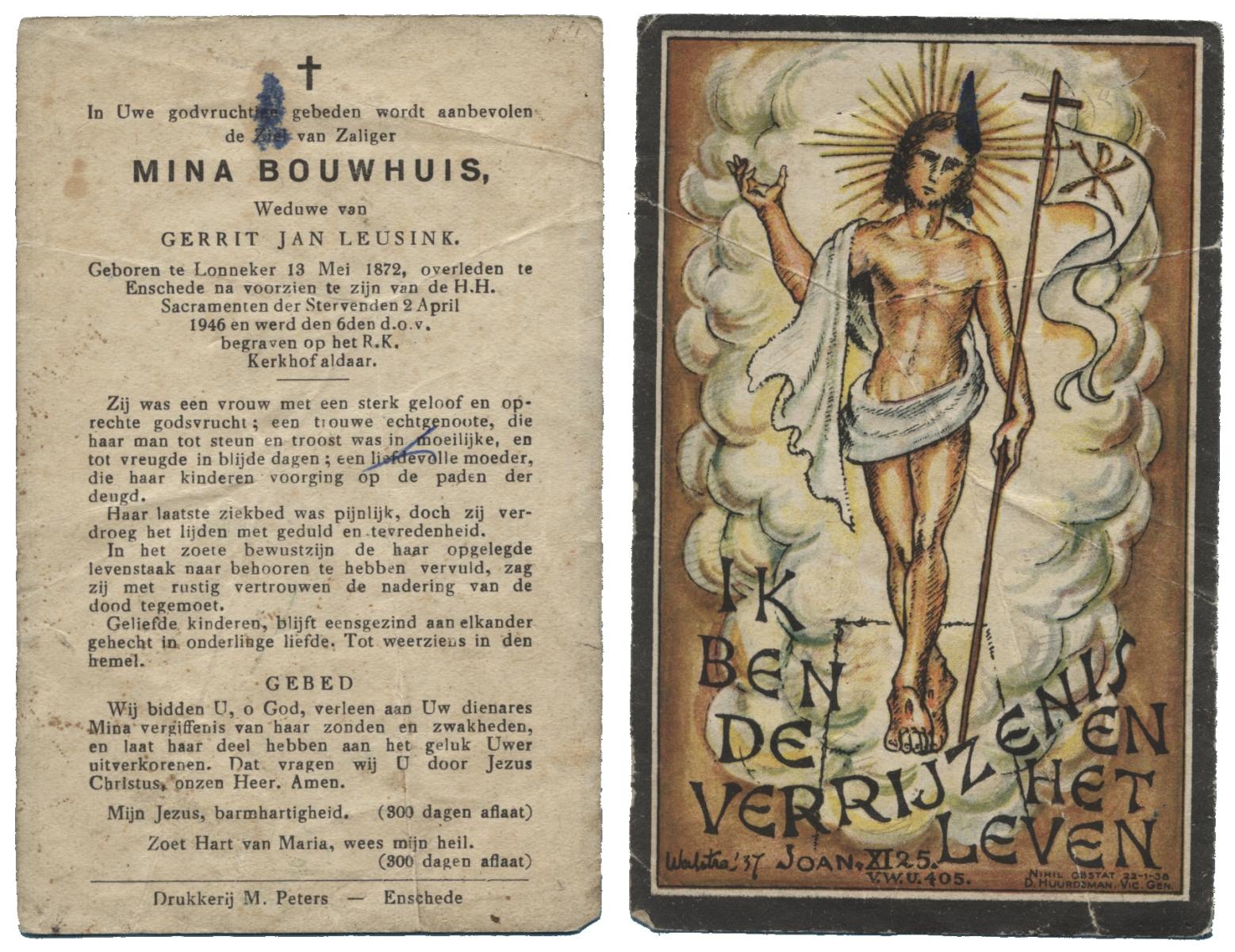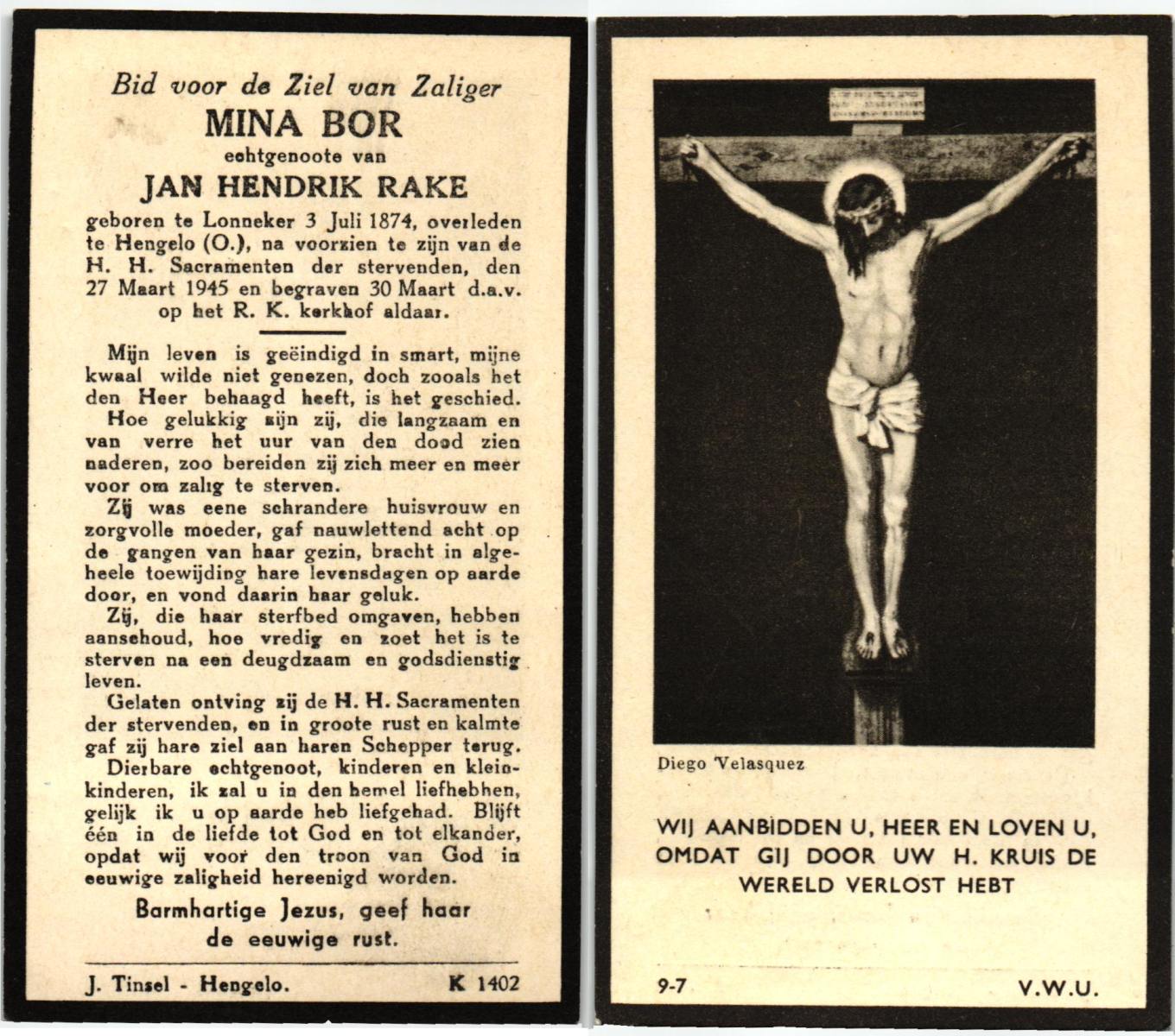 BOR, Mina, geboren op 03-07-1874 te Lonneker, overleden op 27-3-1945 te Hengelo op 70-jarige leeftijd, begraven op 30-3-1945 te Hengelo.