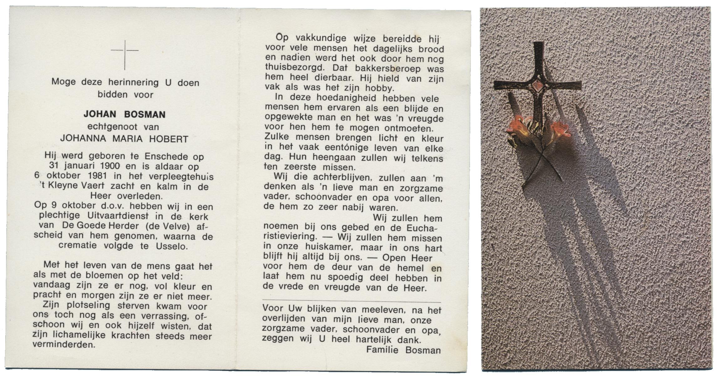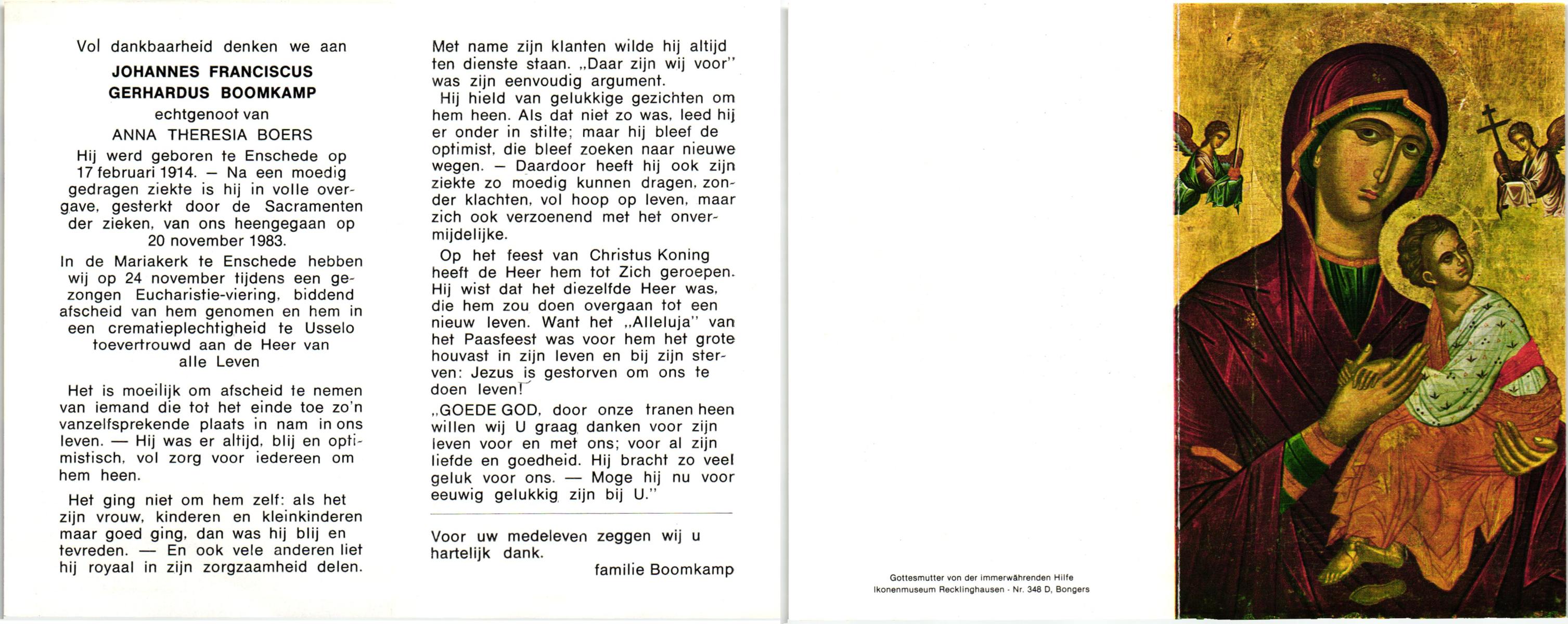 BOOMKAMP, Johannes Franciscus Gerhardus, geboren op 17-2-1914 te Enschede, overleden op 20-11-1983 op 69-jarige leeftijd, gecremeerd op 24-11-1983 te Usselo.
