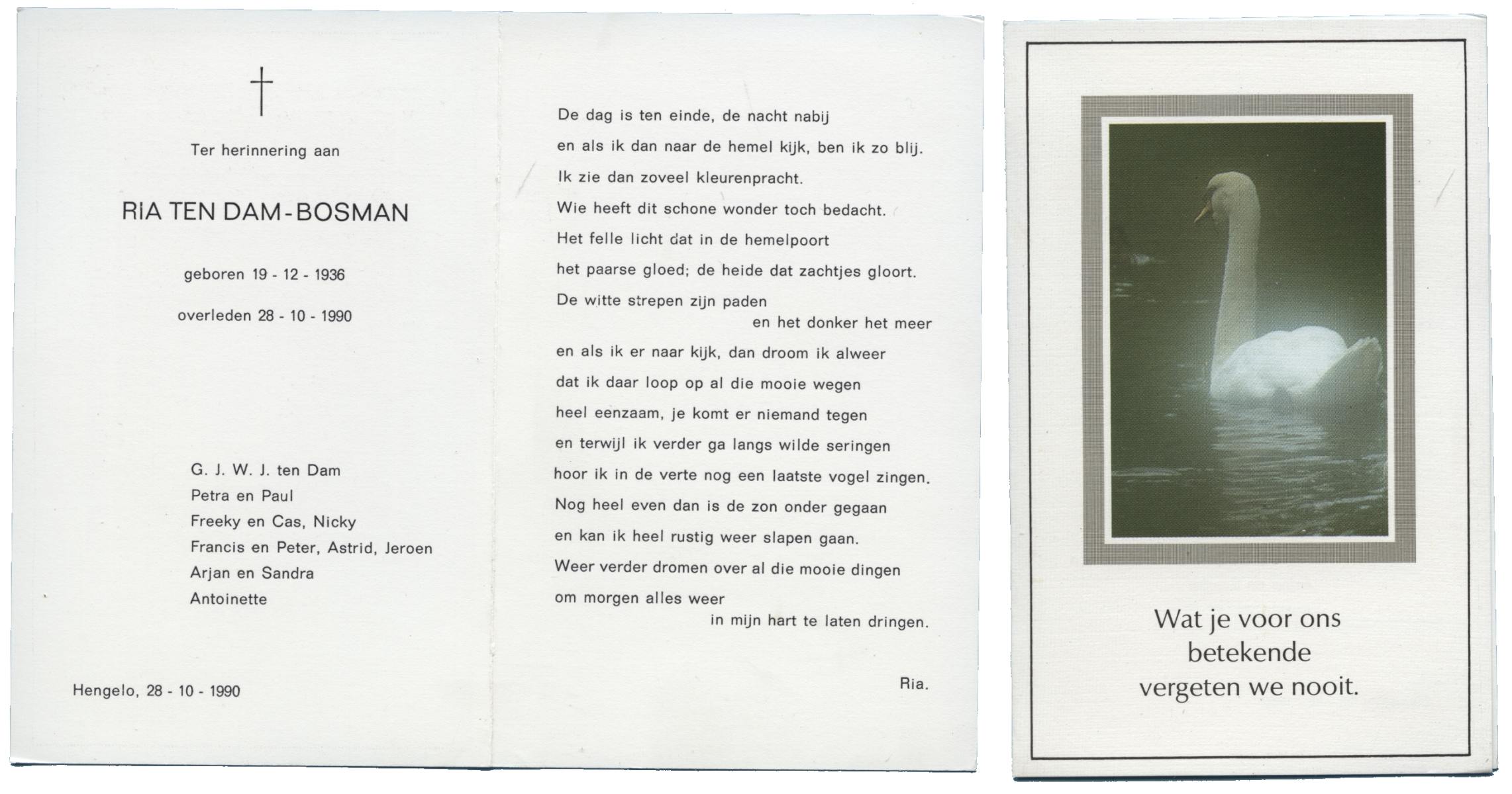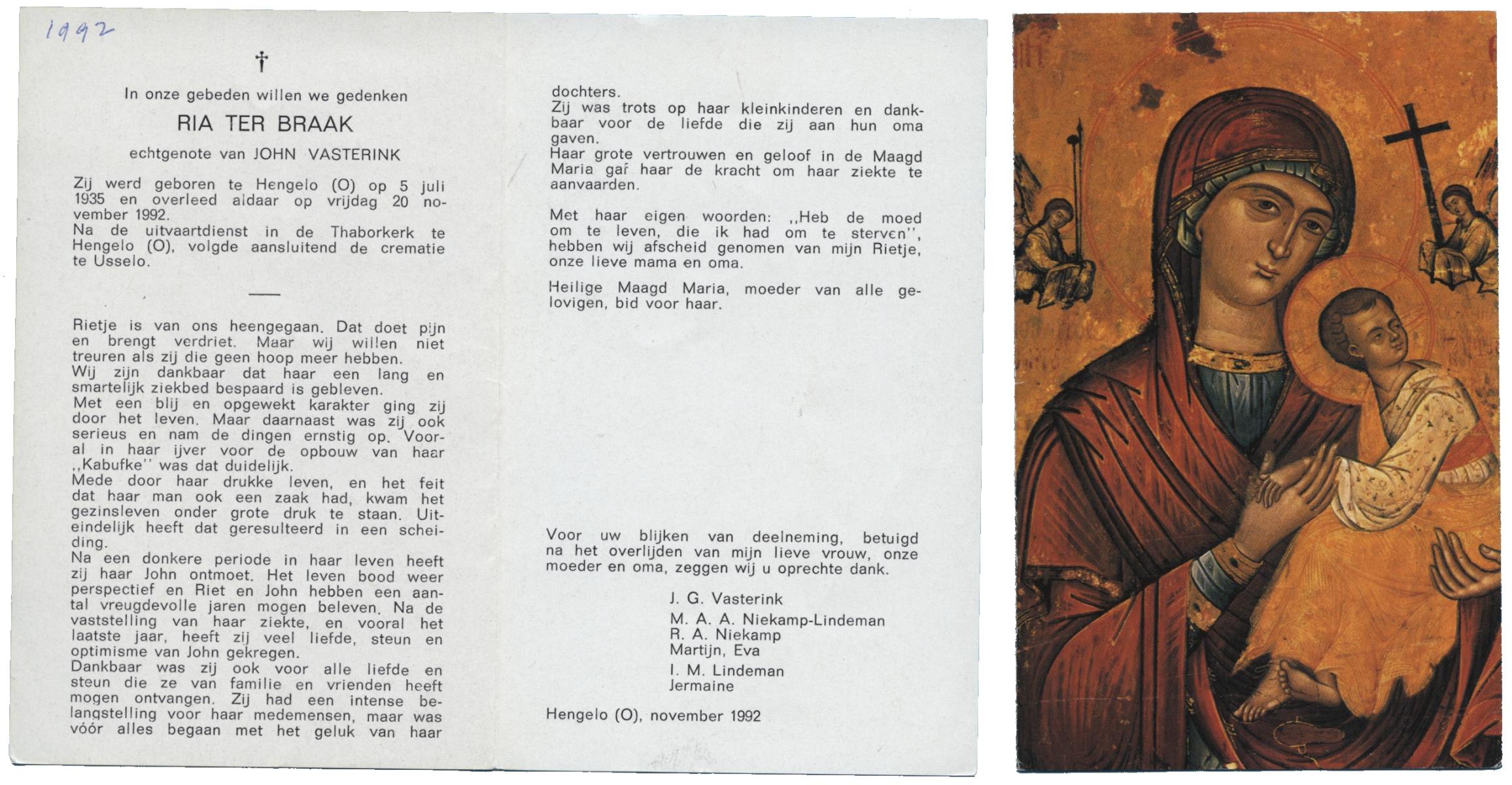 BRAAK, ter, Ria, geboren op 5-7-1935 te Hengelo (O), overleden op 20-11-1992 te Hengelo (Ov.) op 57-jarige leeftijd, gecremeerd te Usselo.