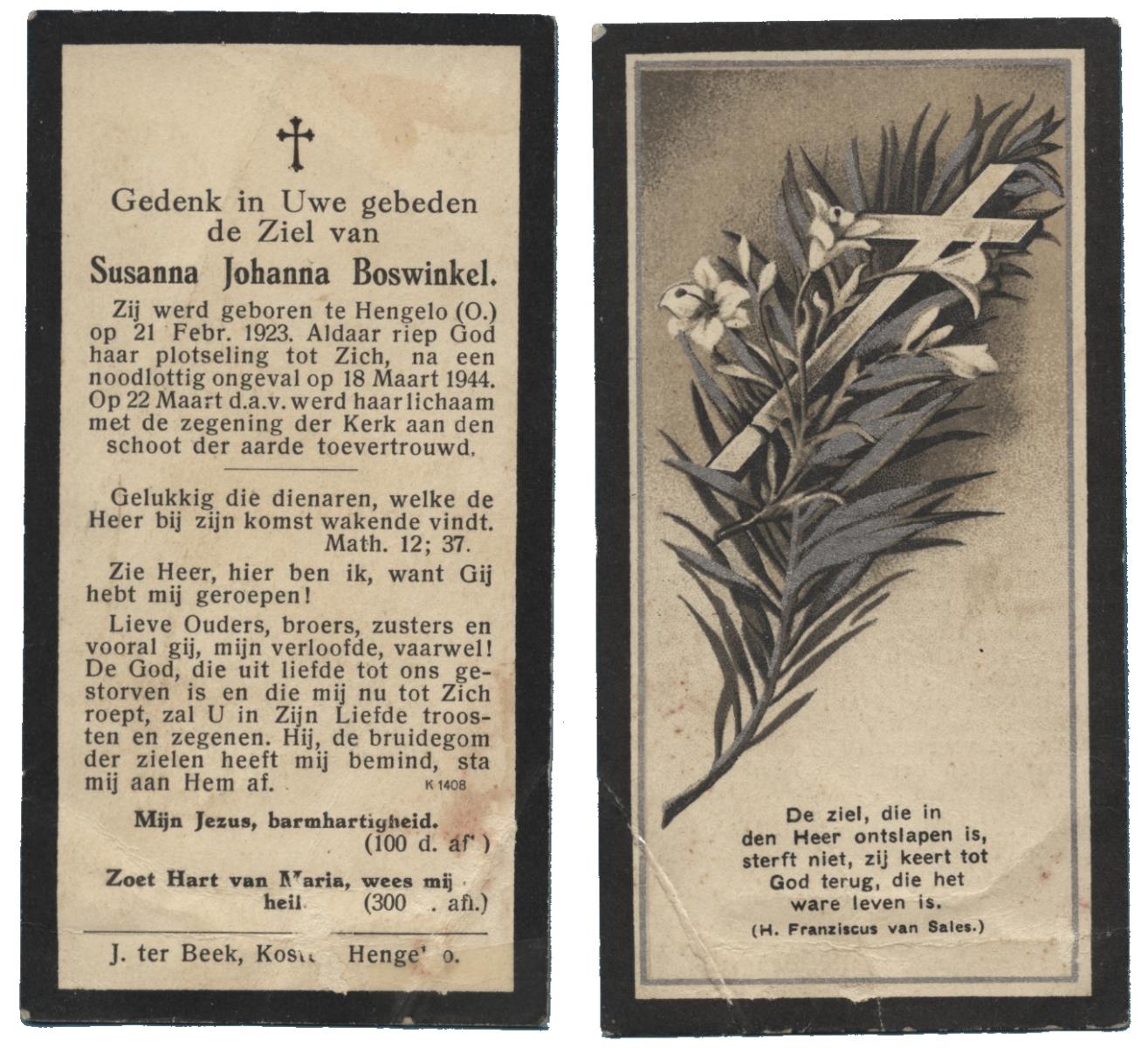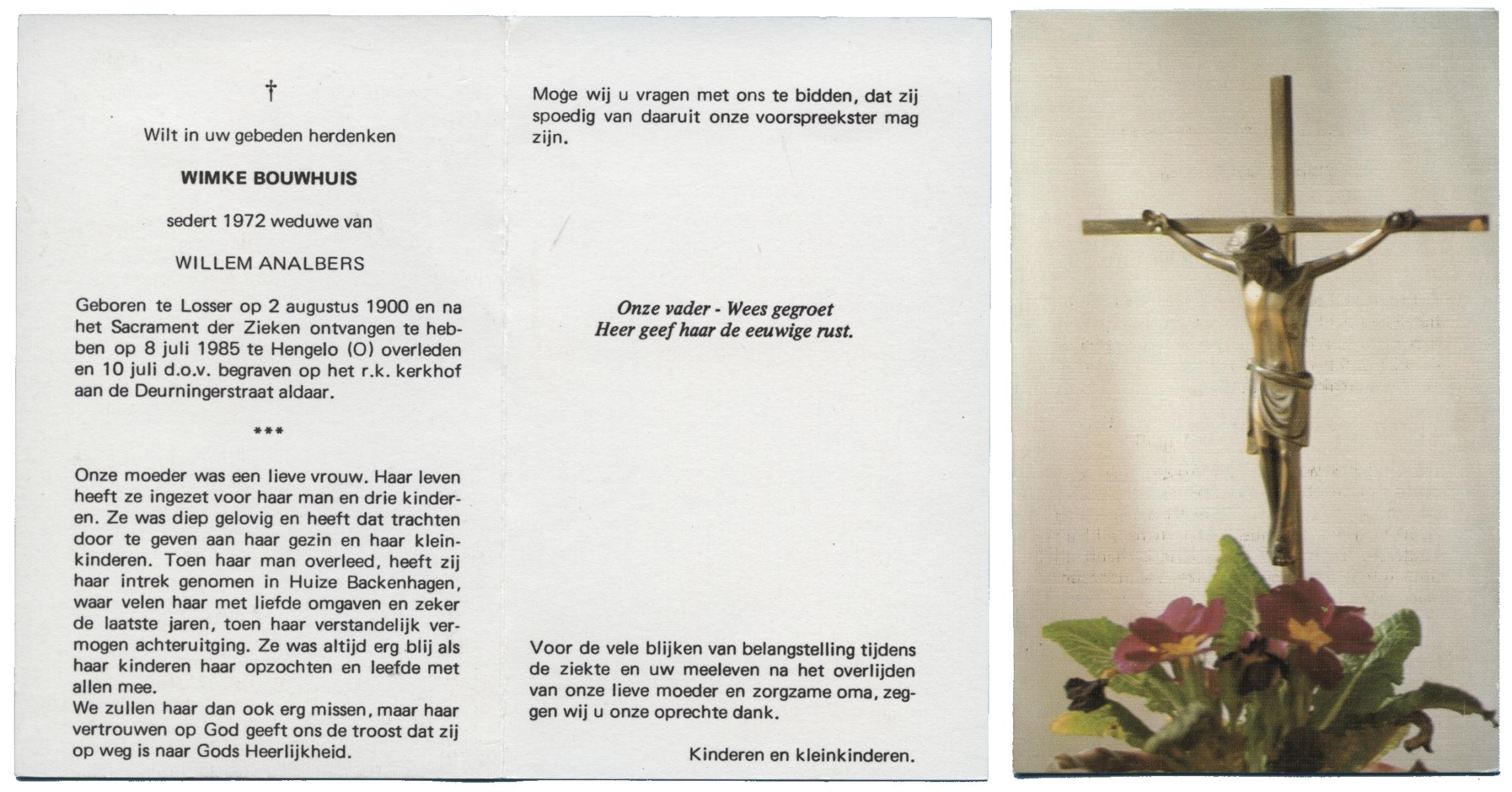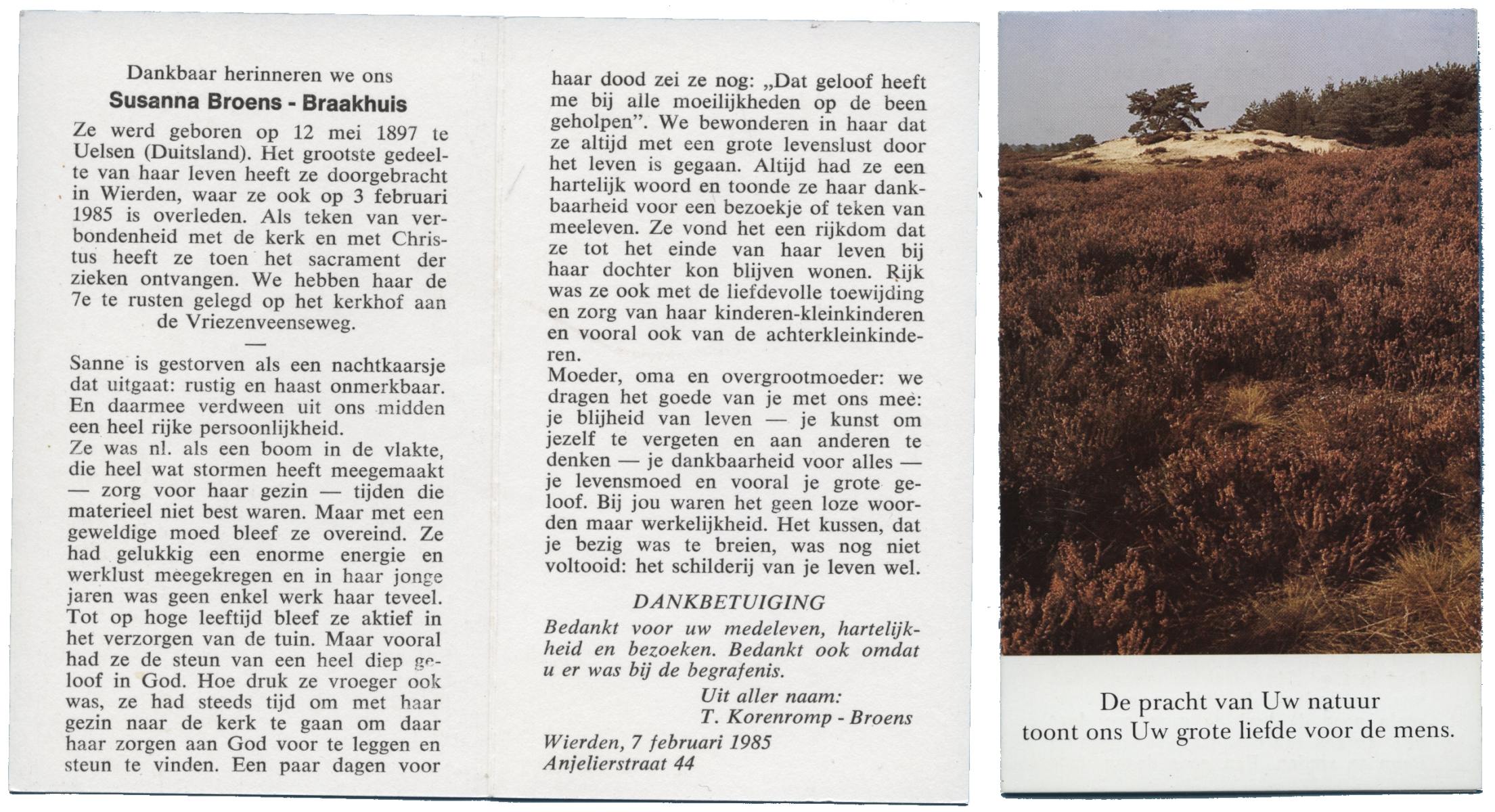 BRAAKHUIS, Susanna, geboren op 12-05-1897 te Uelsen (Dld.), overleden op 3-2-1985 te Wierden op 87-jarige leeftijd, begraven op 7-2-1985 te Wierden.