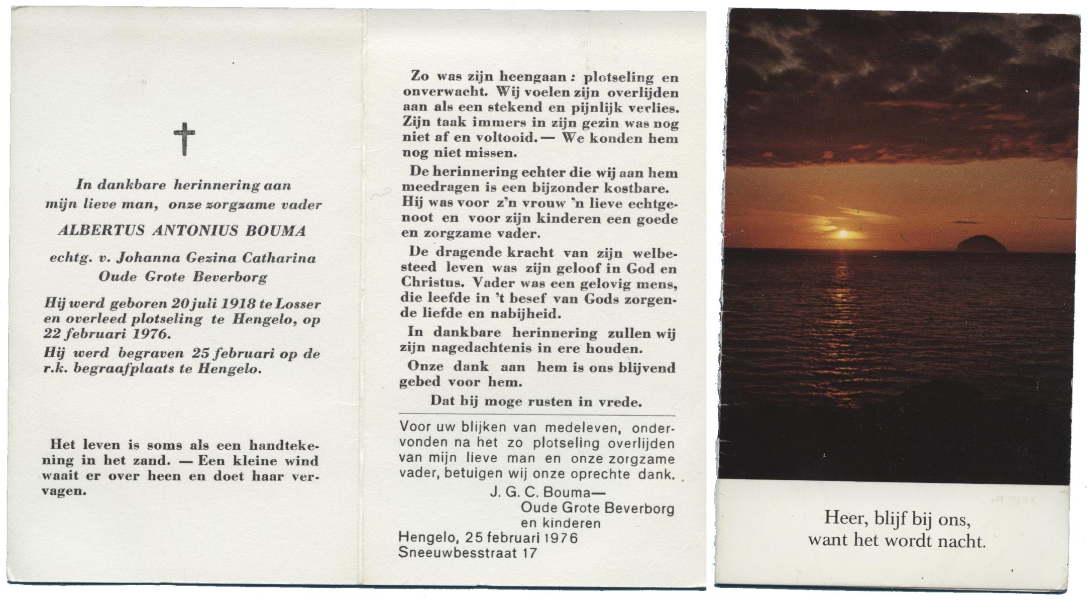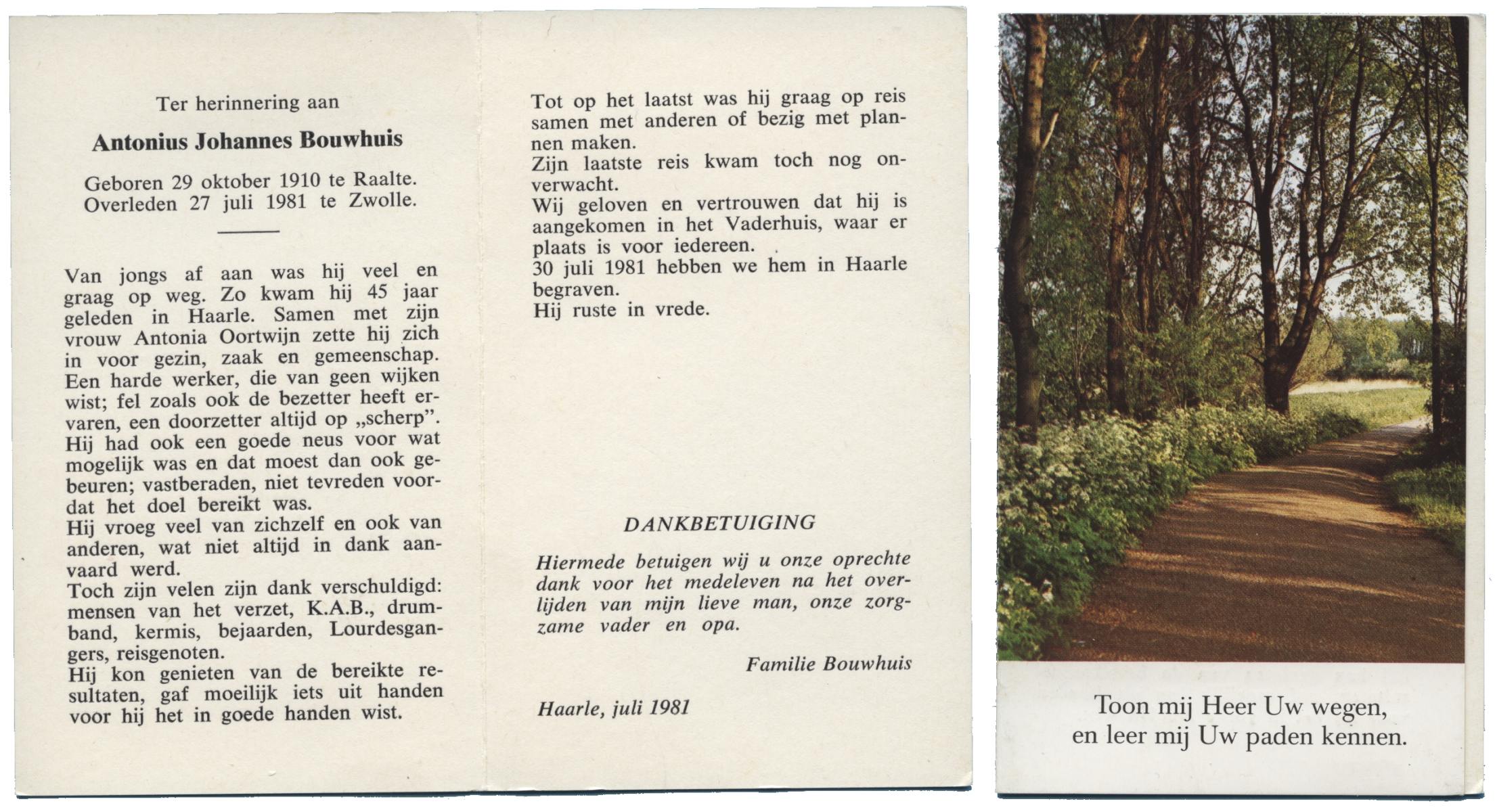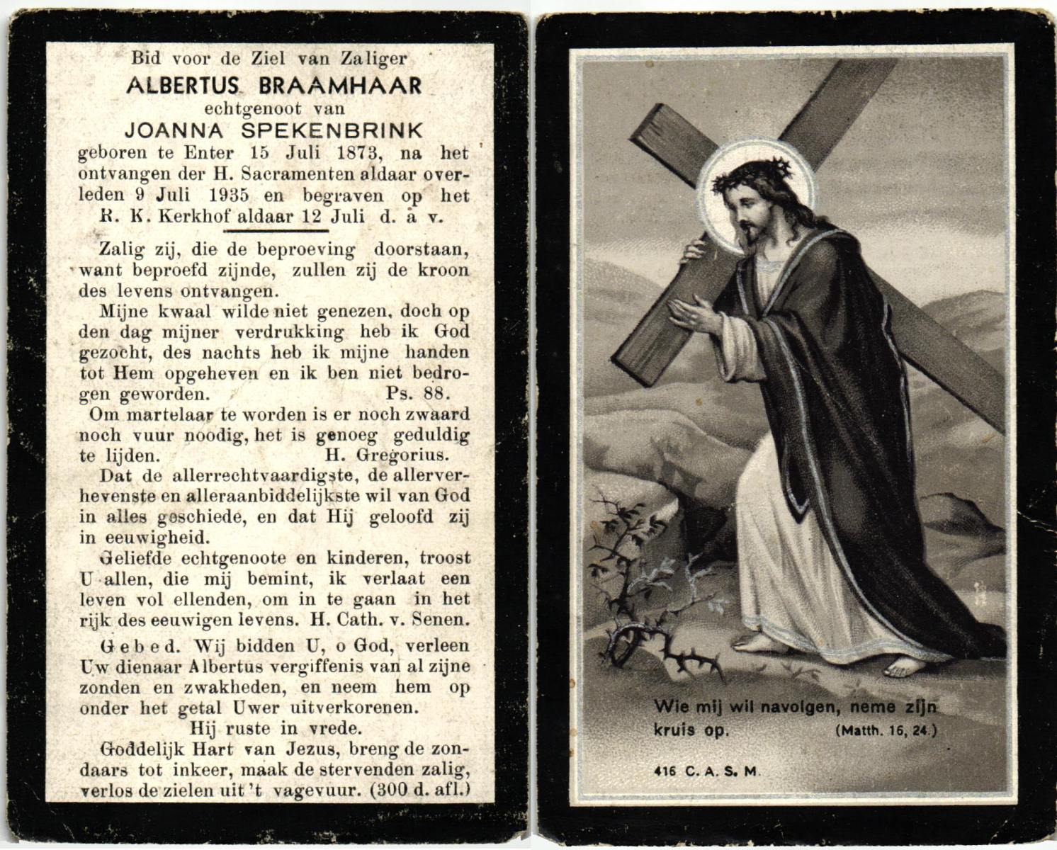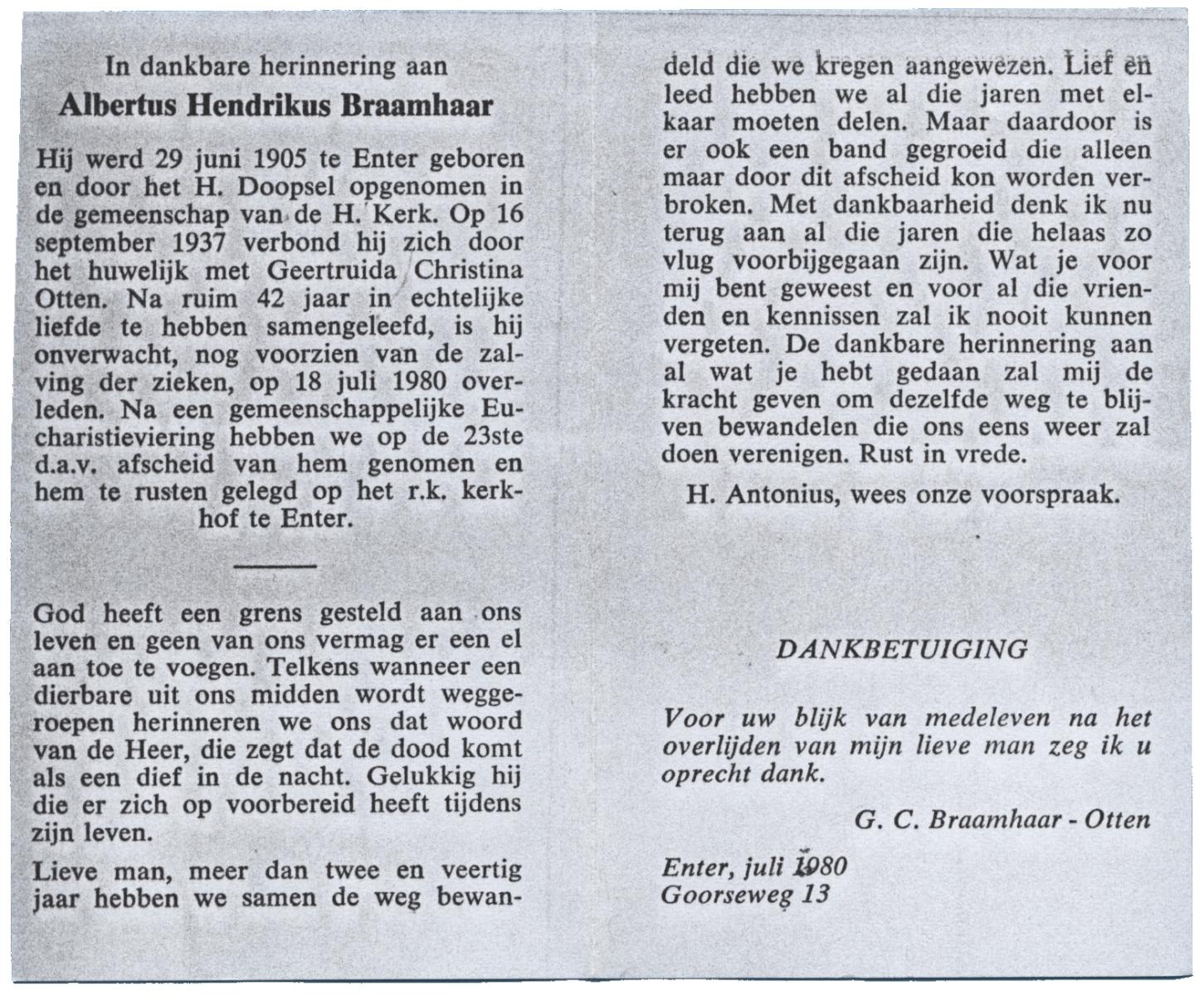 BRAAMHAAR, Albertus Hendrikus, geboren op 29-6-1905 te Enter, overleden op 18-7-1980 te Enter op 75-jarige leeftijd, begraven op 23-7-1980 te Enter.