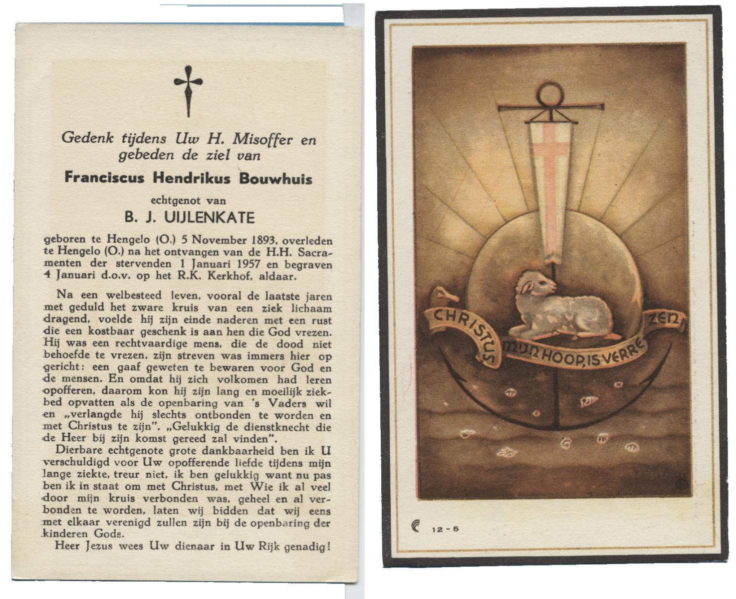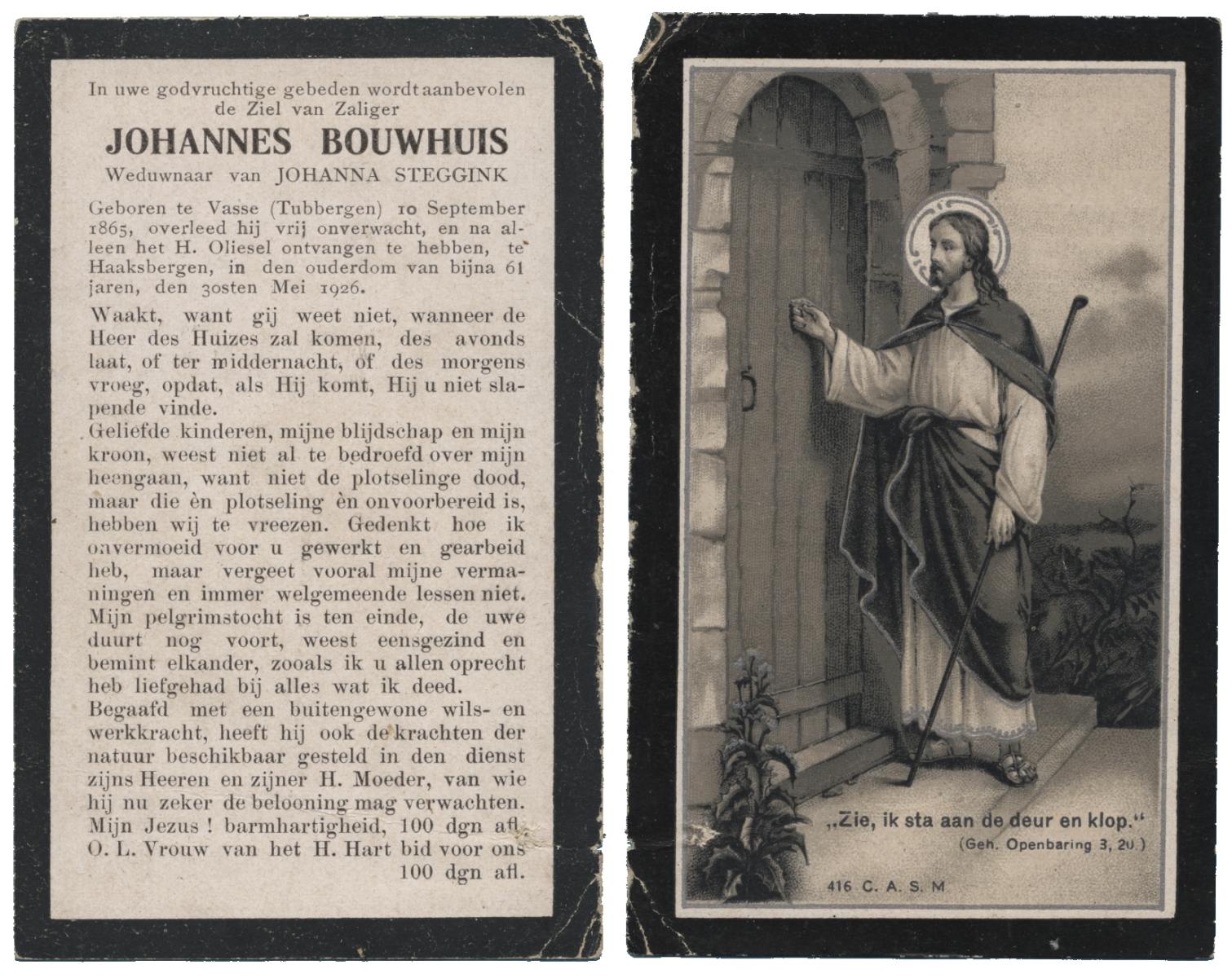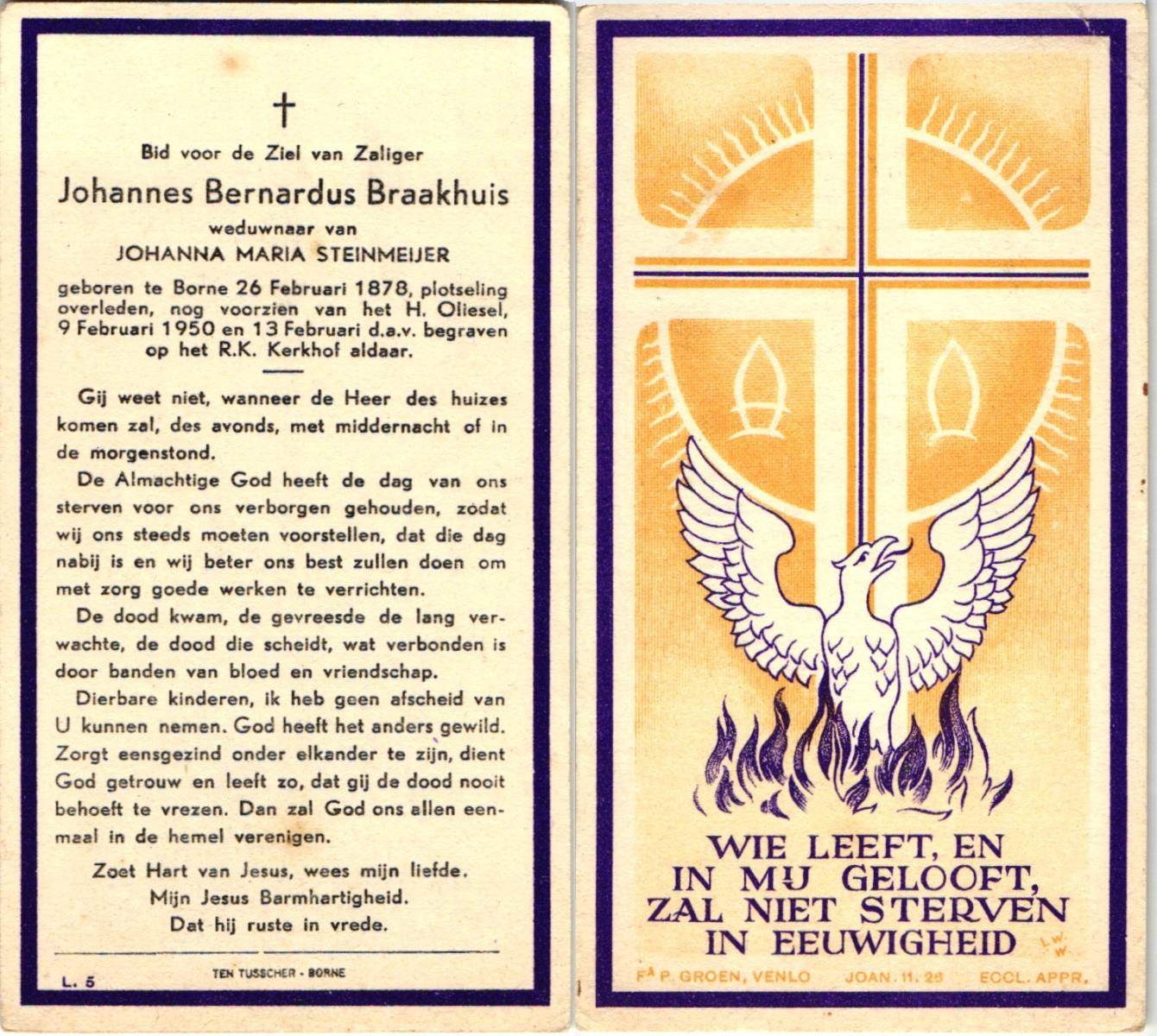 BRAAKHUIS, , Johannes Bernardus, geboren op 26-02-1878 te Borne, overleden op 9-2-1950 te Borne op 71-jarige leeftijd, begraven op 13-3-1950 te Borne.