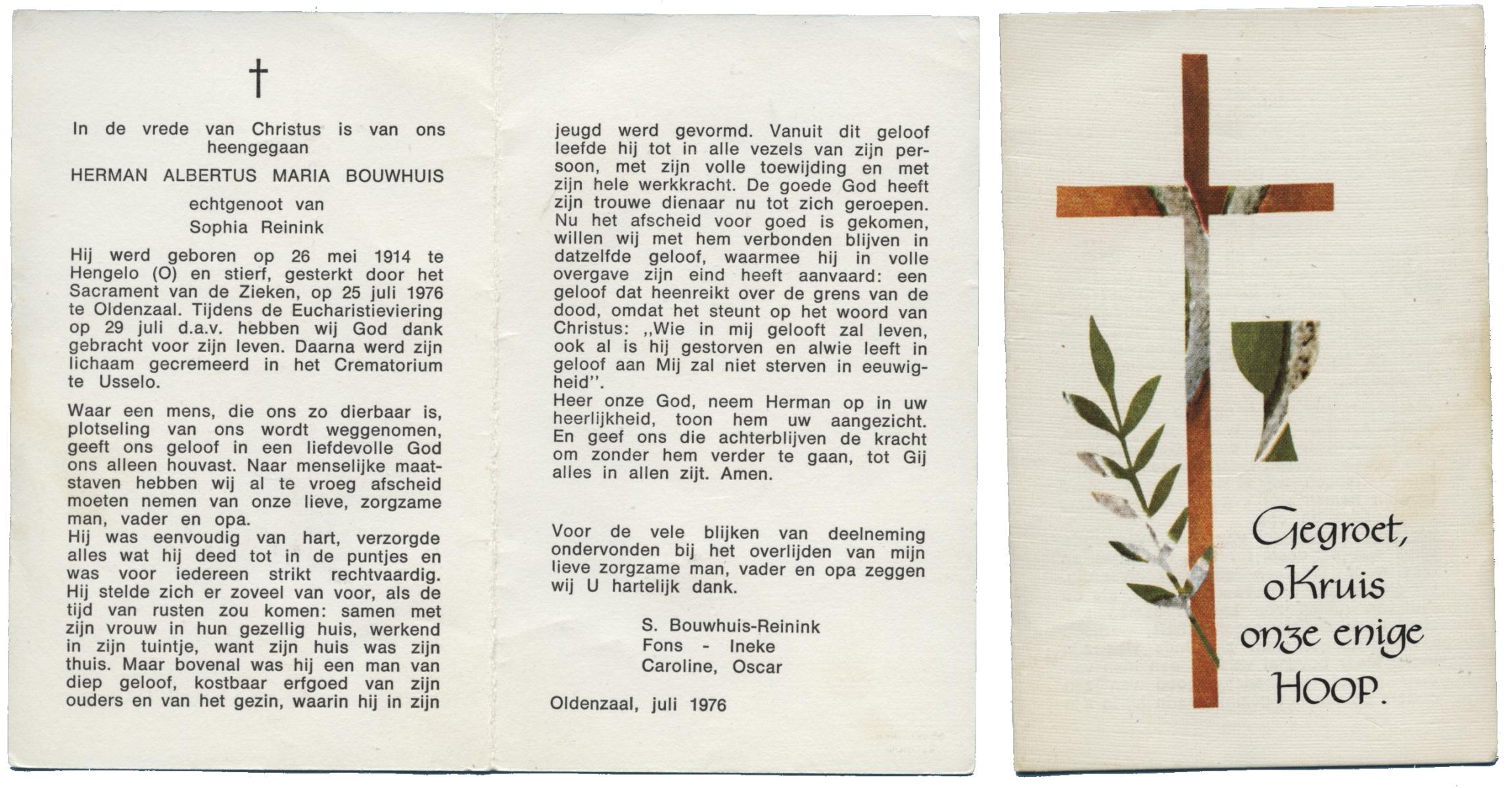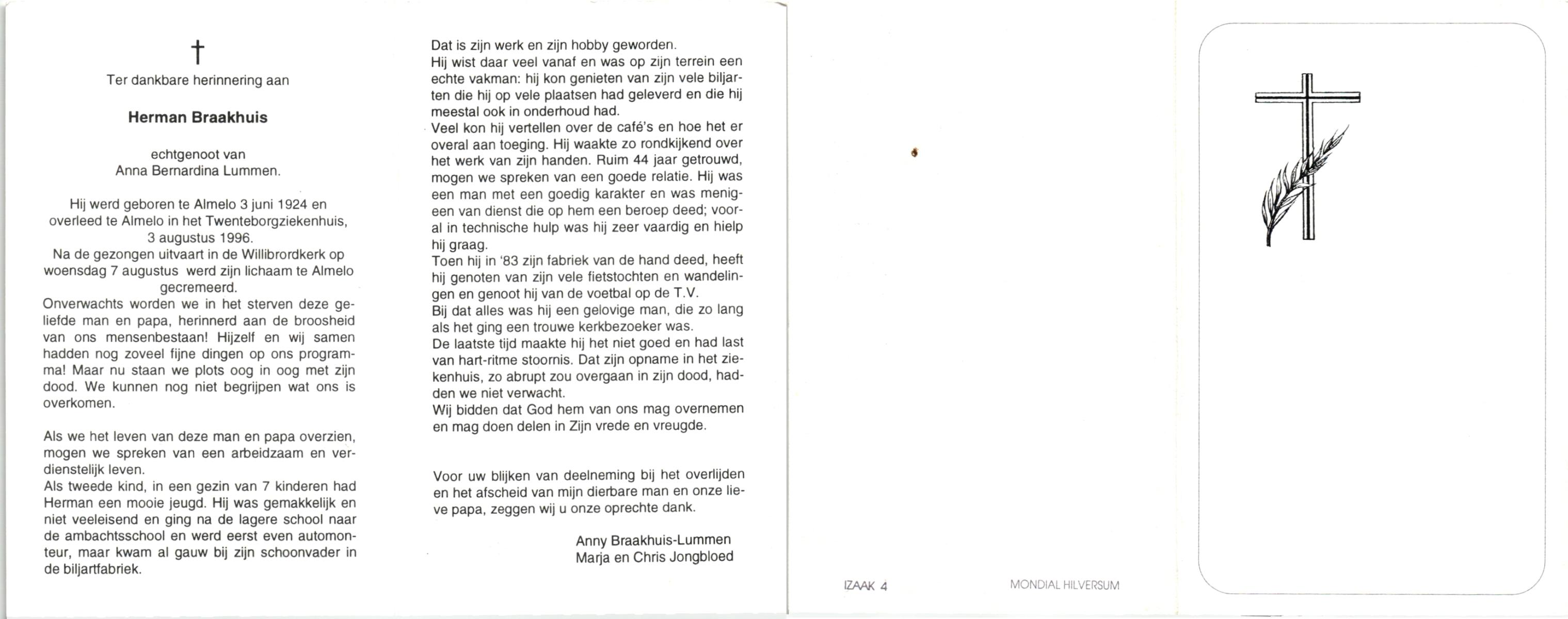 BRAAKHUIS, , Herman, geboren op 3-6-1924 te Almelo, overleden op 3-8-1996 te Almelo op 72-jarige leeftijd, gecremeerd op 7-8-1996 te Almelo.