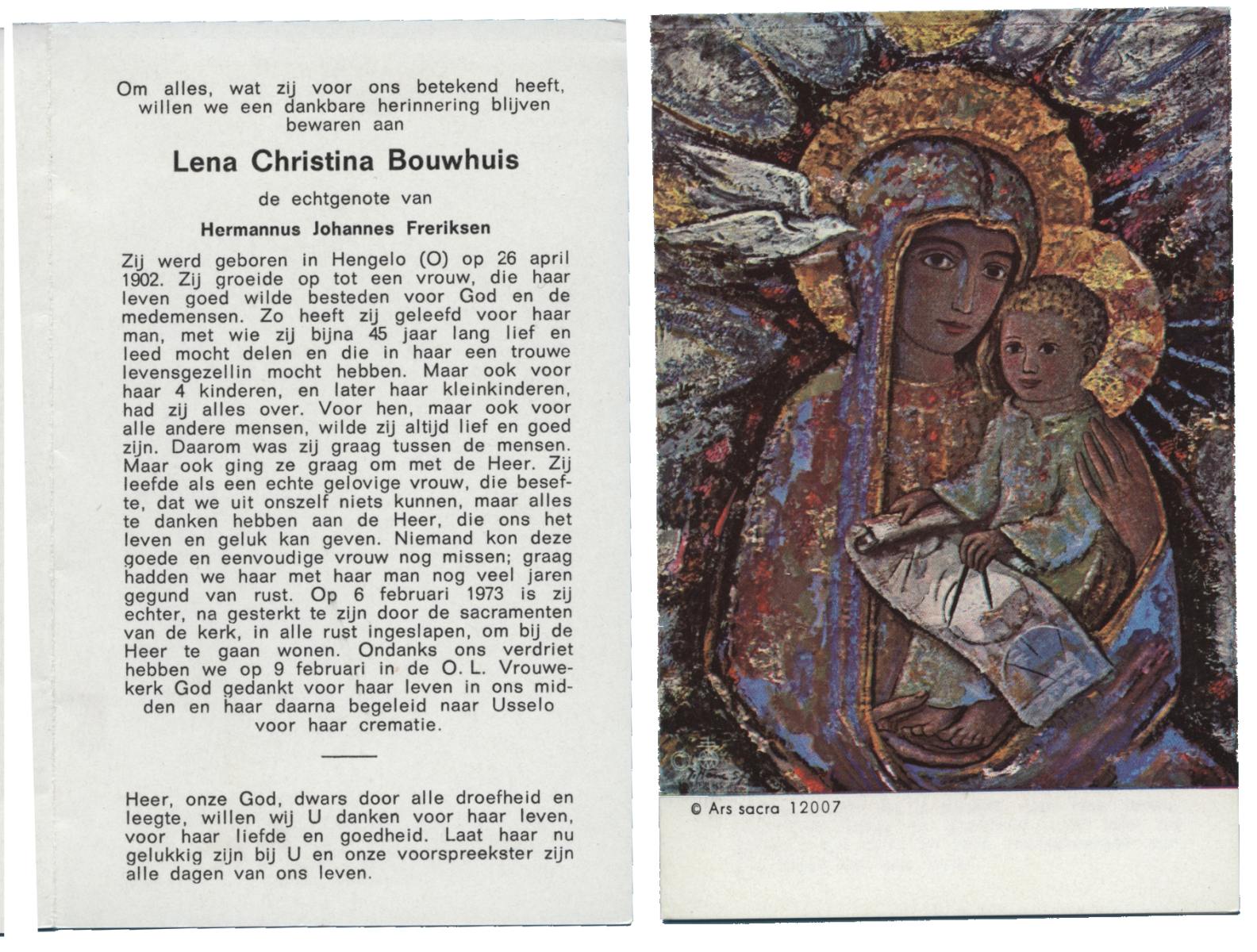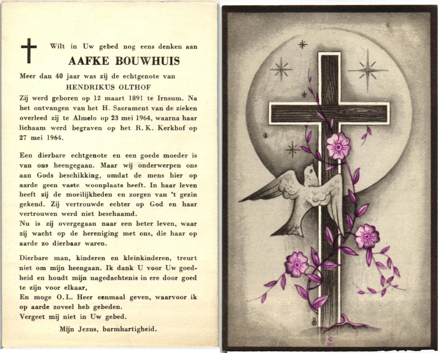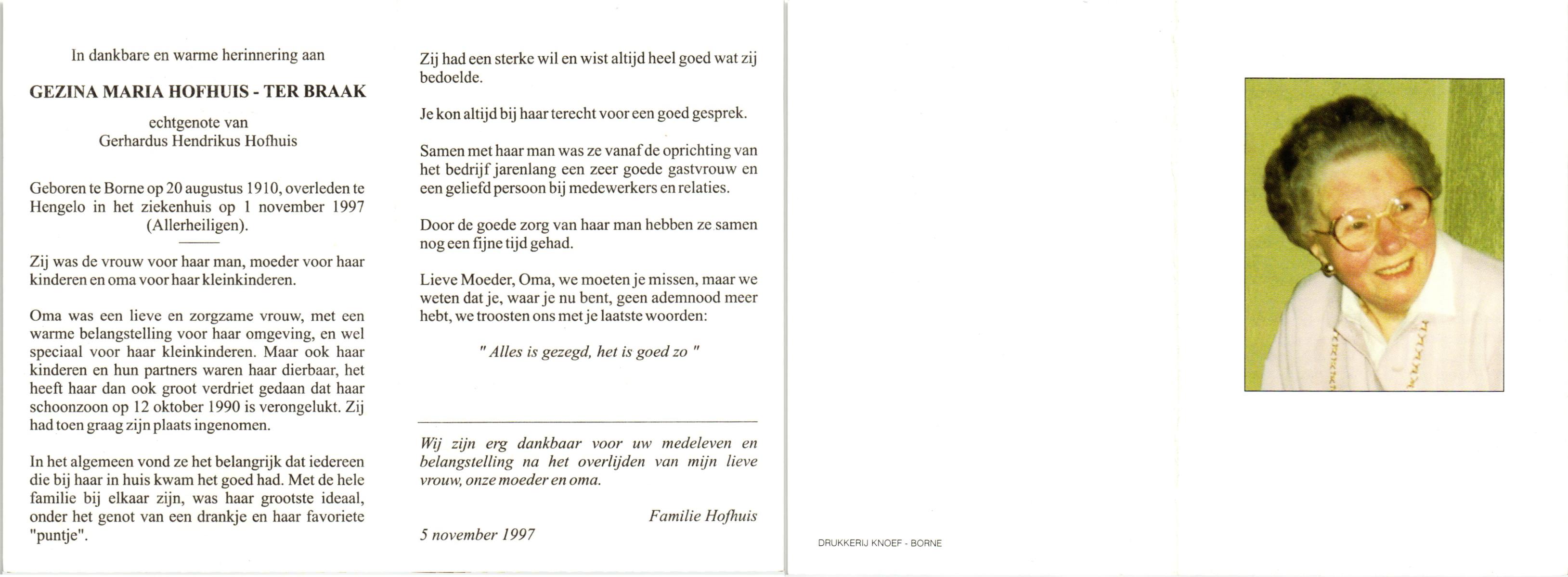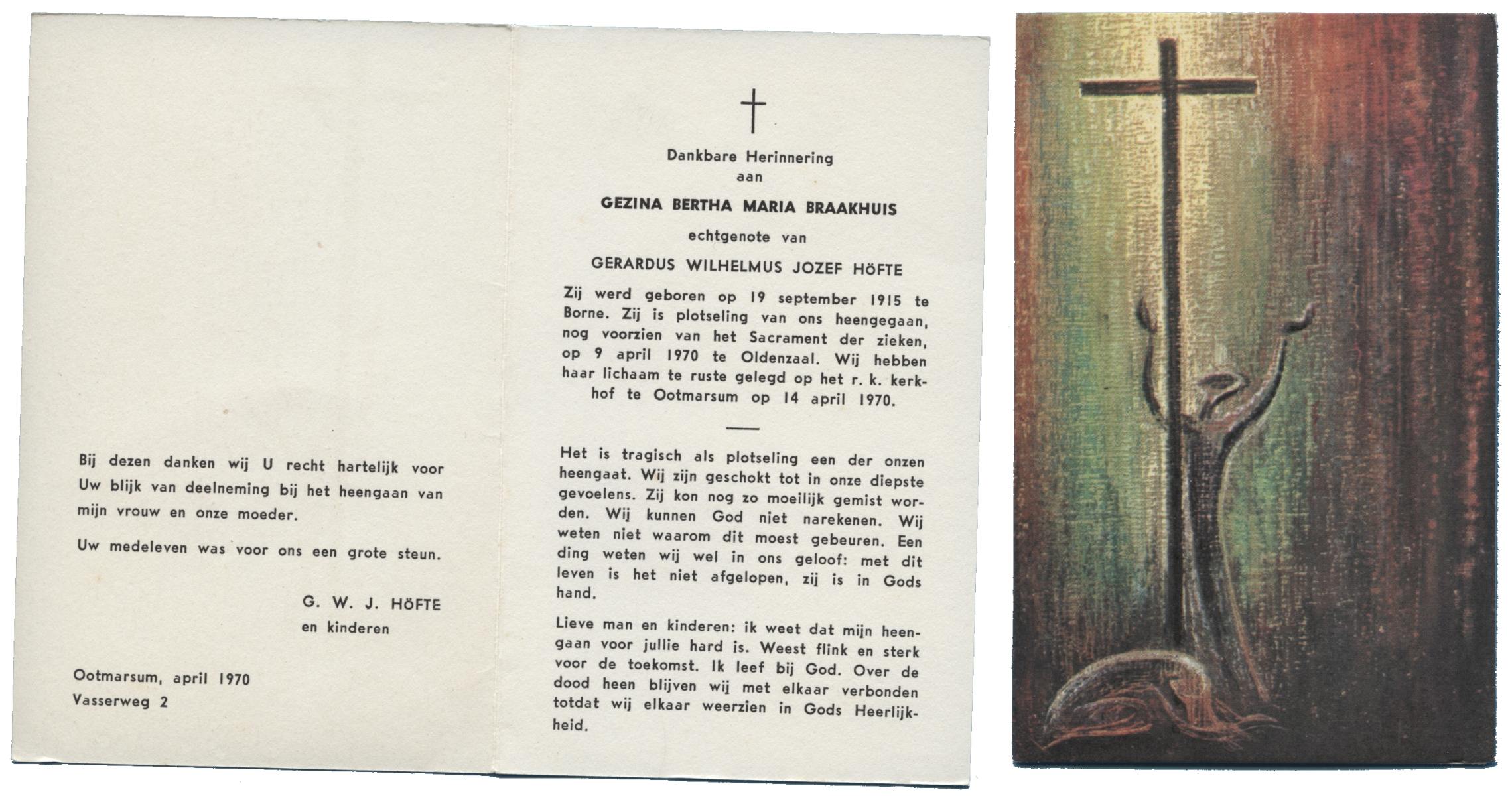 BRAAKHUIS, Gezina Bertha Maria, geboren op 19-9-1915 te Borne, overleden op 9-4-1970 te Oldenzaal op 54-jarige leeftijd, begraven op 14-4-1970 te Ootmarsum.