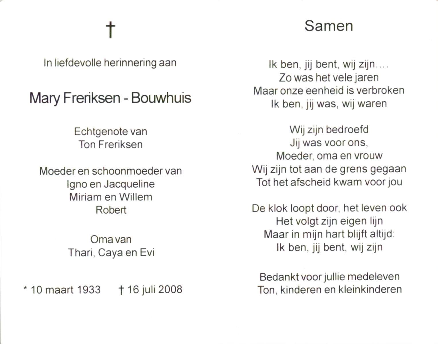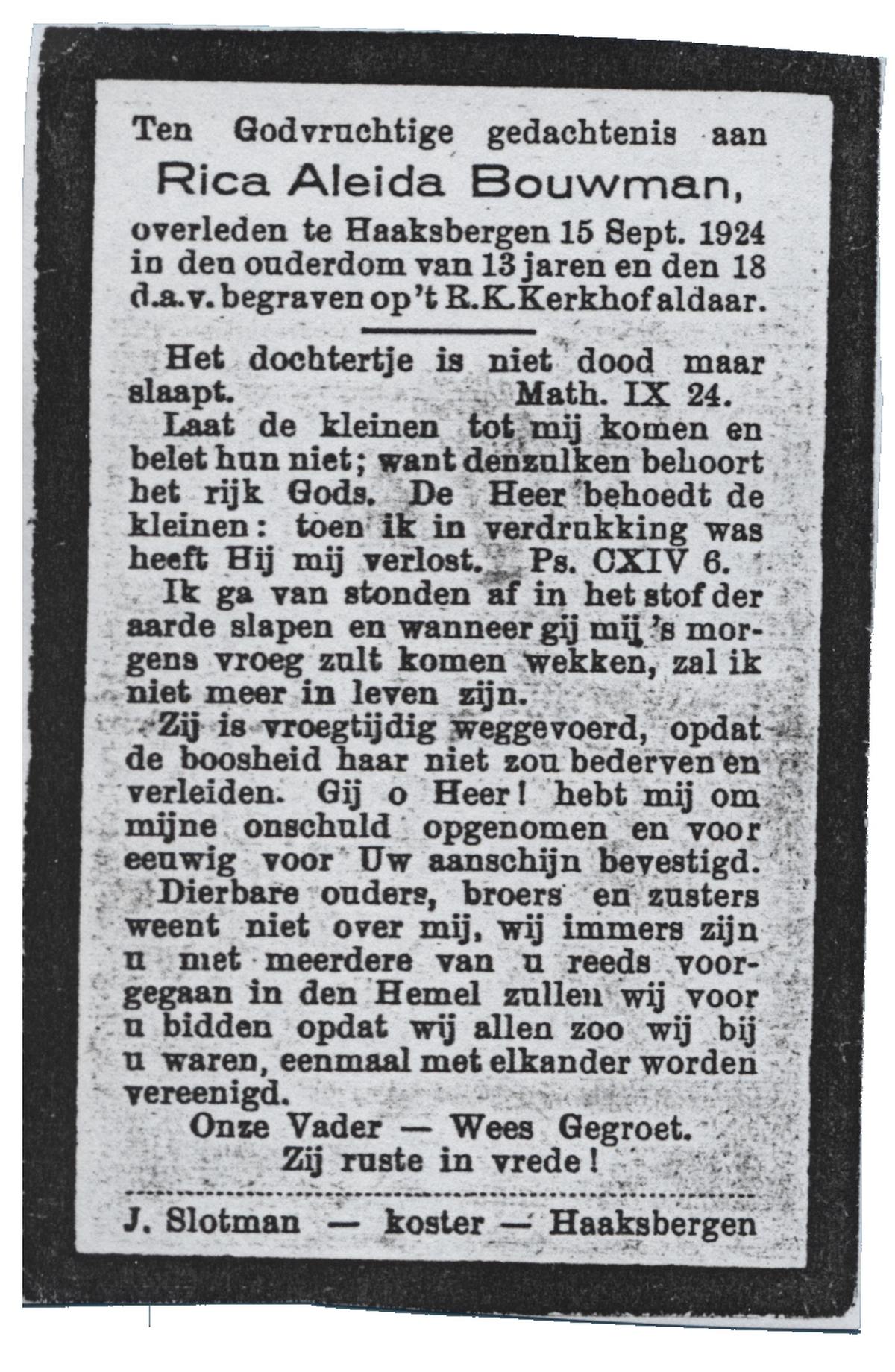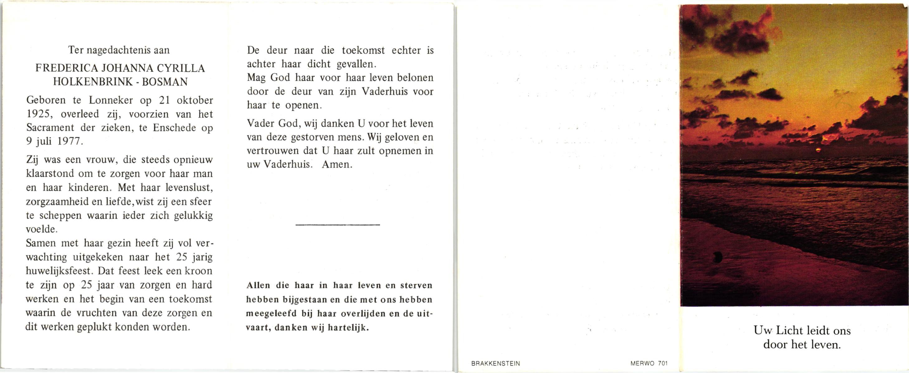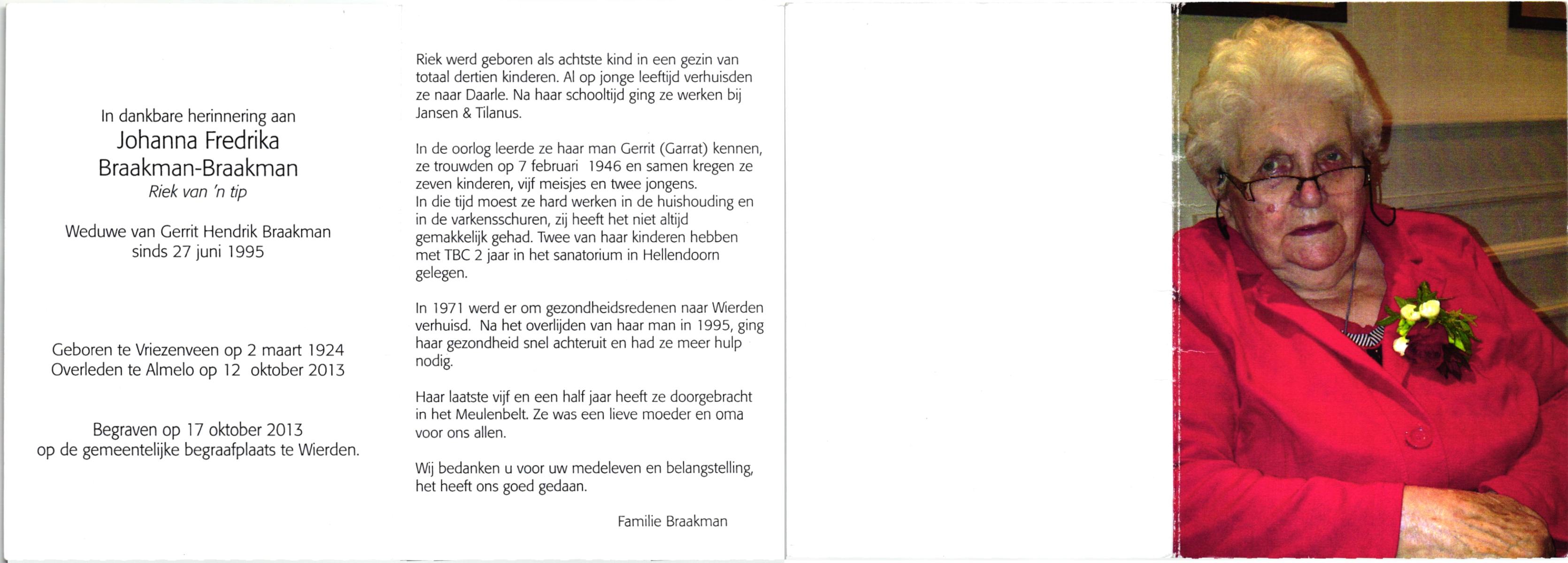 BRAAKMAN, , Johanna Fredrika, geboren op 2-3-1924 te Vriezenveen, overleden op 12-10-2013 te Almelo op 89-jarige leeftijd, begraven op 17-10-2013 te Wierden.