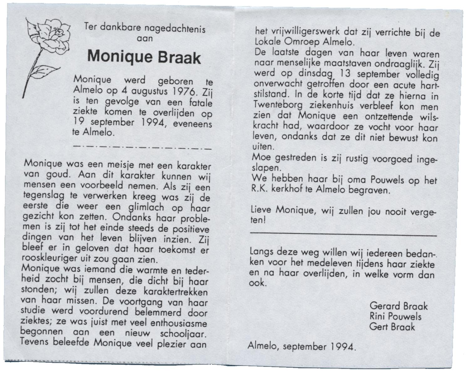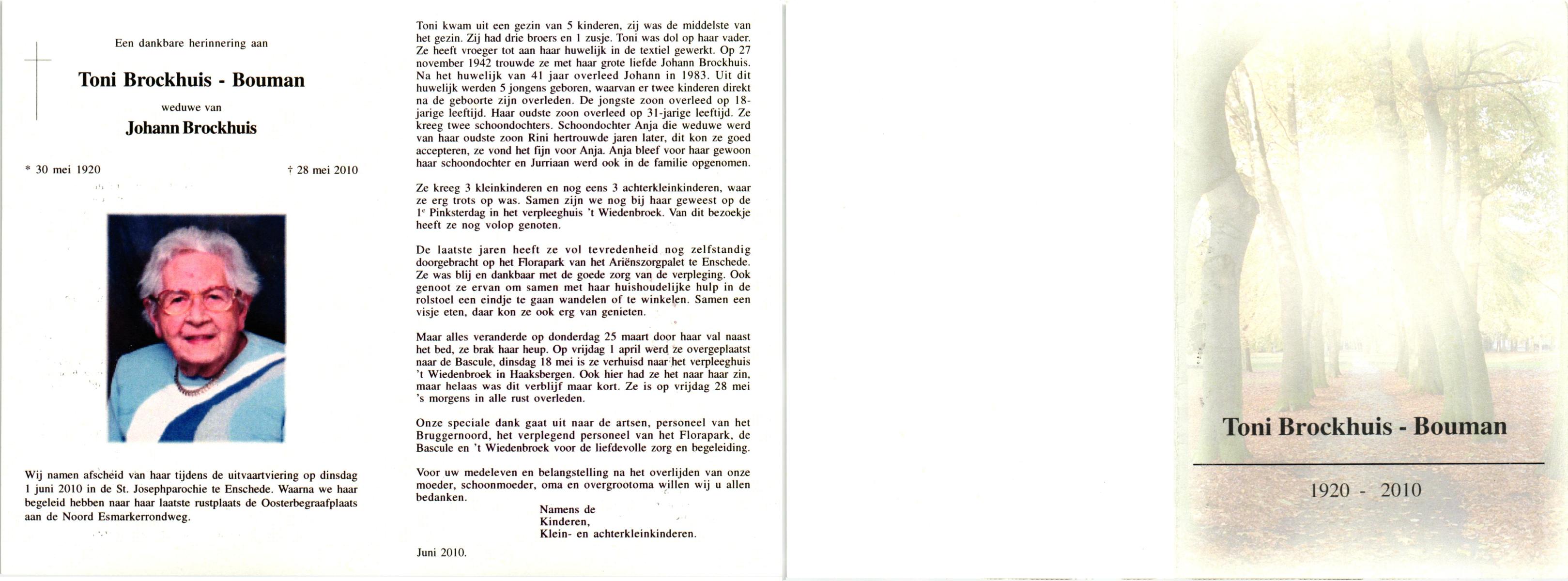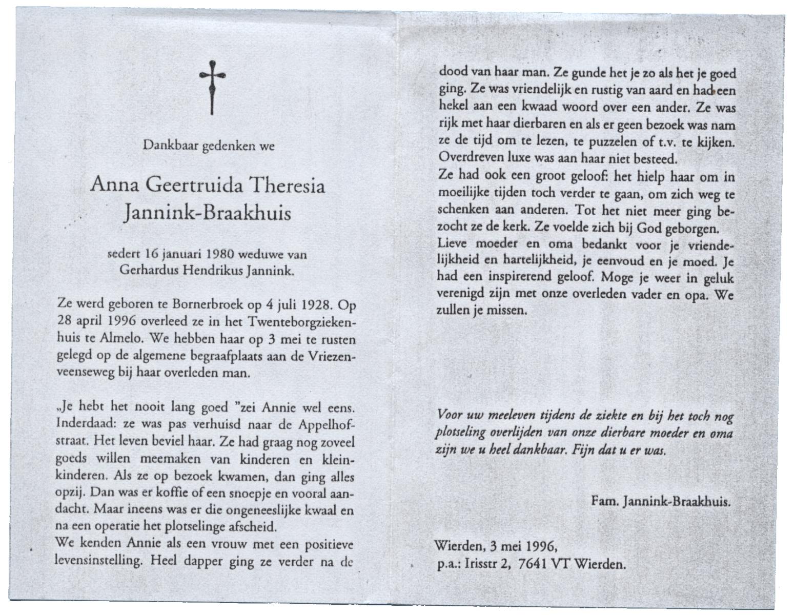 BRAAKHUIS, Anna Geertruida Theresia, geboren op 4-7-1928 te Bornerbroek, overleden op 28-4-1996 te Almelo op 67-jarige leeftijd, begraven op 3-5-1996 te Wierden.