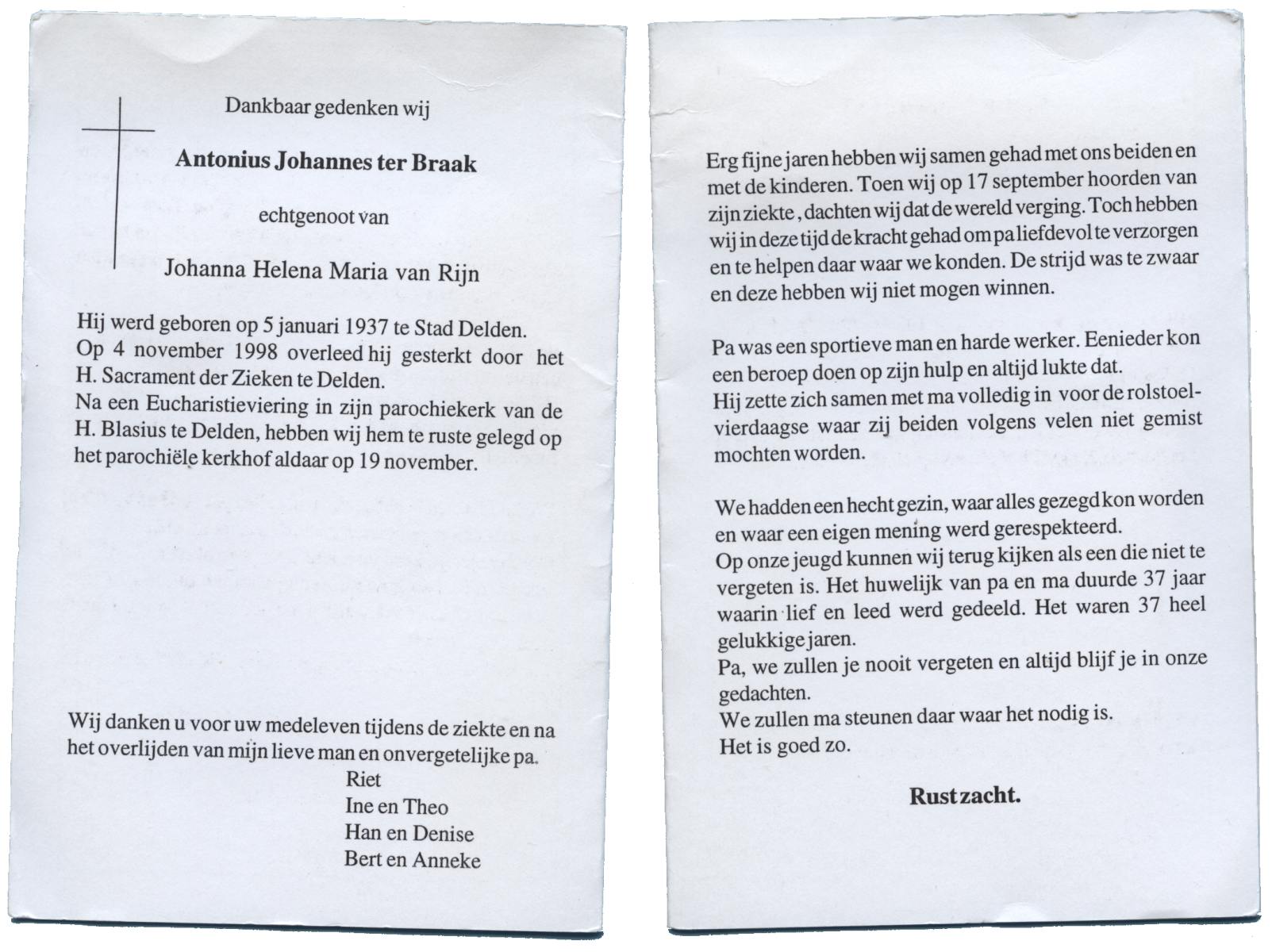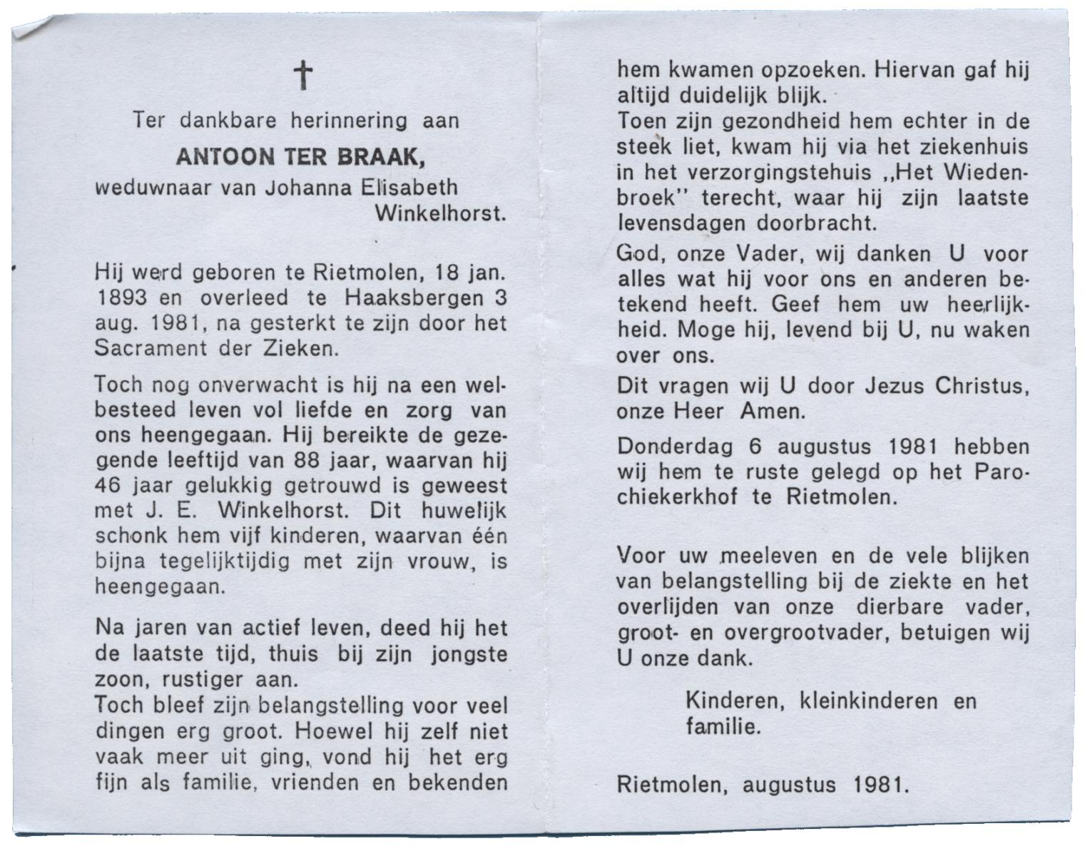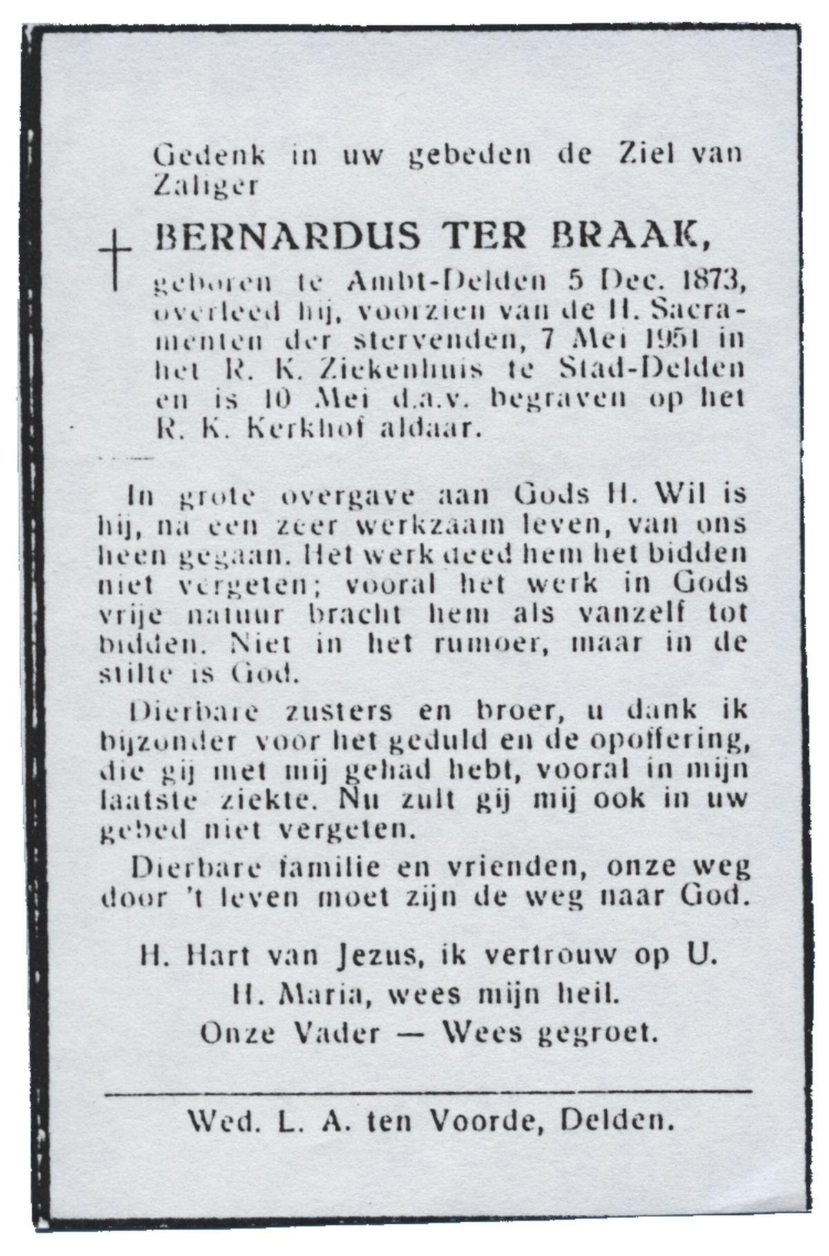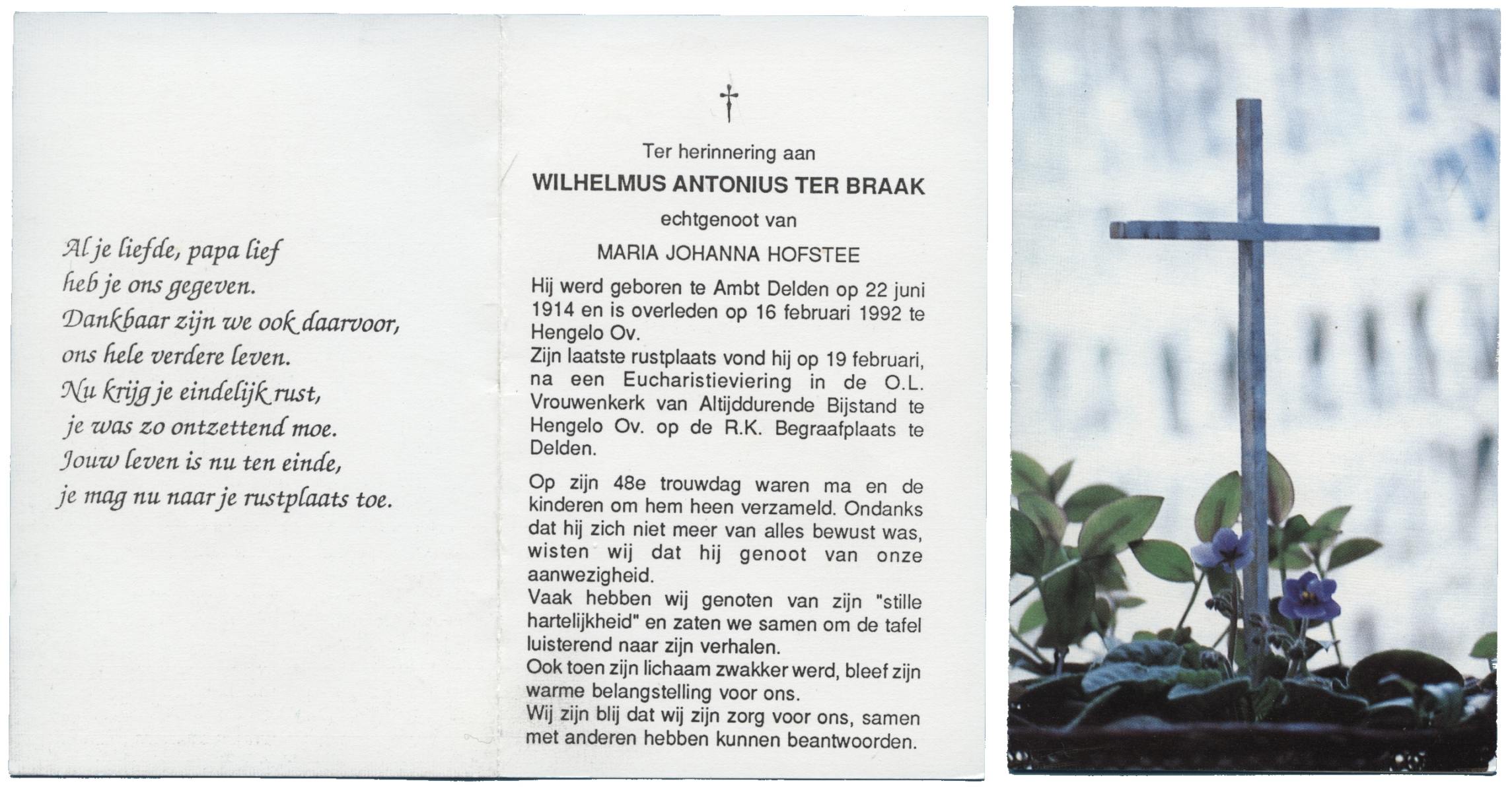 BRAAK, ter, Wilhelmus Antonius, geboren op 22-6-1914 te Delden, Ambt, overleden op 16-2-1992 te Hengelo (Ov.) op 77-jarige leeftijd, begraven op 19-2-1992 te Delden.