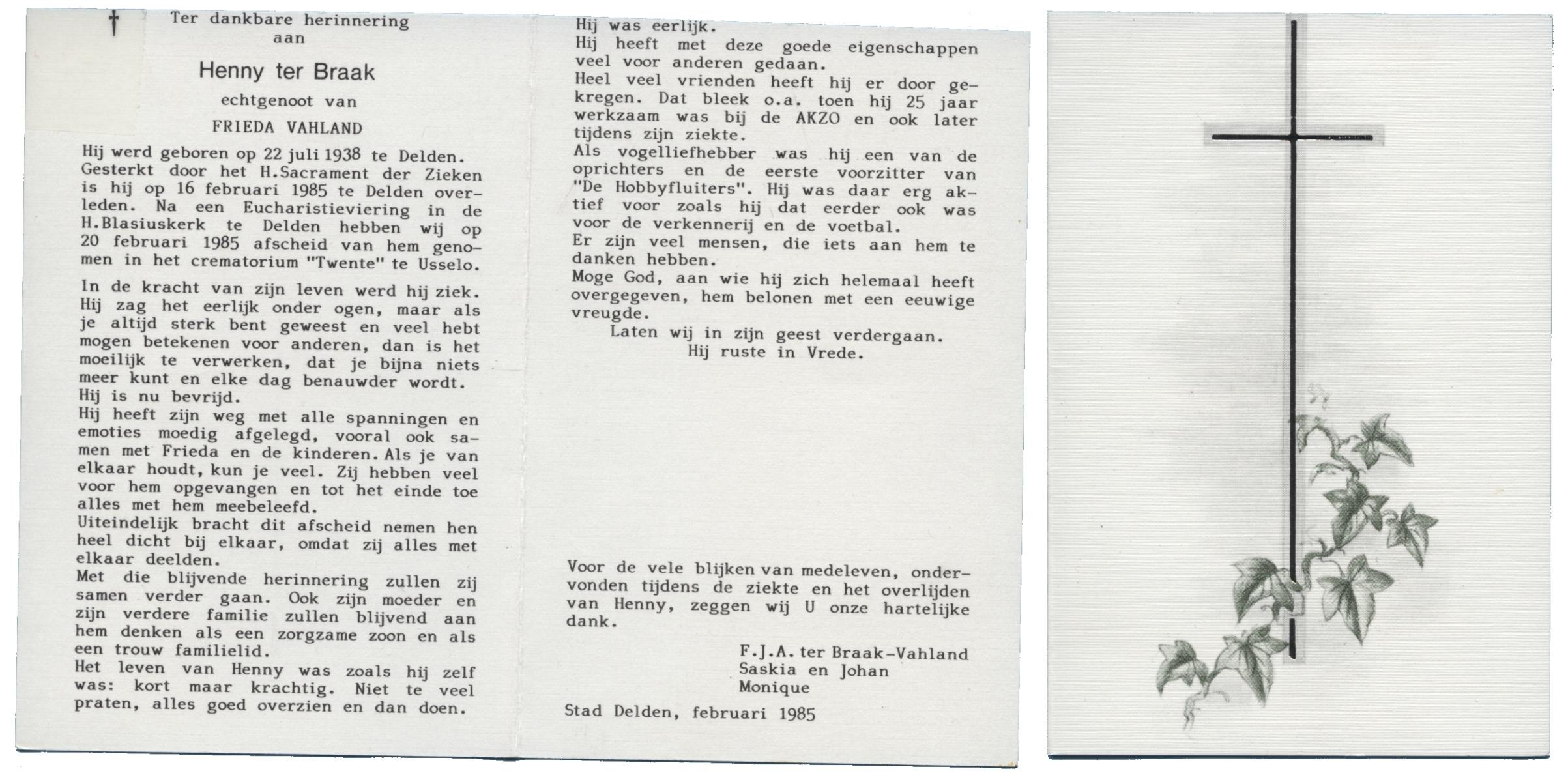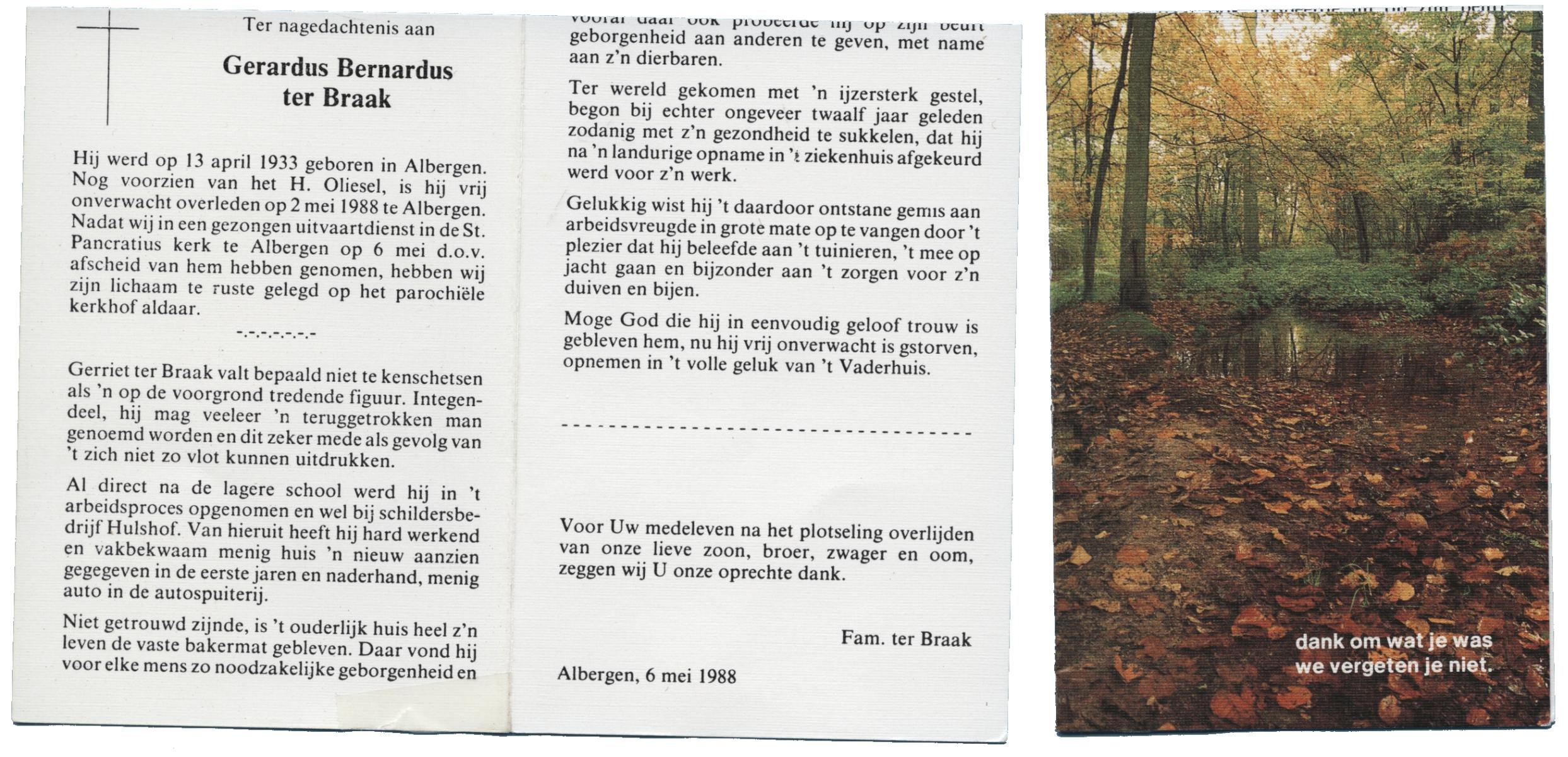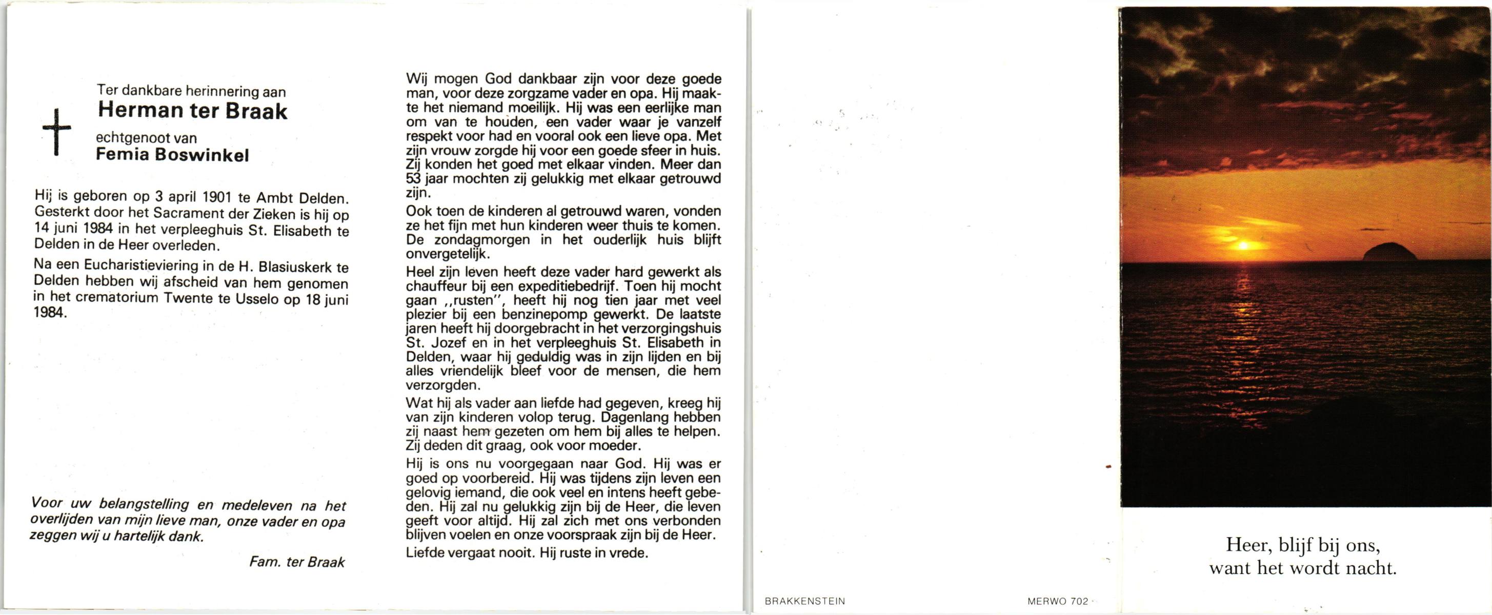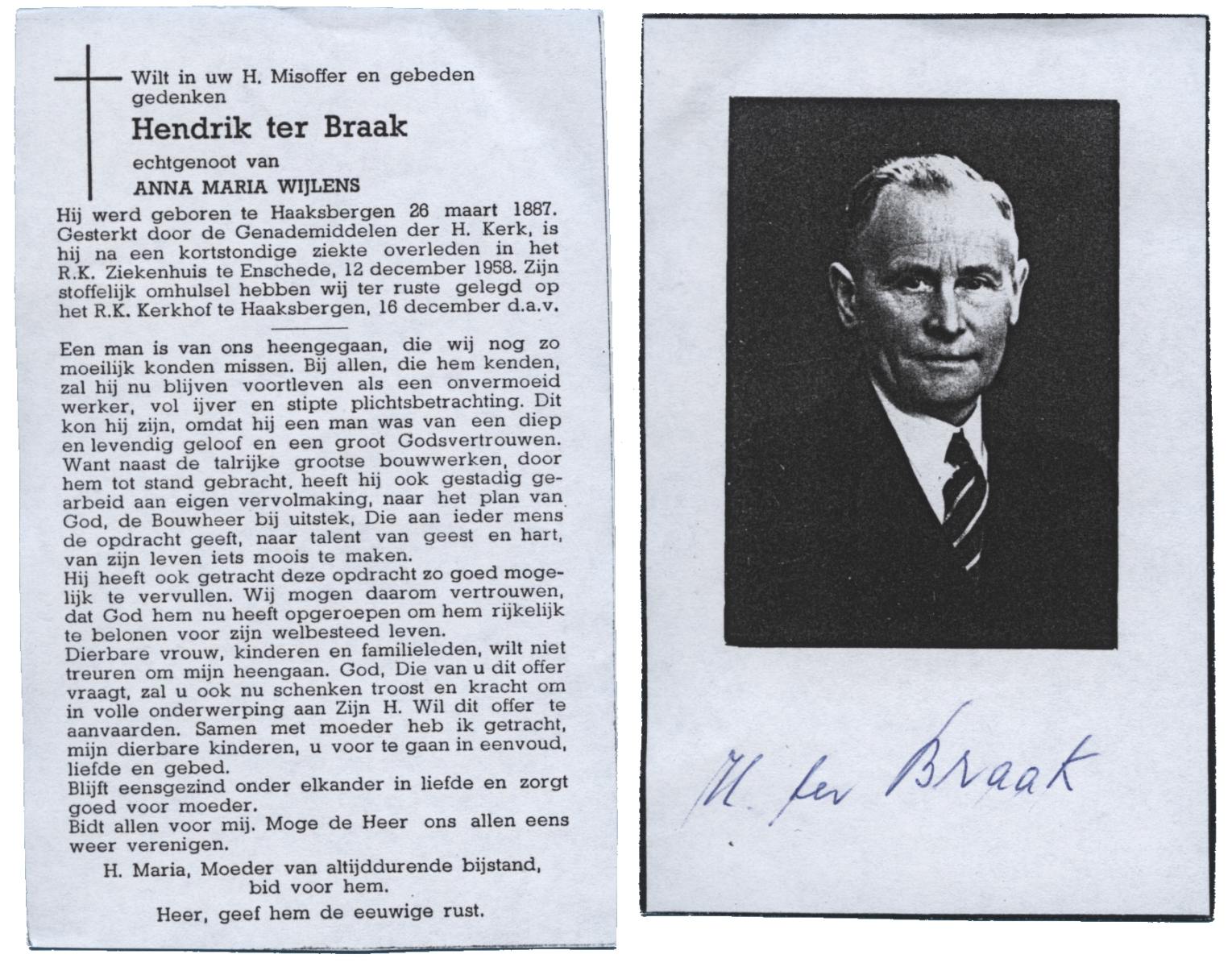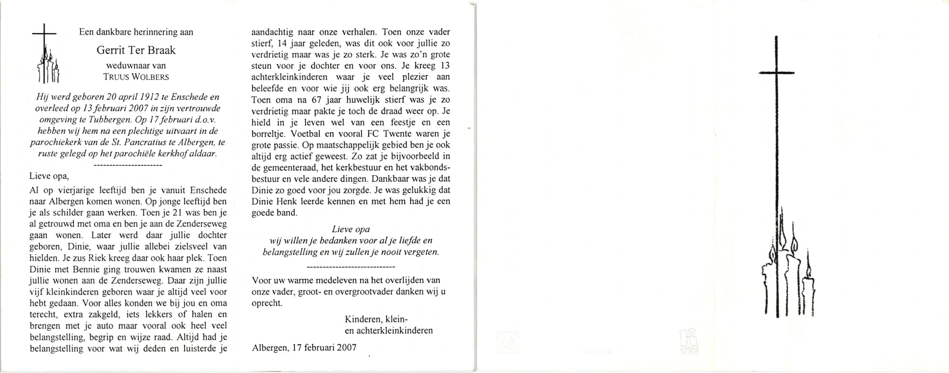 BRAAK, ter, Wilhelmus Antonius, geboren op 22-6-1914 te Delden, Ambt, overleden op 16-2-1992 te Hengelo (Ov.) op 77-jarige leeftijd, begraven op 19-2-1992 te Delden.