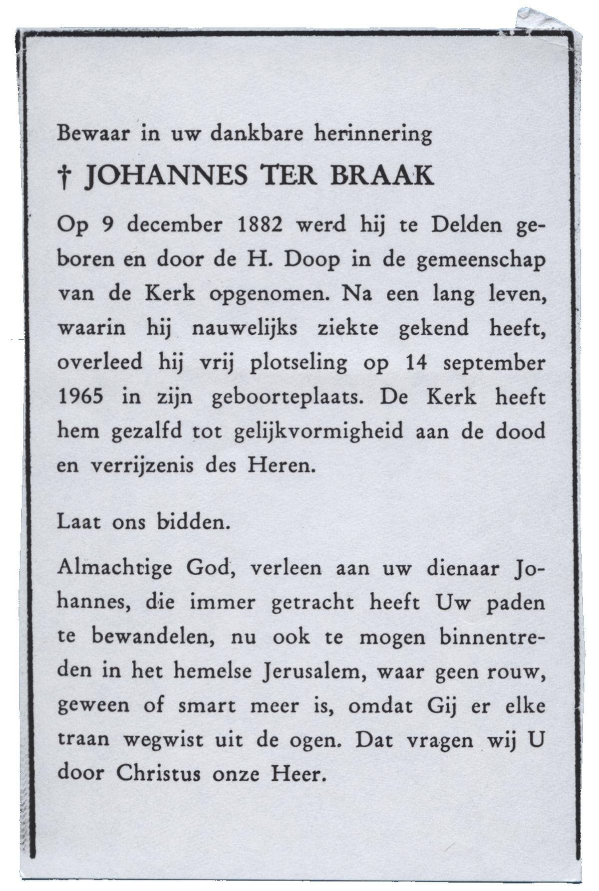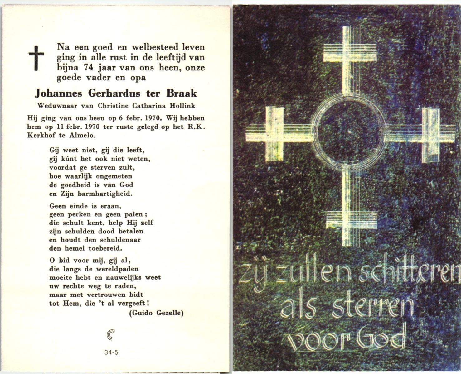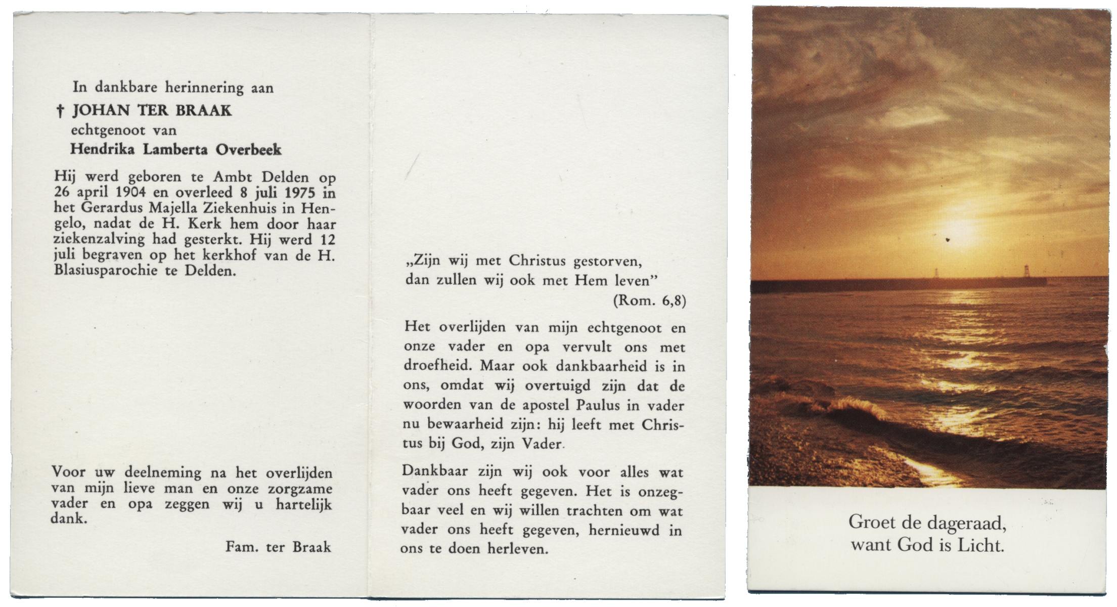 BRAAK, ter, Johan, geboren op 26-4-1904 te Delden, Ambt, overleden op 8-7-1975 te Hengelo (Ov.) op 71-jarige leeftijd, begraven op 12-7-1975 te Delden.