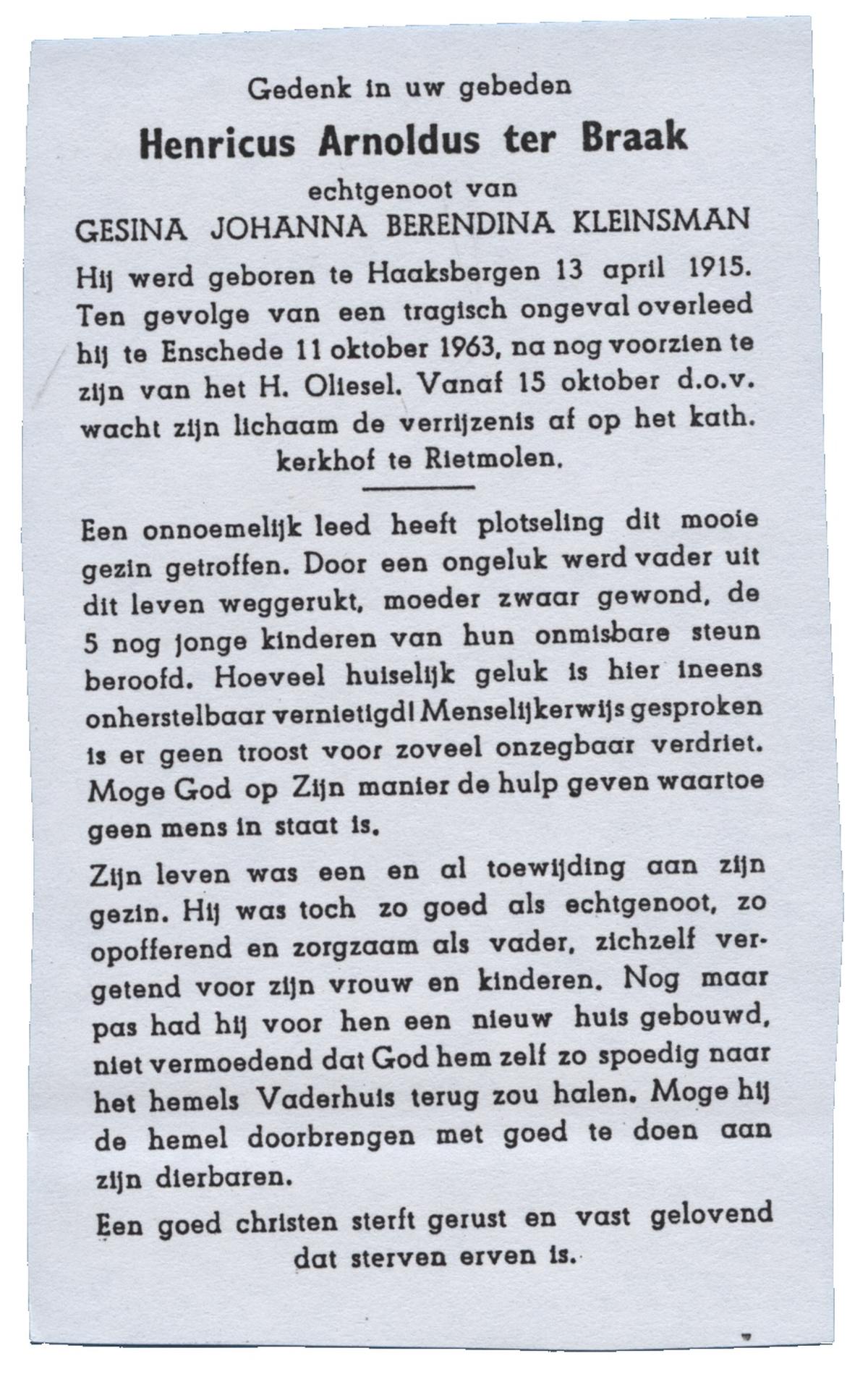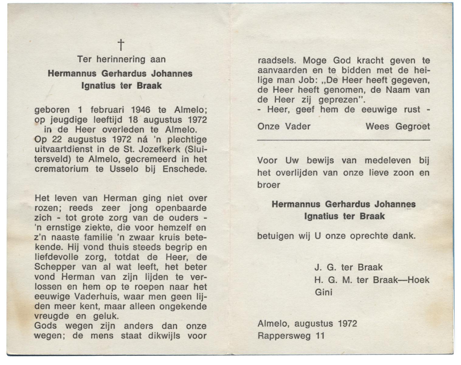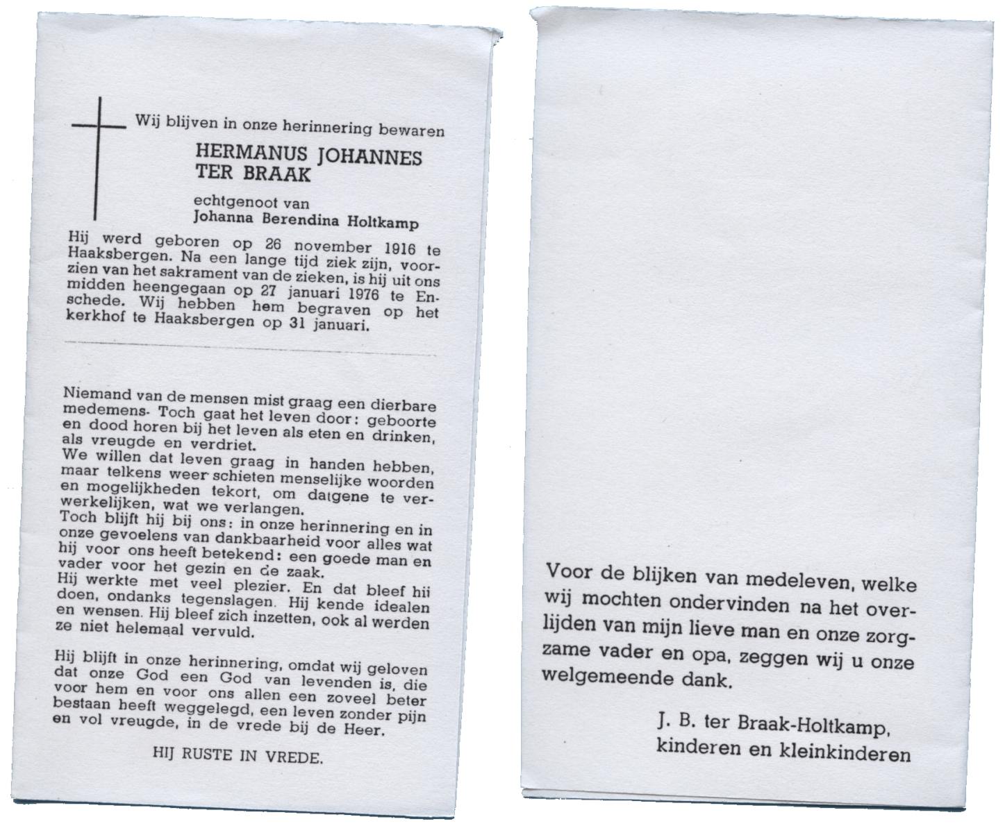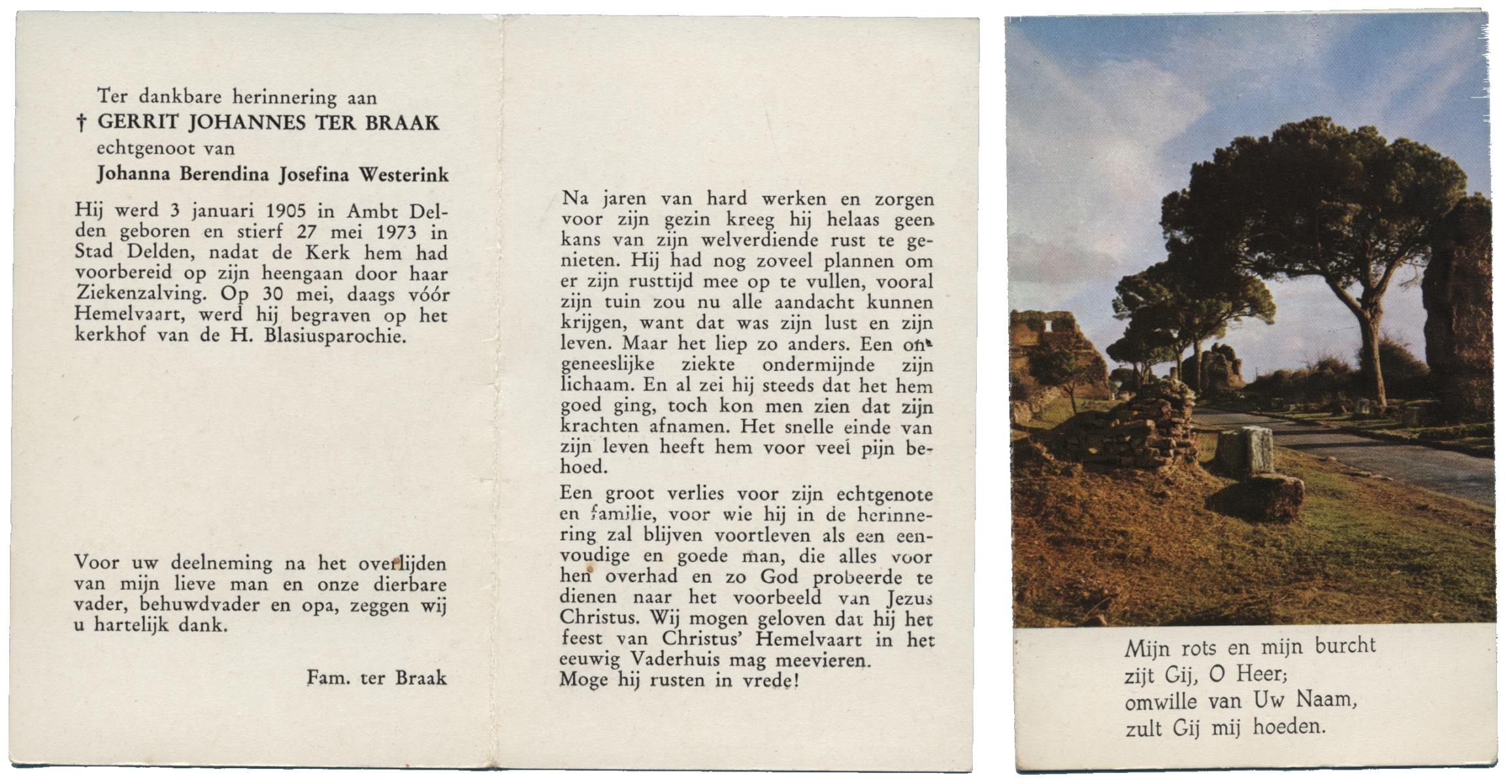 BRAAK, ter, Johan, geboren op 26-4-1904 te Delden, Ambt, overleden op 8-7-1975 te Hengelo (Ov.) op 71-jarige leeftijd, begraven op 12-7-1975 te Delden.