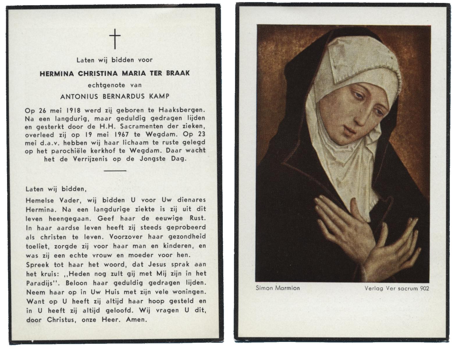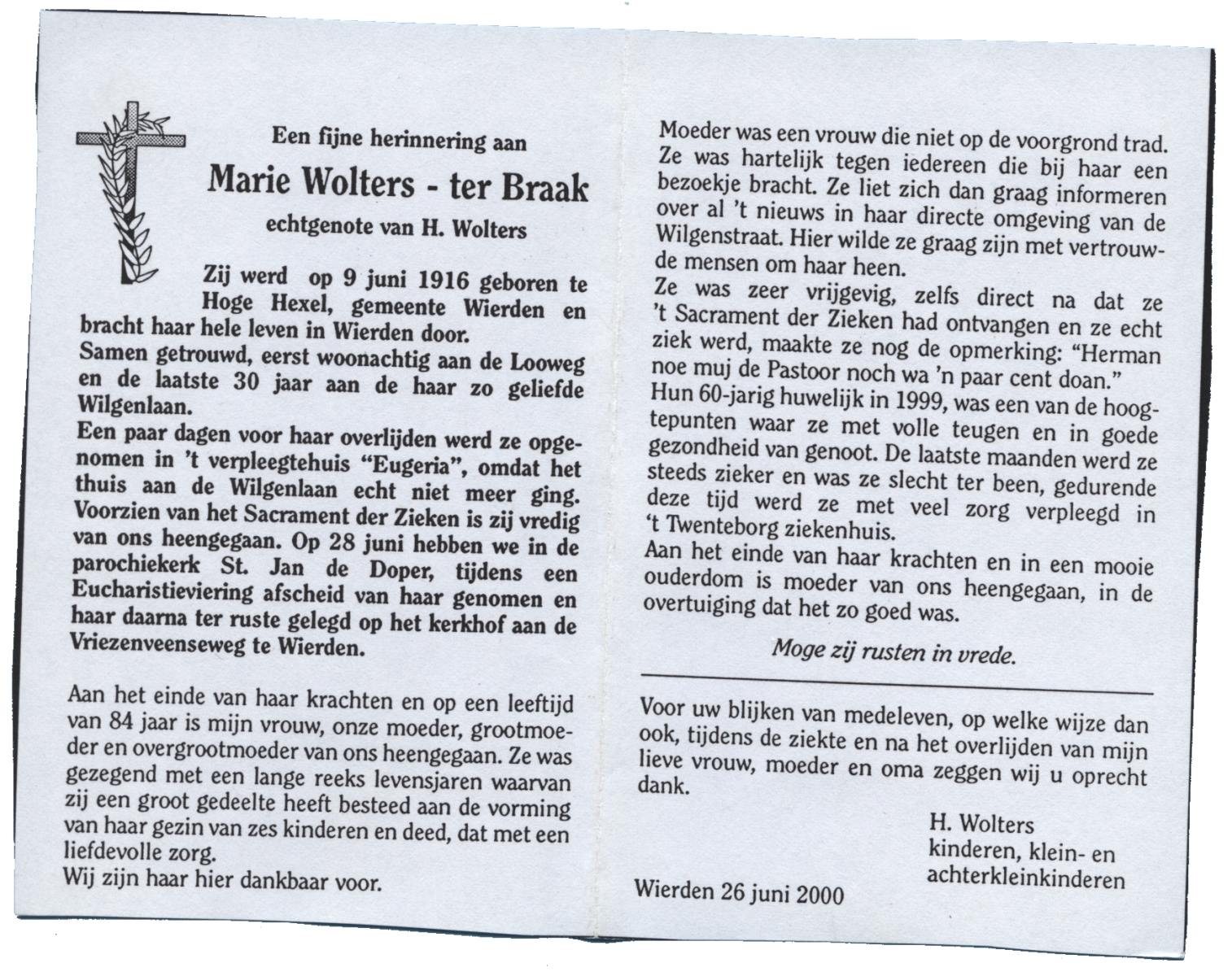 BRAAK, ter, Marie, geboren op 9-6-1916 te Hoge Hexel, Wierden, overleden te Almelo op 84-jarige leeftijd, begraven op 28-6-2000 te Wierden.