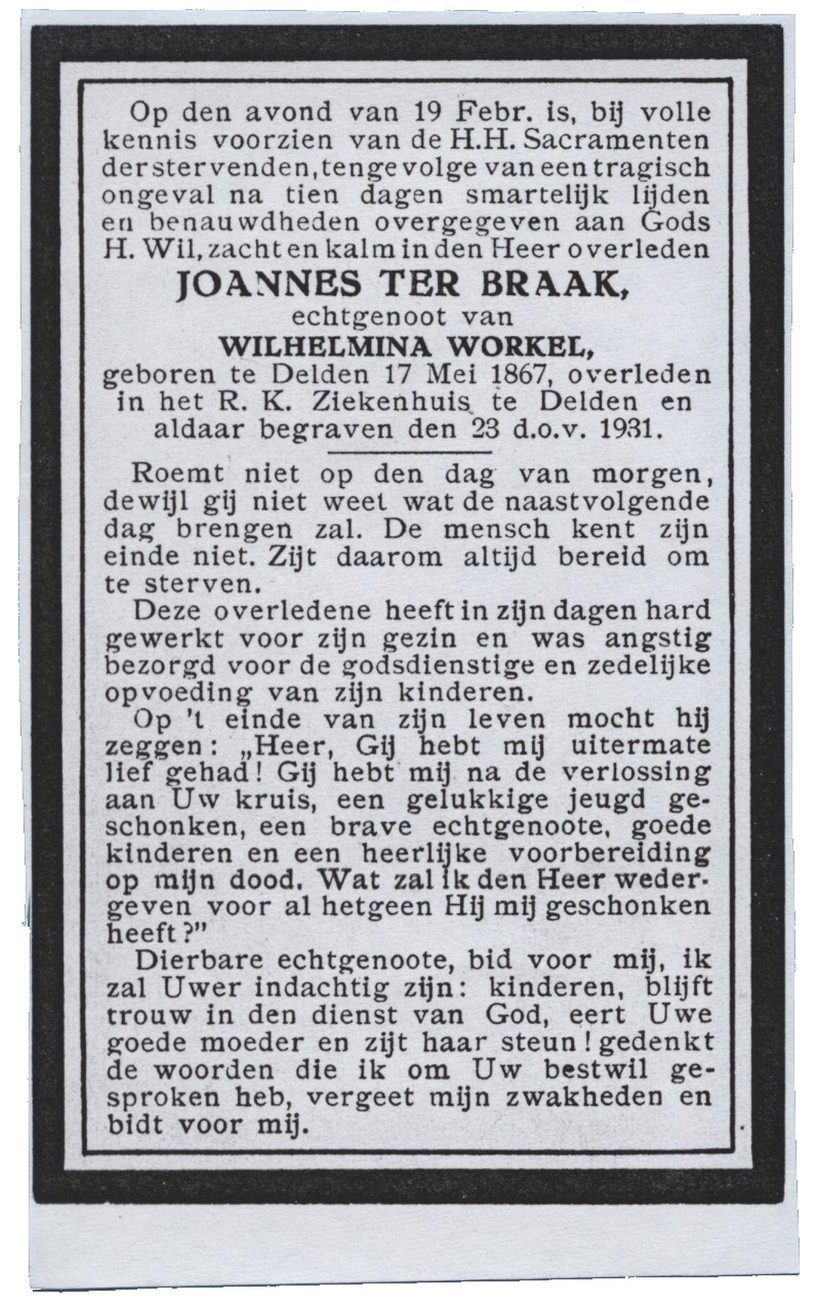 BRAAK, ter, Joannes, geboren op 17-05-1867 te Delden, overleden op 19-2-1931 te Delden, Stad op 63-jarige leeftijd, begraven op 23-2-1931 te Delden.
