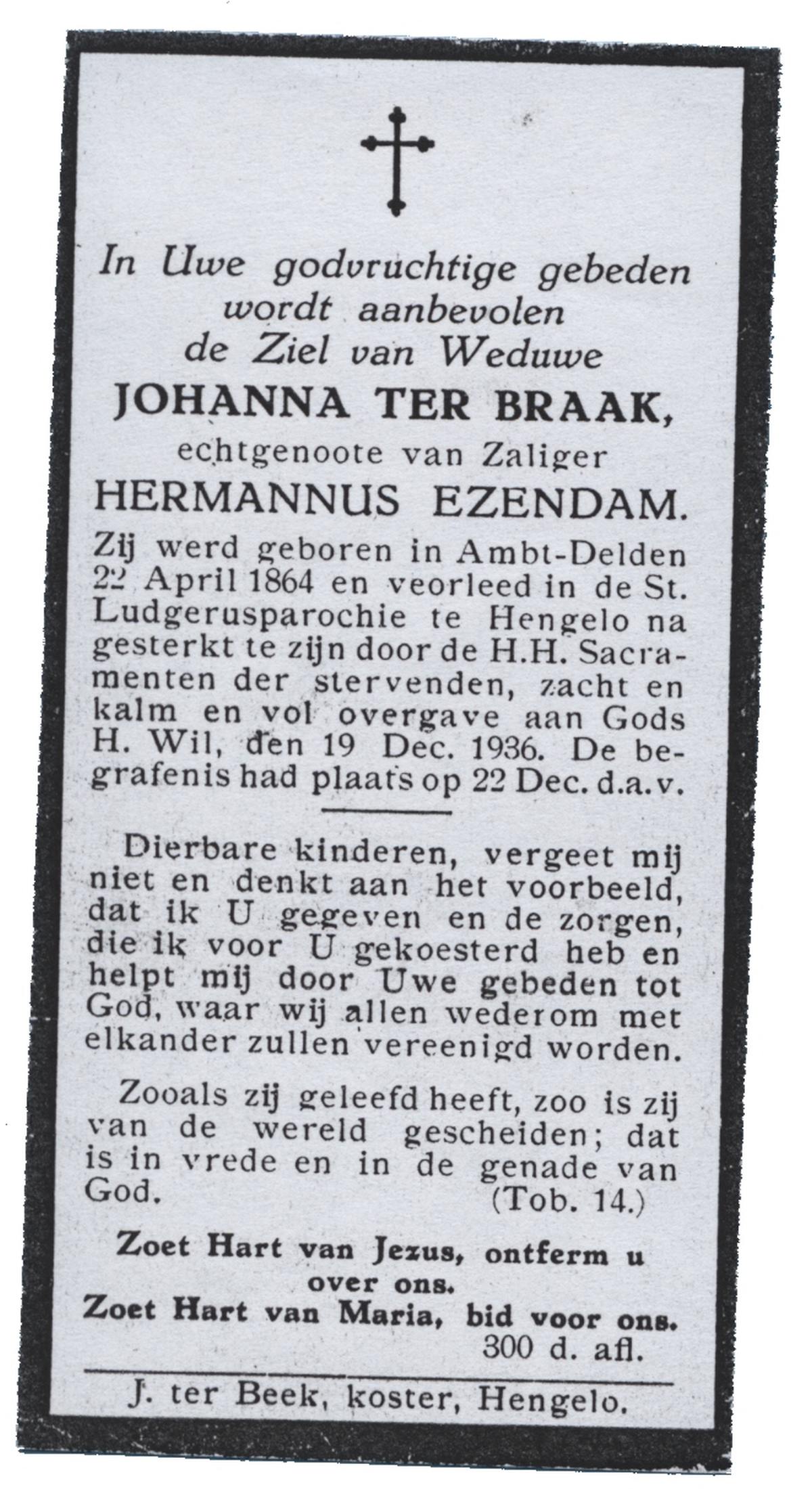 BRAAK, ter, Johanna, geboren op 22-04-1864 te Delden, Ambt, overleden op 19-12-1936 te Hengelo (Ov.) op 72-jarige leeftijd, begraven op 22-12-1936 te Hengelo (Ov.).