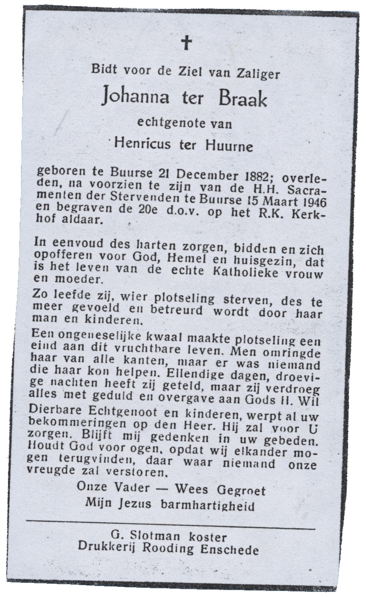BRAAK, ter, Johanna, geboren op 21-12-1882 te Buurse, overleden op 15-3-1946 te Buurse op 63-jarige leeftijd, begraven op 20-3-1946 te Buursen.