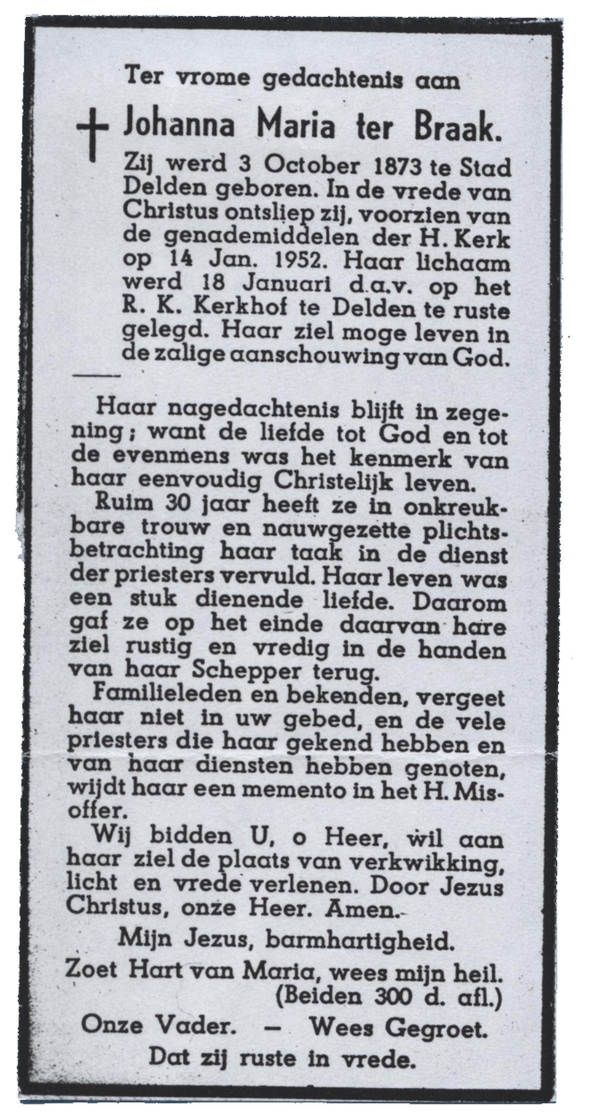 BRAAK, ter, Johanna Maria, geboren op 03-10-1873 te Delden, Stad, overleden op 14-1-1952 op 78-jarige leeftijd, begraven op 18-1-1952 te Delden.