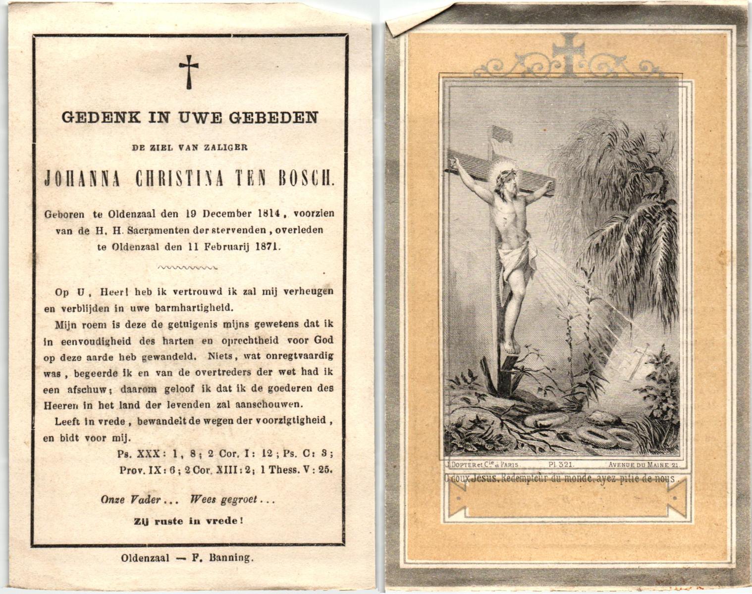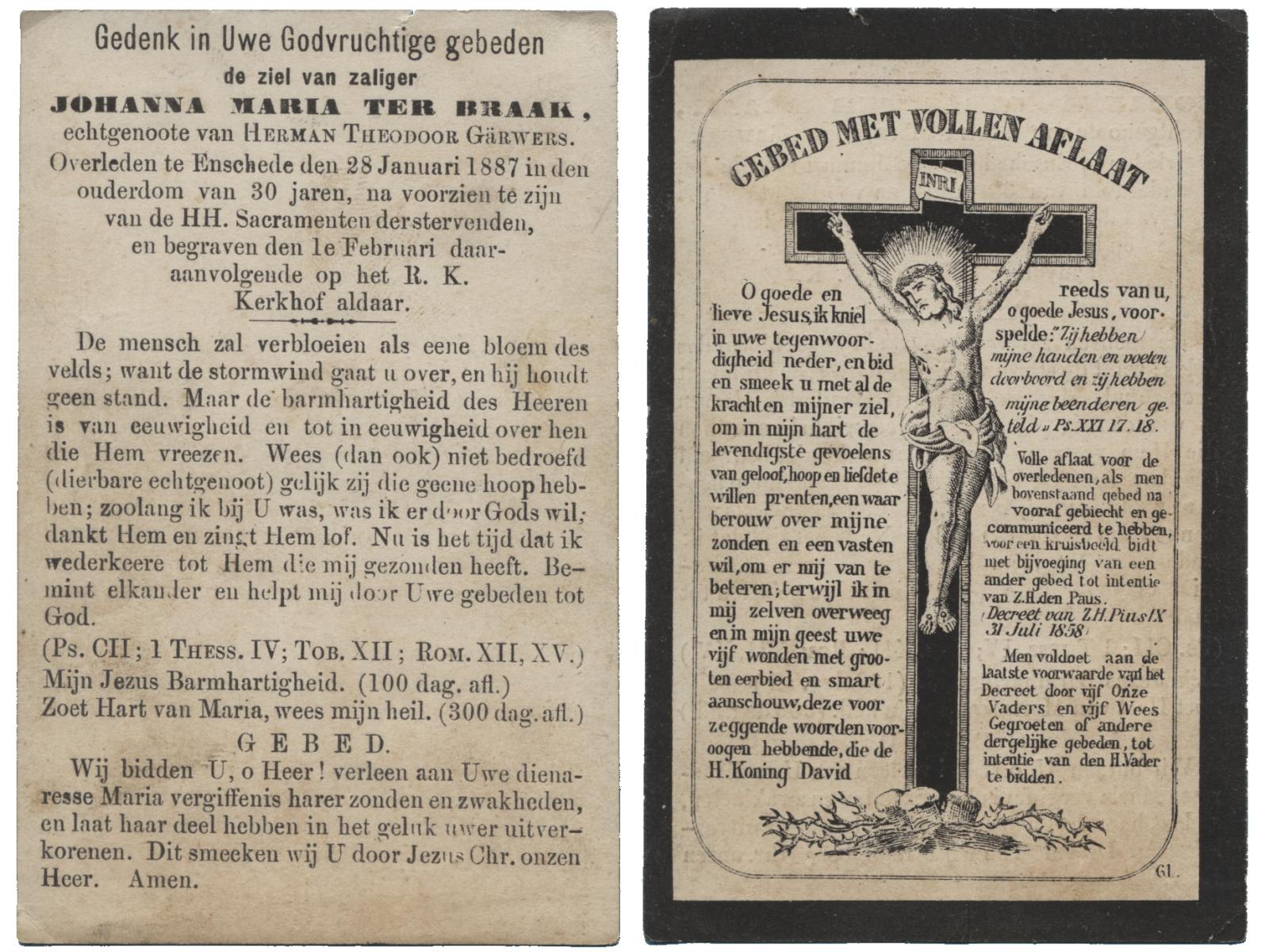 BRAAK, ter, Johanna Maria, overleden op 28-01-1887 te Enschede op 30-jarige leeftijd, begraven op 01-02-1887 te Enschede.