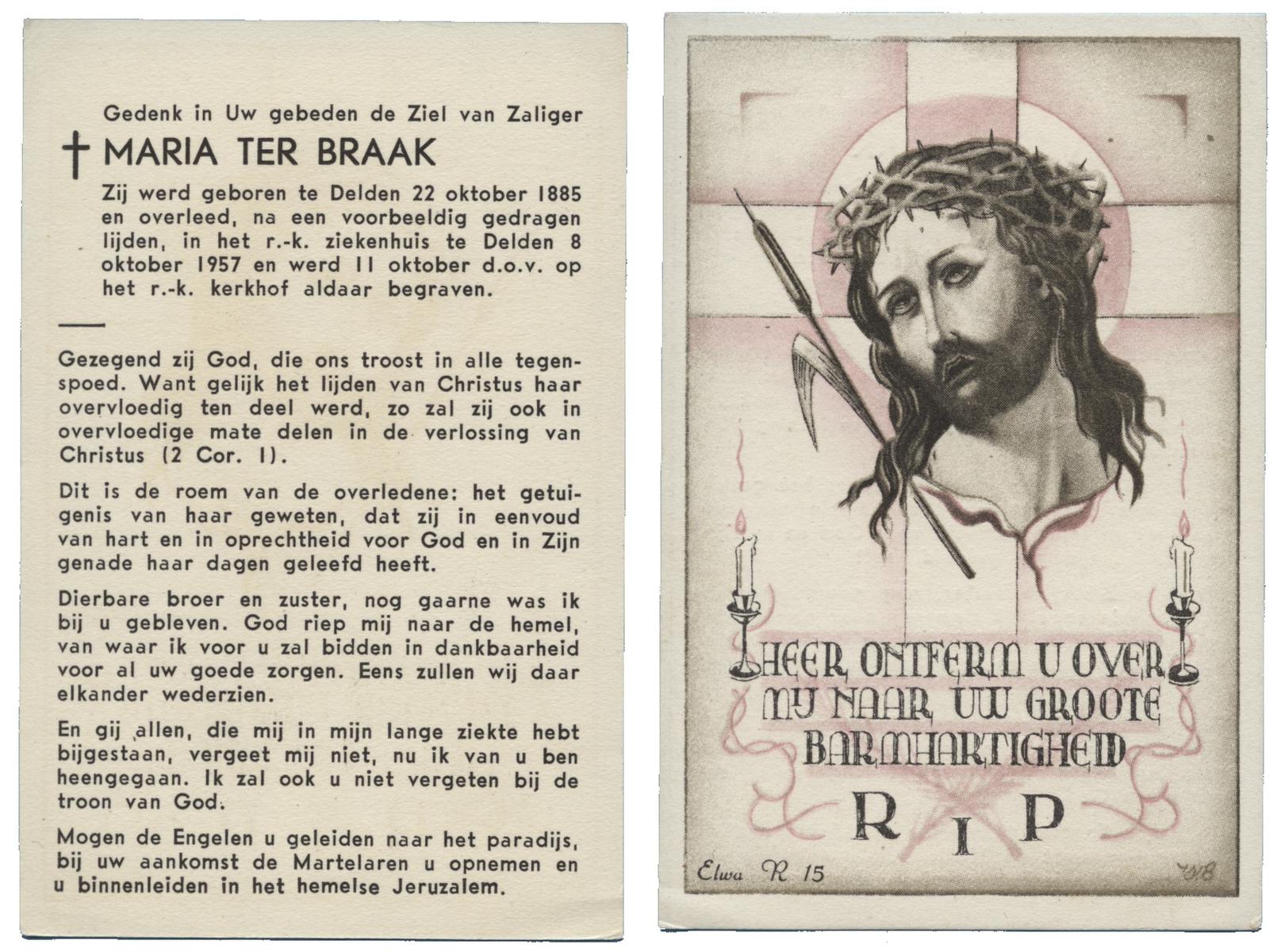BRAAK, ter, Maria, geboren op 22-10-1885 te Delden, overleden op 8-10-1957 te Delden, Stad op 71-jarige leeftijd, begraven op 11-10-1957.
