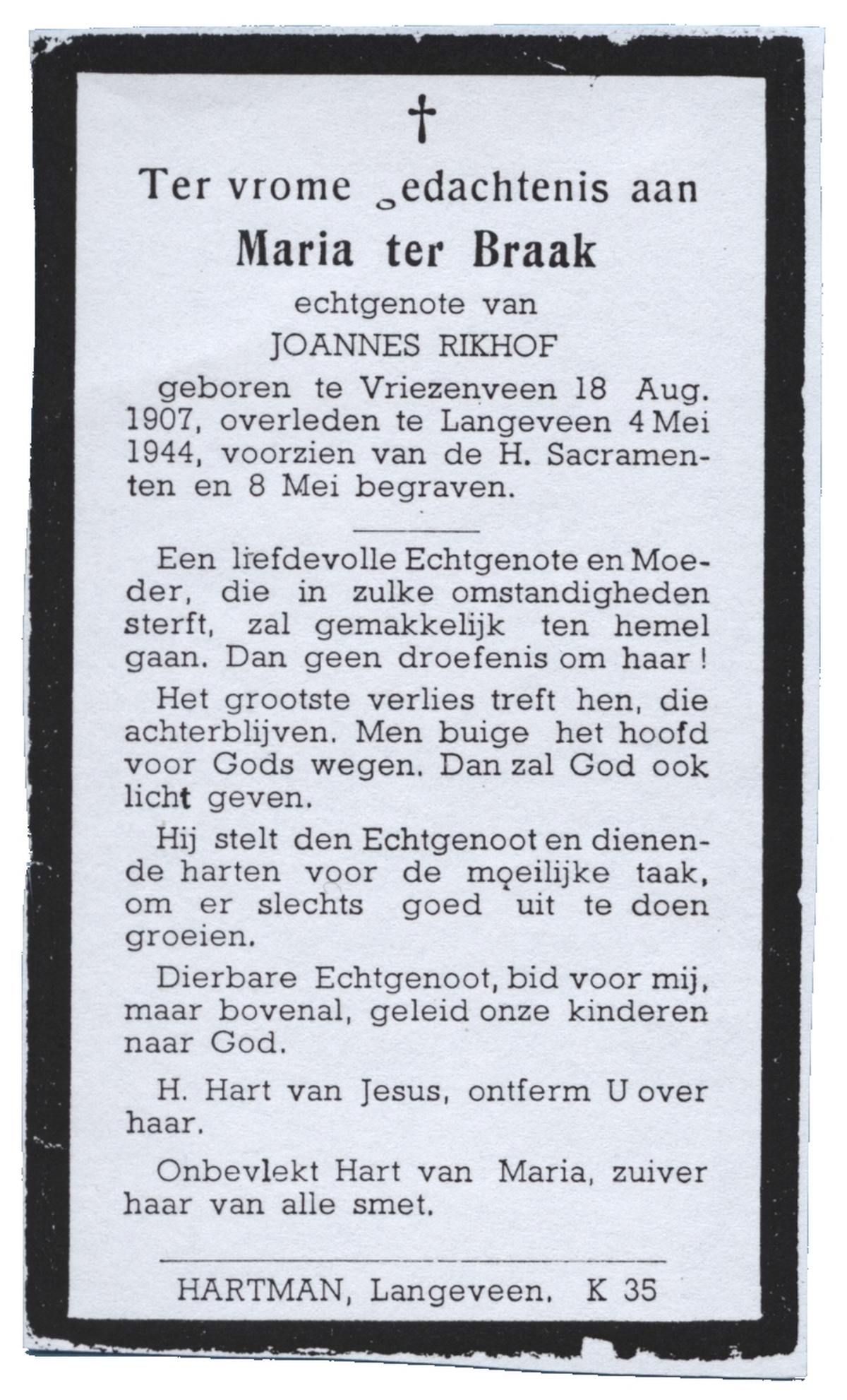BRAAK, ter, Maria, geboren op 18-8-1907 te Vriezenveen, overleden op 4-5-1944 te Langeveen op 36-jarige leeftijd, begraven op 8-5-1944 te Langeveen.