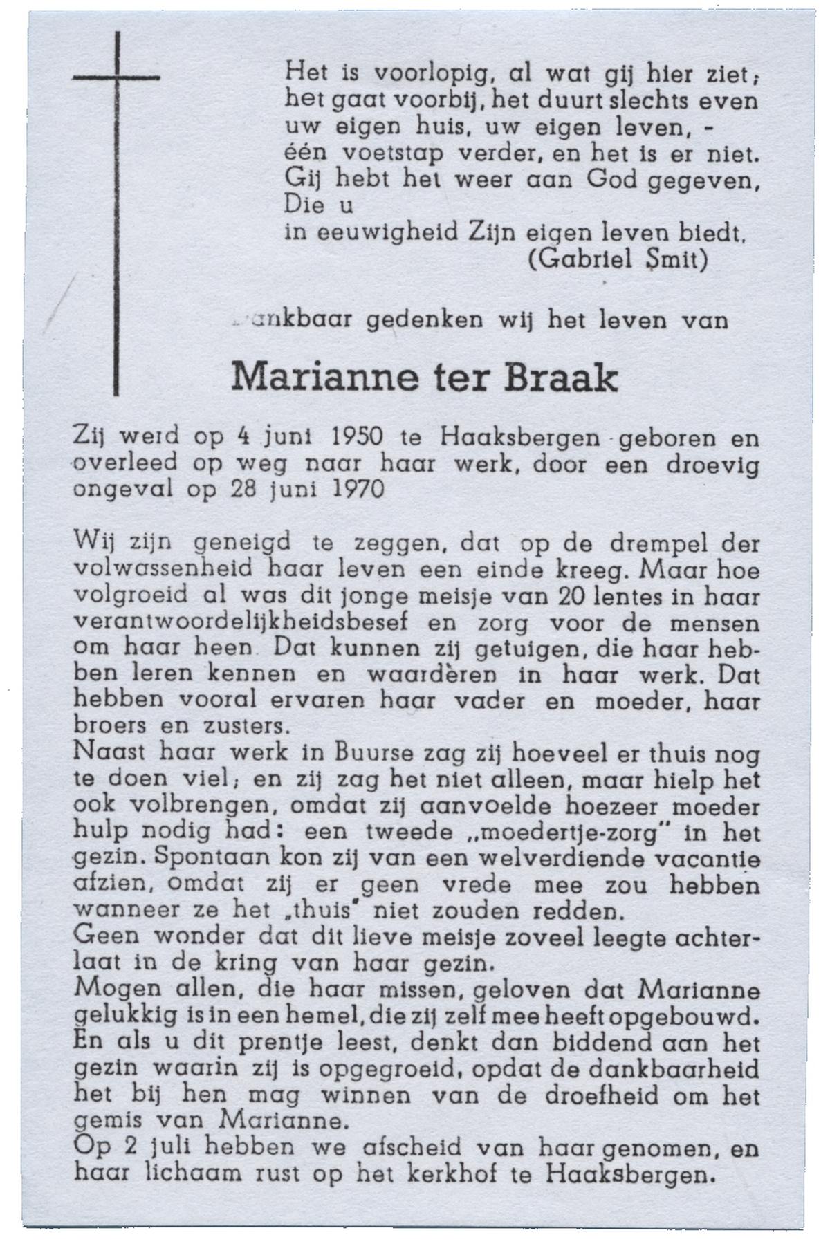 BRAAK, ter, Marianne, geboren op 4-6-1950 te Haaksbergen, overleden op 28-6-1970 op 20-jarige leeftijd, begraven op 2-7-1970 te Haaksbergen.