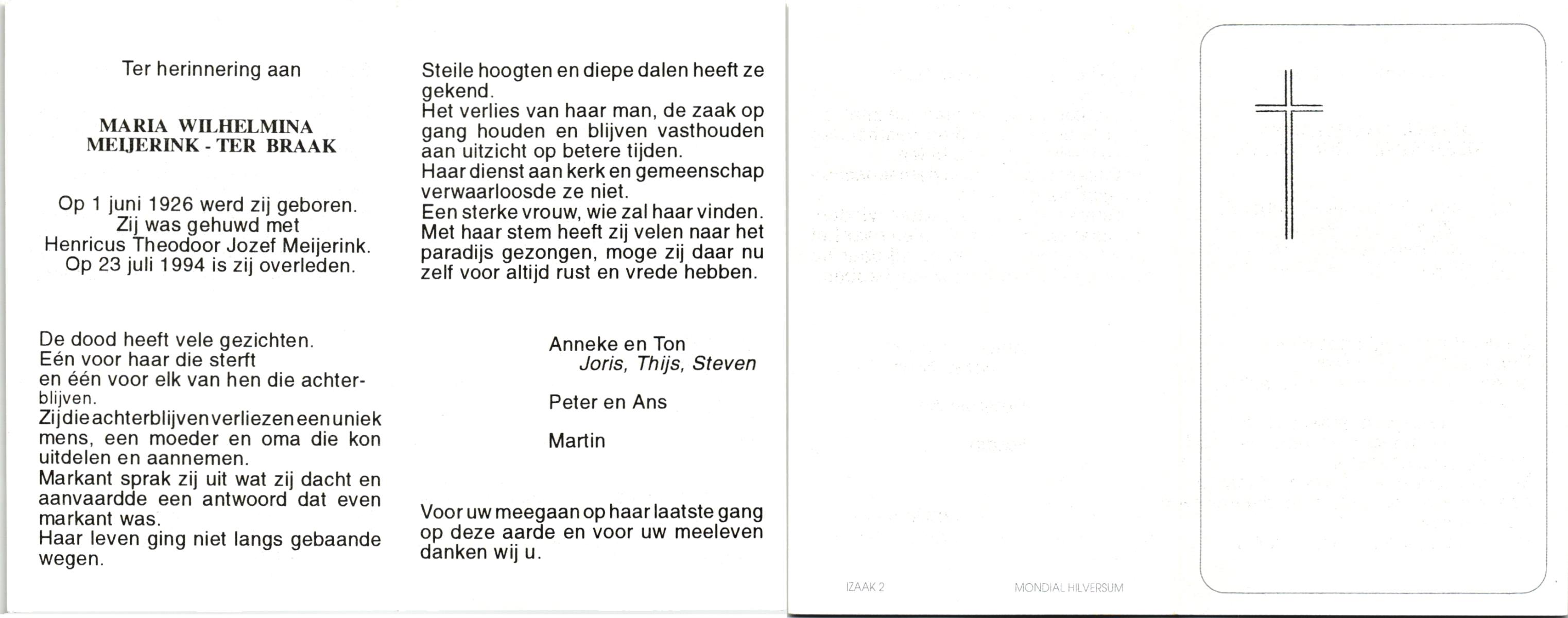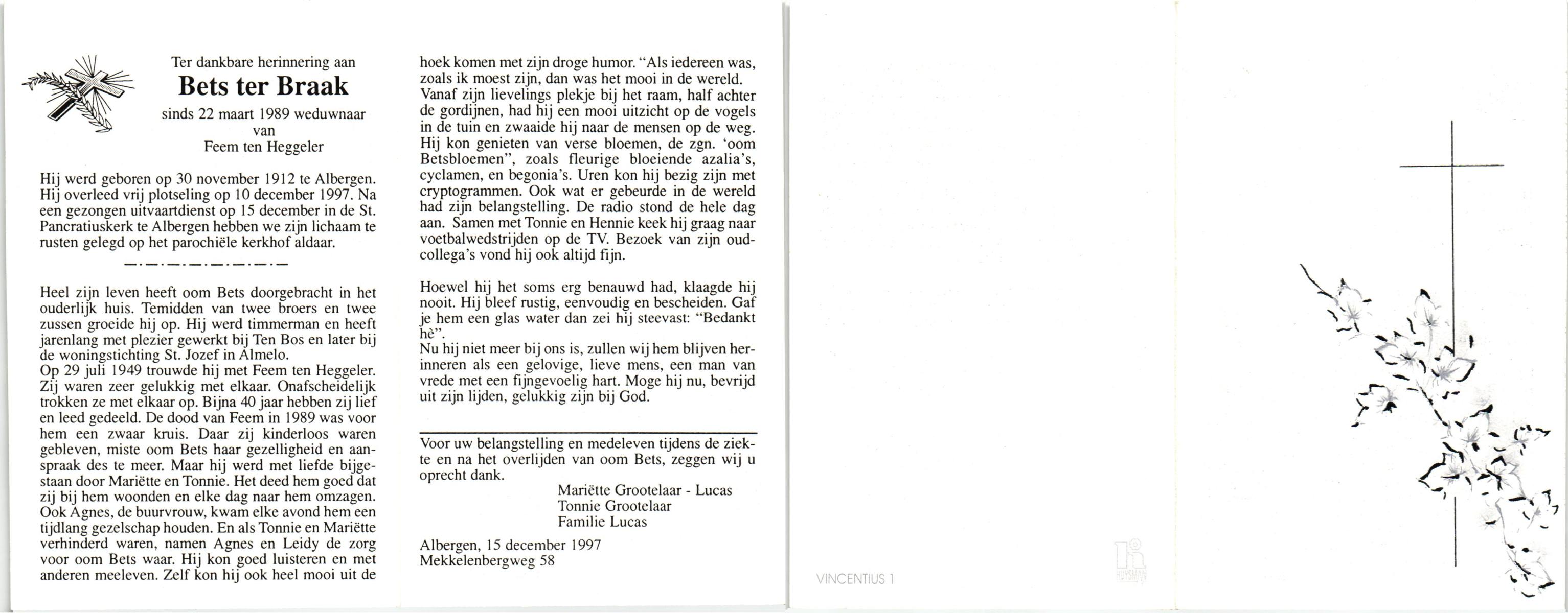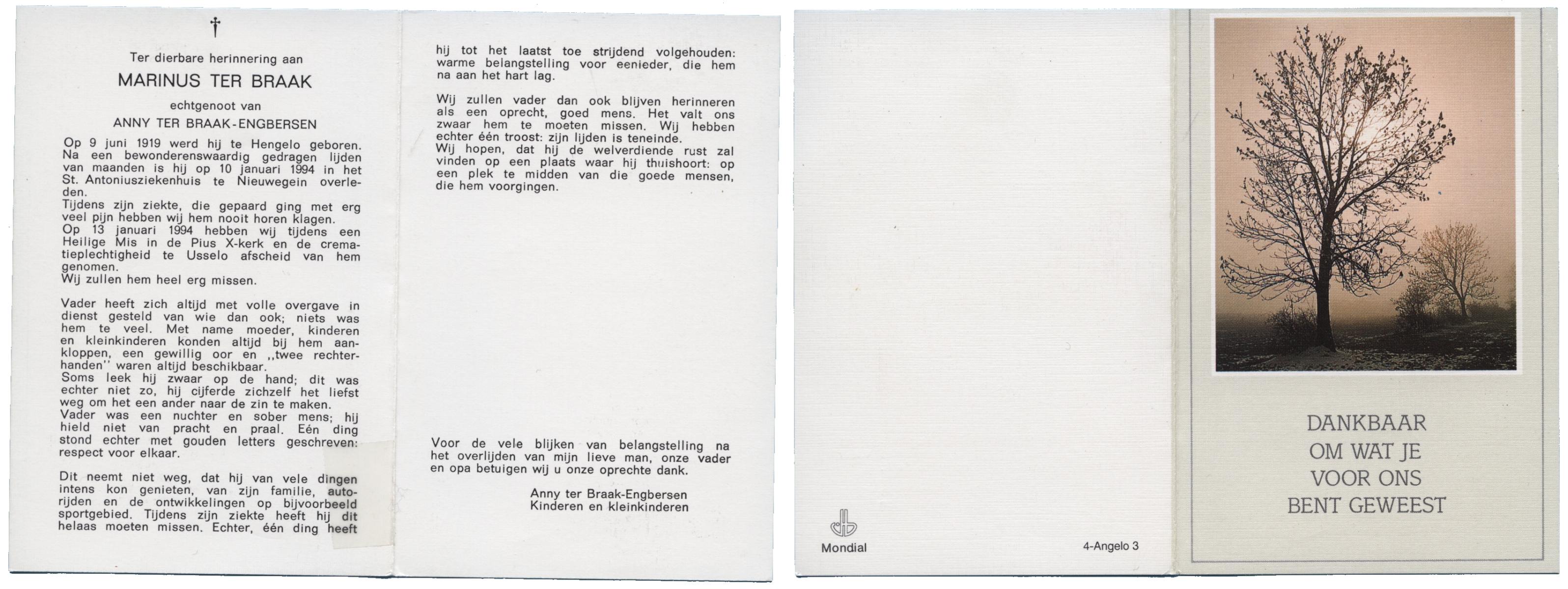 BRAAK, ter, Marinus, geboren op 9-6-1919 te Hengelo (O), overleden op 10-1-1994 te Nieuwegein op 74-jarige leeftijd, gecremeerd op 13-1-1994 te Usselo.