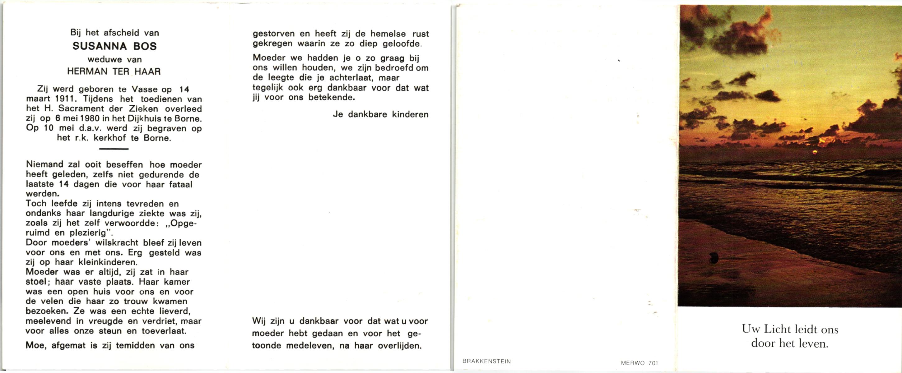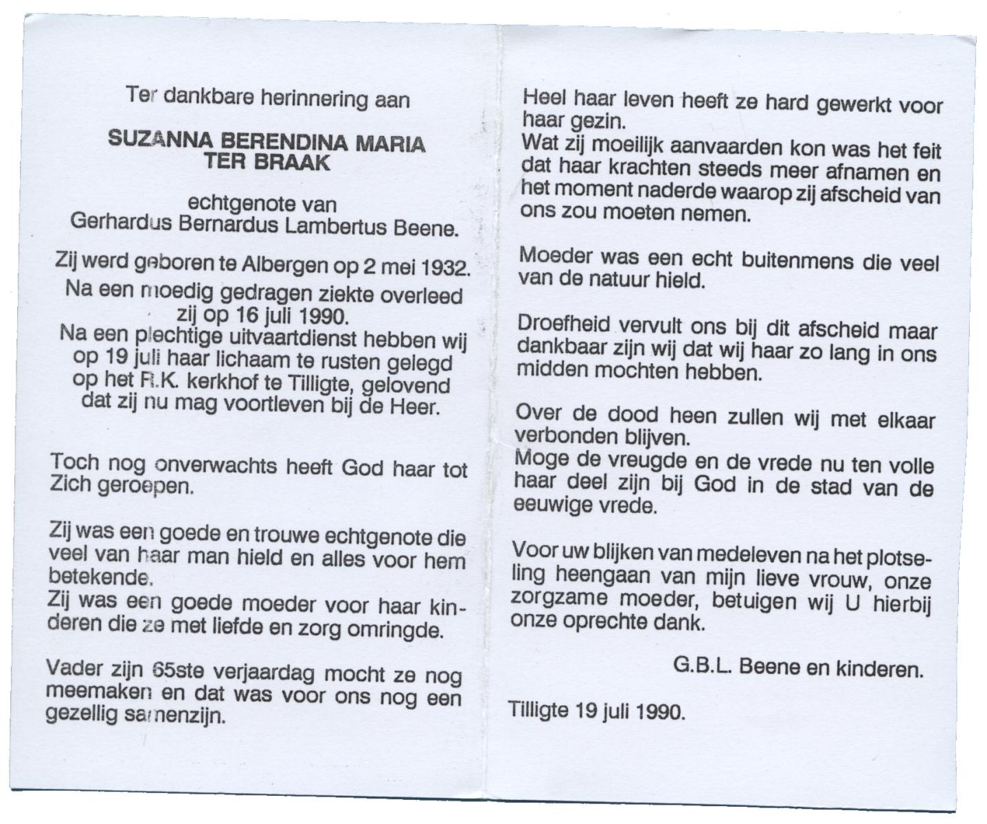 BRAAK, ter, Suzanna Berendina Maria, geboren op 2-5-1932 te Albergen, overleden op 16-7-1990 op 58-jarige leeftijd, begraven op 19-7-1990 te Tilligte.