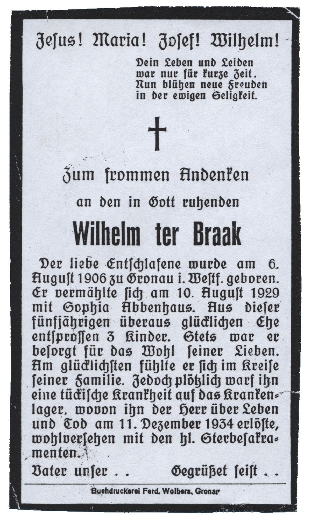 BRAAK, ter, Wilhelm, geboren op 6-8-1906 te Gronau (Dld.), overleden op 11-12-1934 op 28-jarige leeftijd.