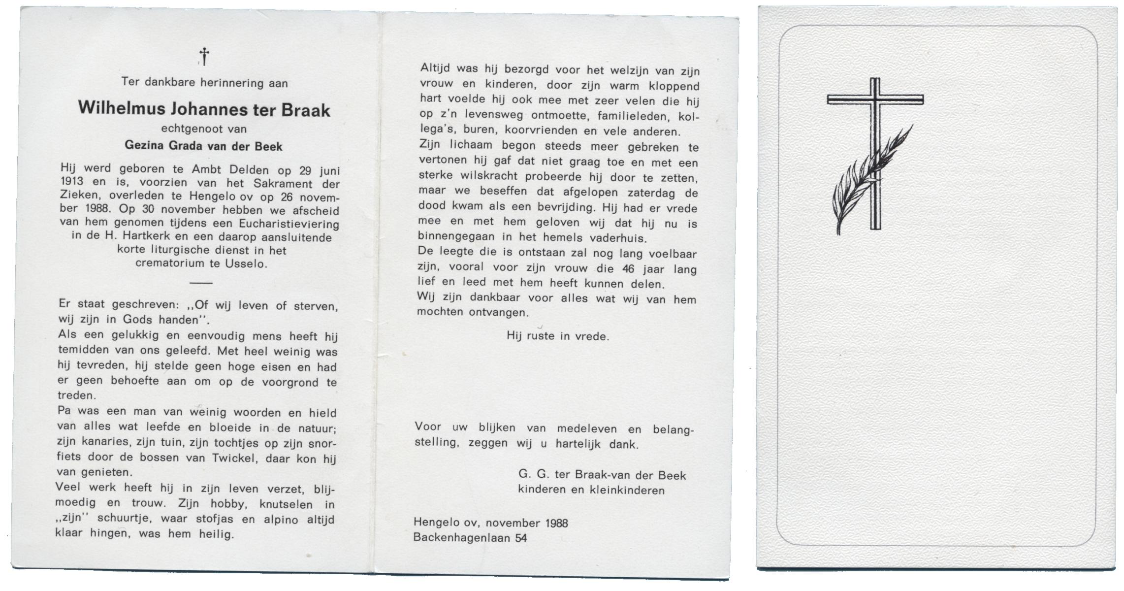 BRAAK, ter, Wilhelmus Johannes, geboren op 29-6-1913 te Delden, Ambt, overleden op 26-11-1988 te Hengelo (Ov.) op 75-jarige leeftijd, gecremeerd op 30-11-1988 te Usselo.