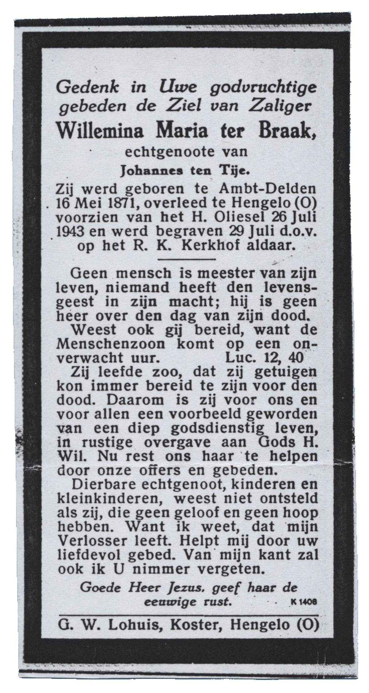 BRAAK, ter, Willemina Maria, geboren op 16-05-1871 te Delden, Ambt, overleden op 26-7-1943 te Hengelo (Ov.) op 72-jarige leeftijd, begraven op 29-7-1943 te Hengelo (Ov.).