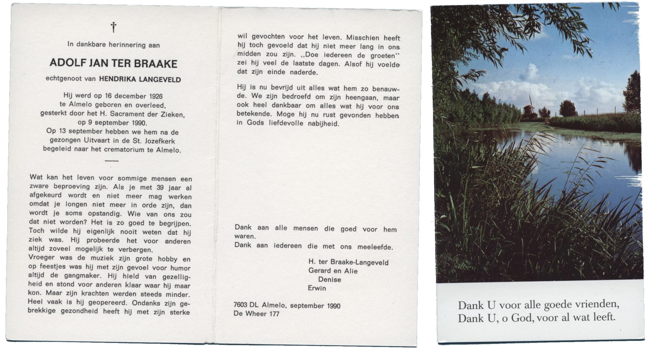 BRAAKE, ter, Adolf Jan, geboren op 16-12-1926 te Almelo, overleden op 9-9-1990 op 63-jarige leeftijd, gecremeerd op 13-9-1990 te Almelo.