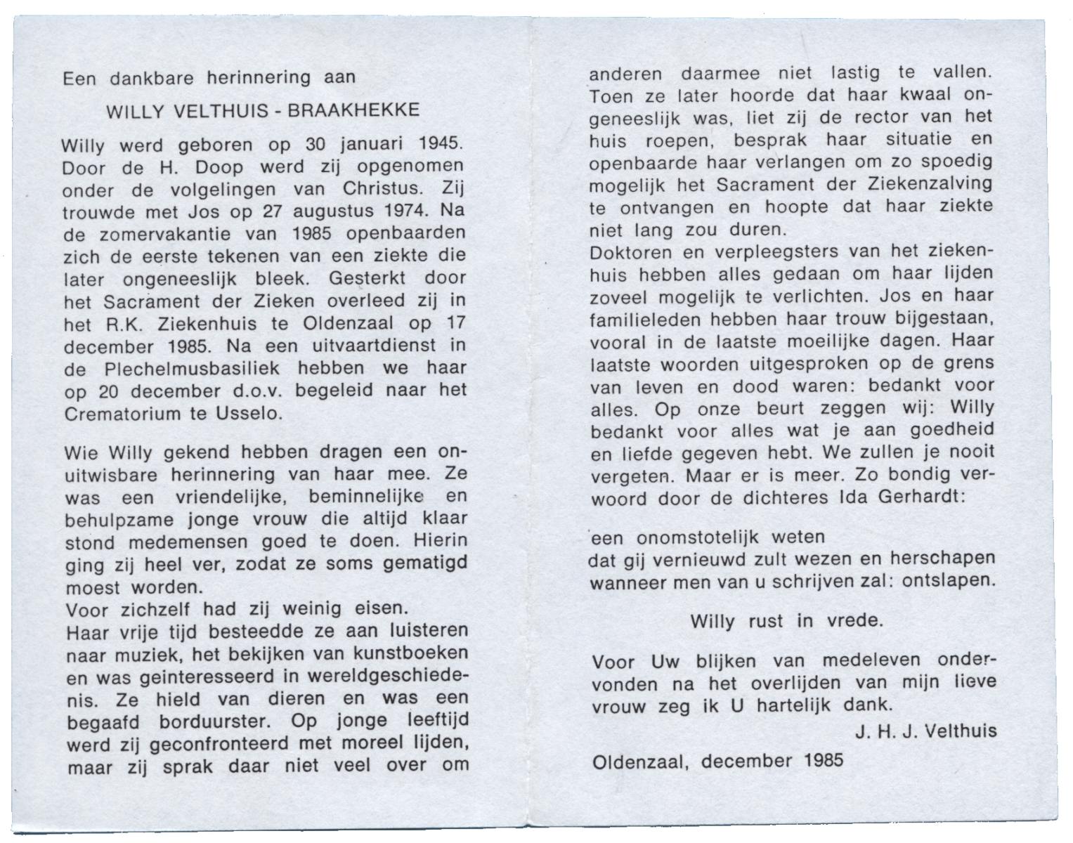BRAAKHEKKE, Willy, geboren op 30-1-1945, overleden op 17-12-1985 te Oldenzaal op 40-jarige leeftijd, gecremeerd op 20-12-1985 te Usselo.