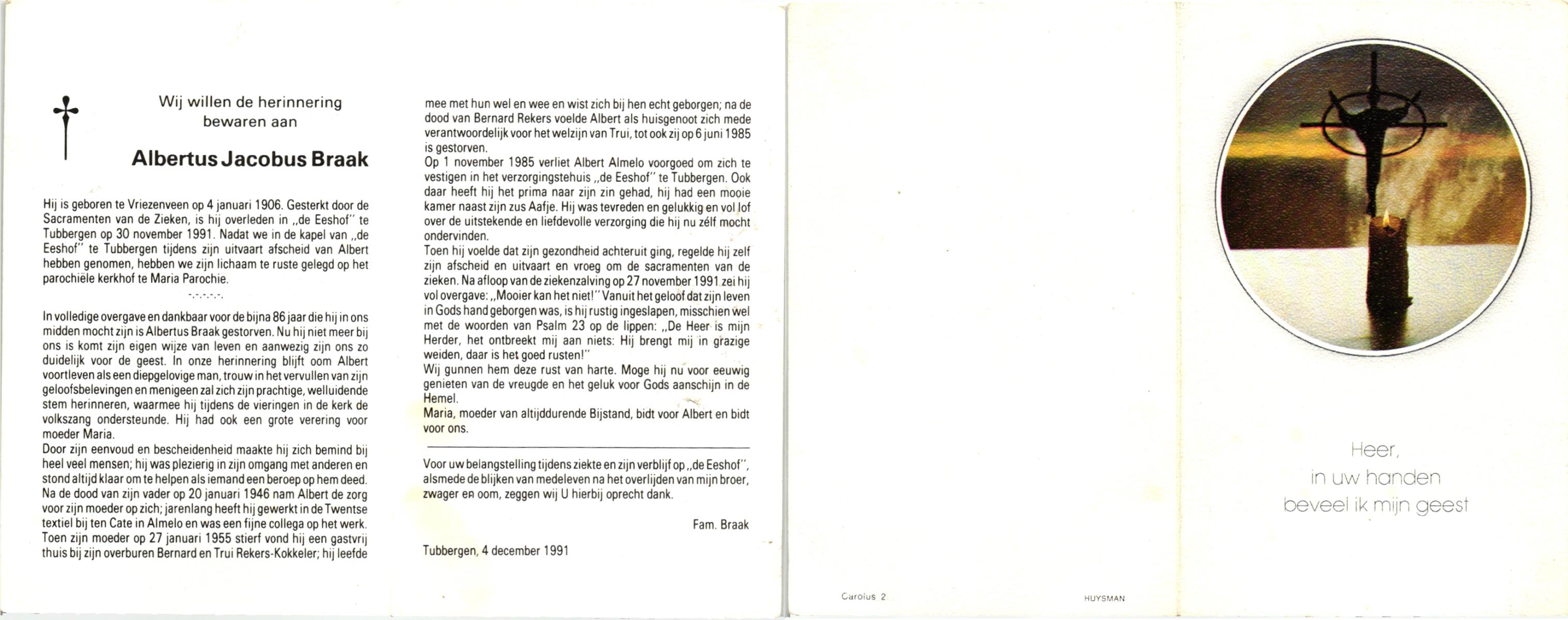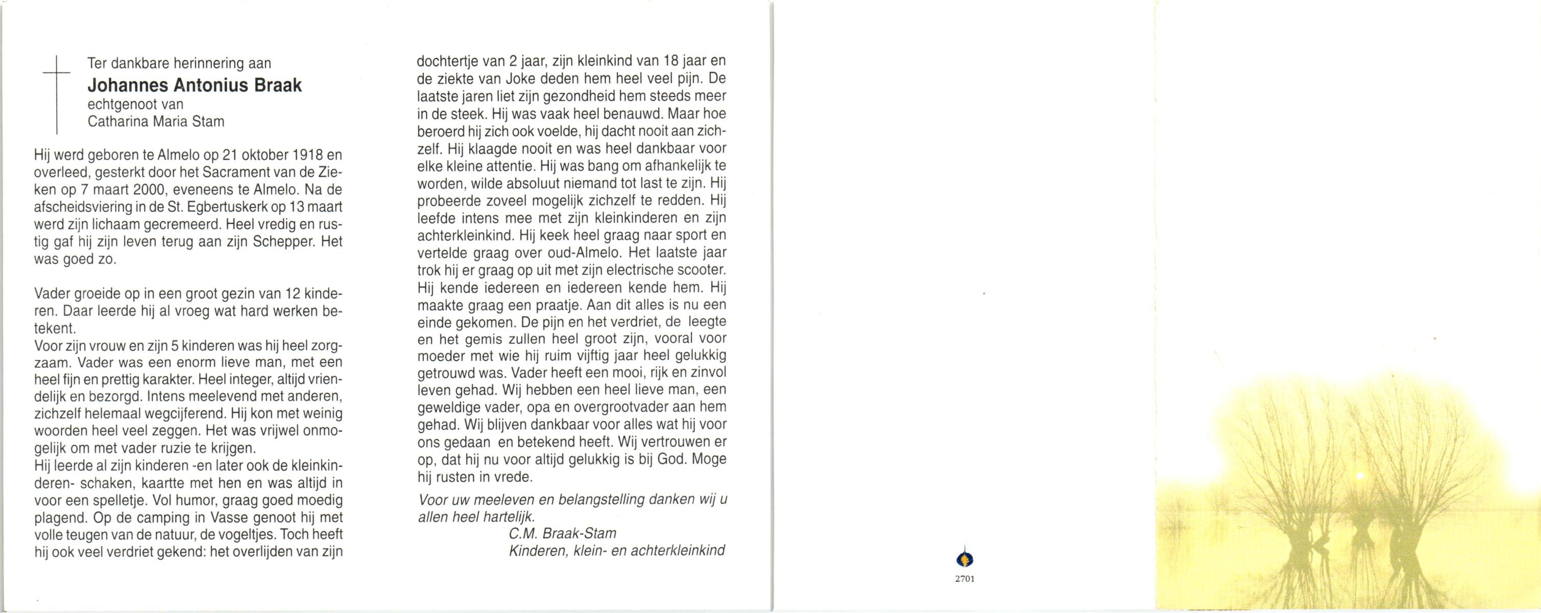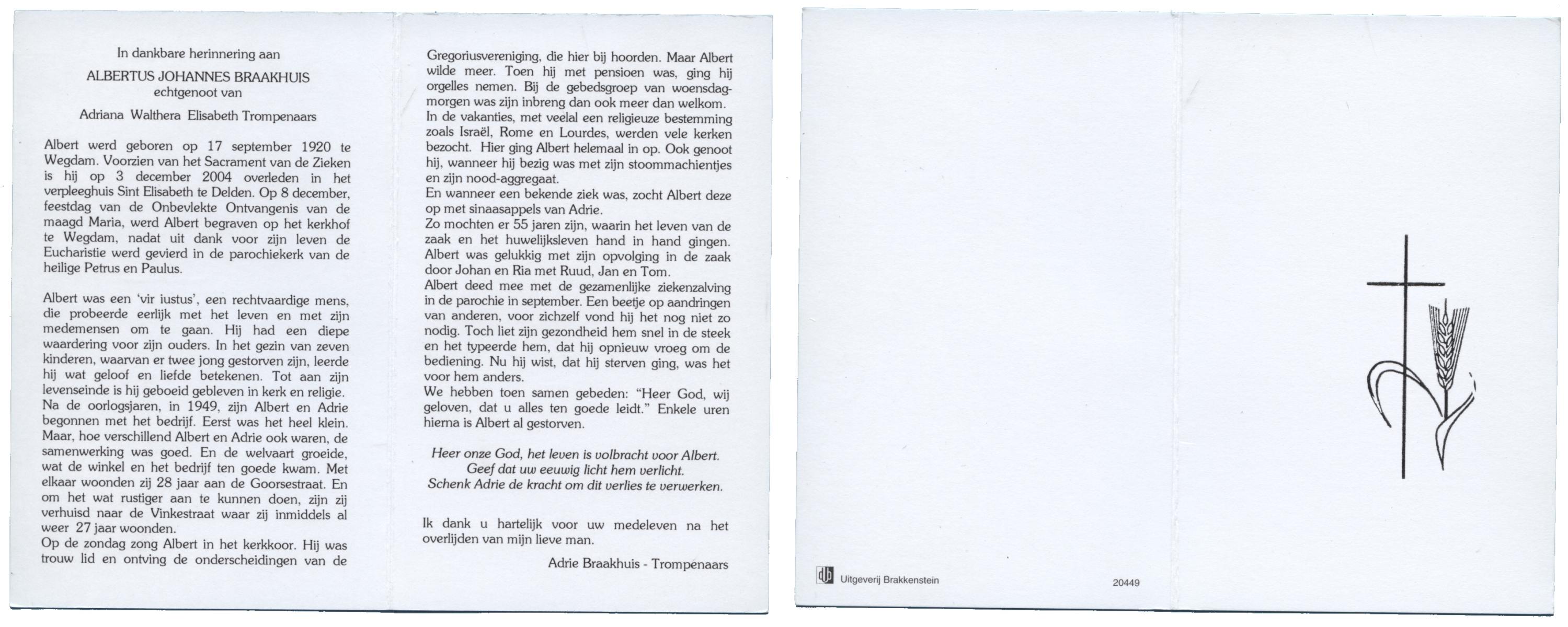 BRAAKHUIS, Albertus Johannes, geboren op 17-9-1920 te Wegdam, overleden op 3-12-2004 te Delden op 84-jarige leeftijd, begraven op 8-12-2004 te Wegdam.