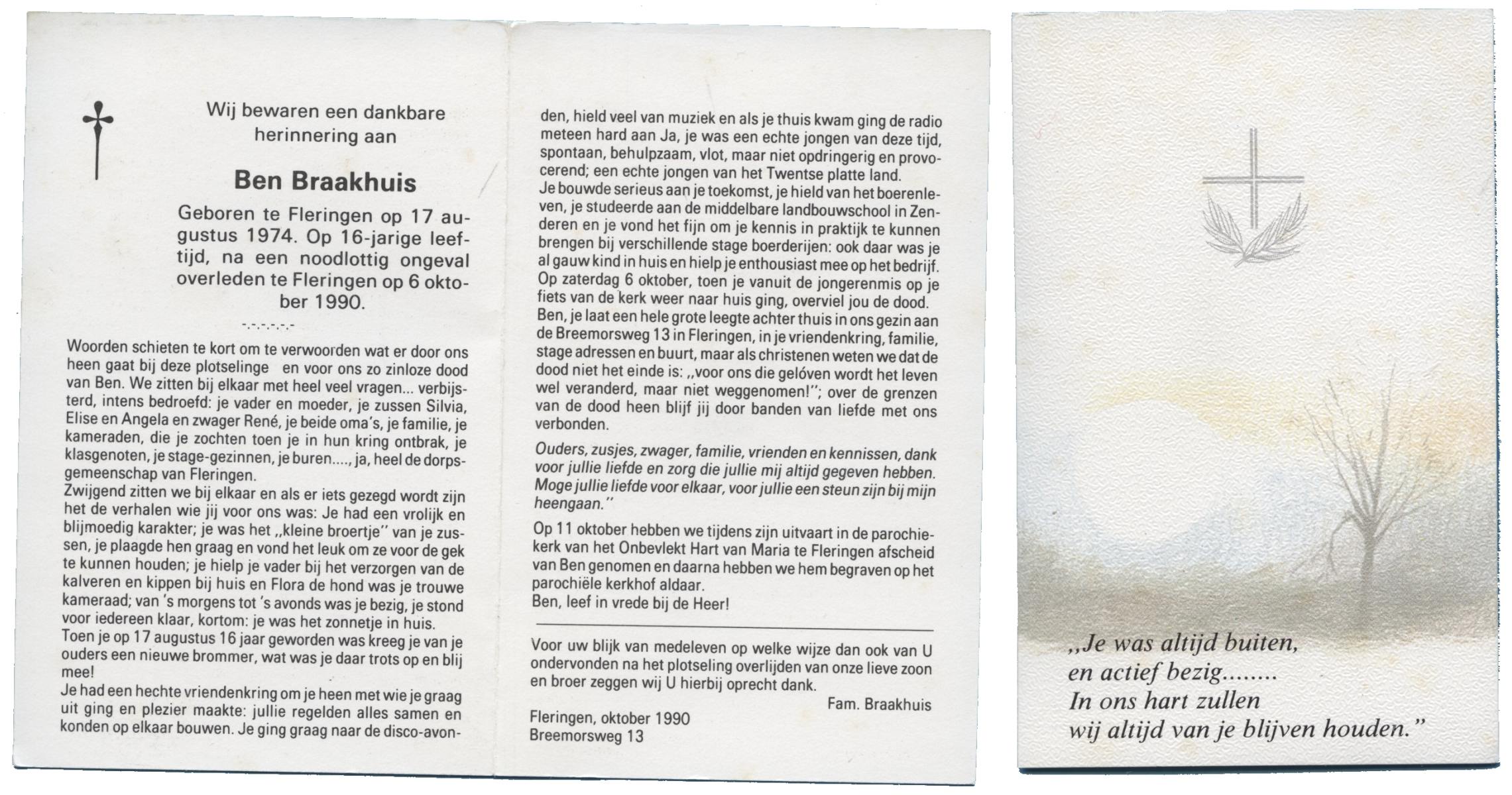 BRAAKHUIS, Ben, geboren op 17-8-1974 te Fleringen, overleden op 6-10-1990 te Fleringen op 16-jarige leeftijd, begraven op 11-10-1990 te Fleringen.