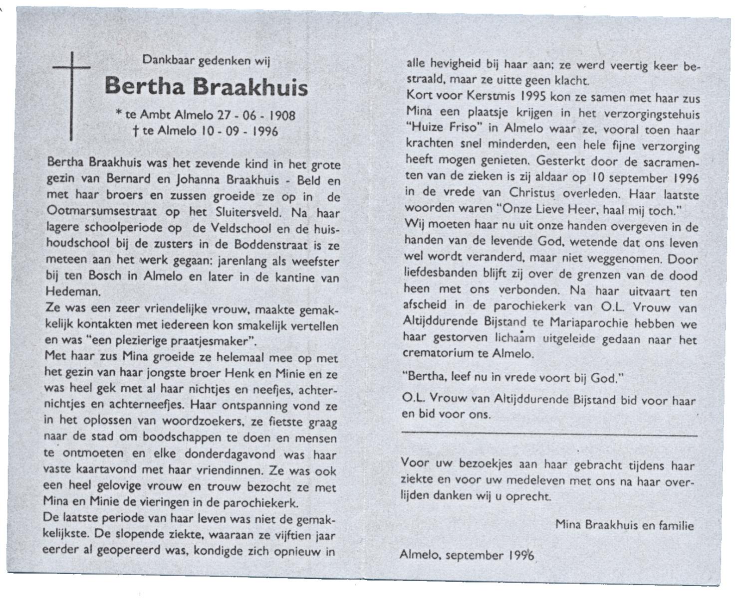 BRAAKHUIS, Bertha, geboren op 27-6-1908 te Almelo, Ambt, overleden op 10-9-1996 te Almelo op 88-jarige leeftijd, gecremeerd te Almelo.
