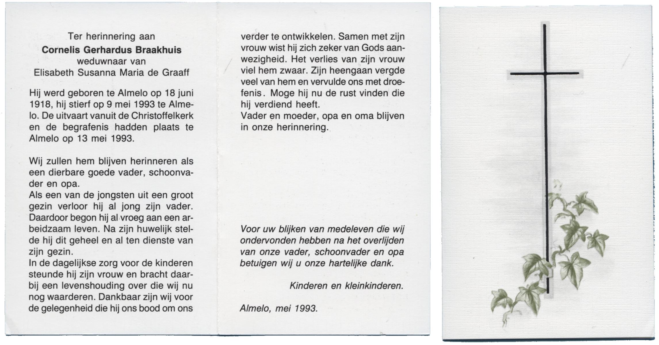 BRAAKHUIS, Cornelis Gerhardus, geboren op 18-6-1918 te Almelo, overleden op 9-5-1993 te Almelo op 74-jarige leeftijd, begraven op 13-5-1993 te Almelo.