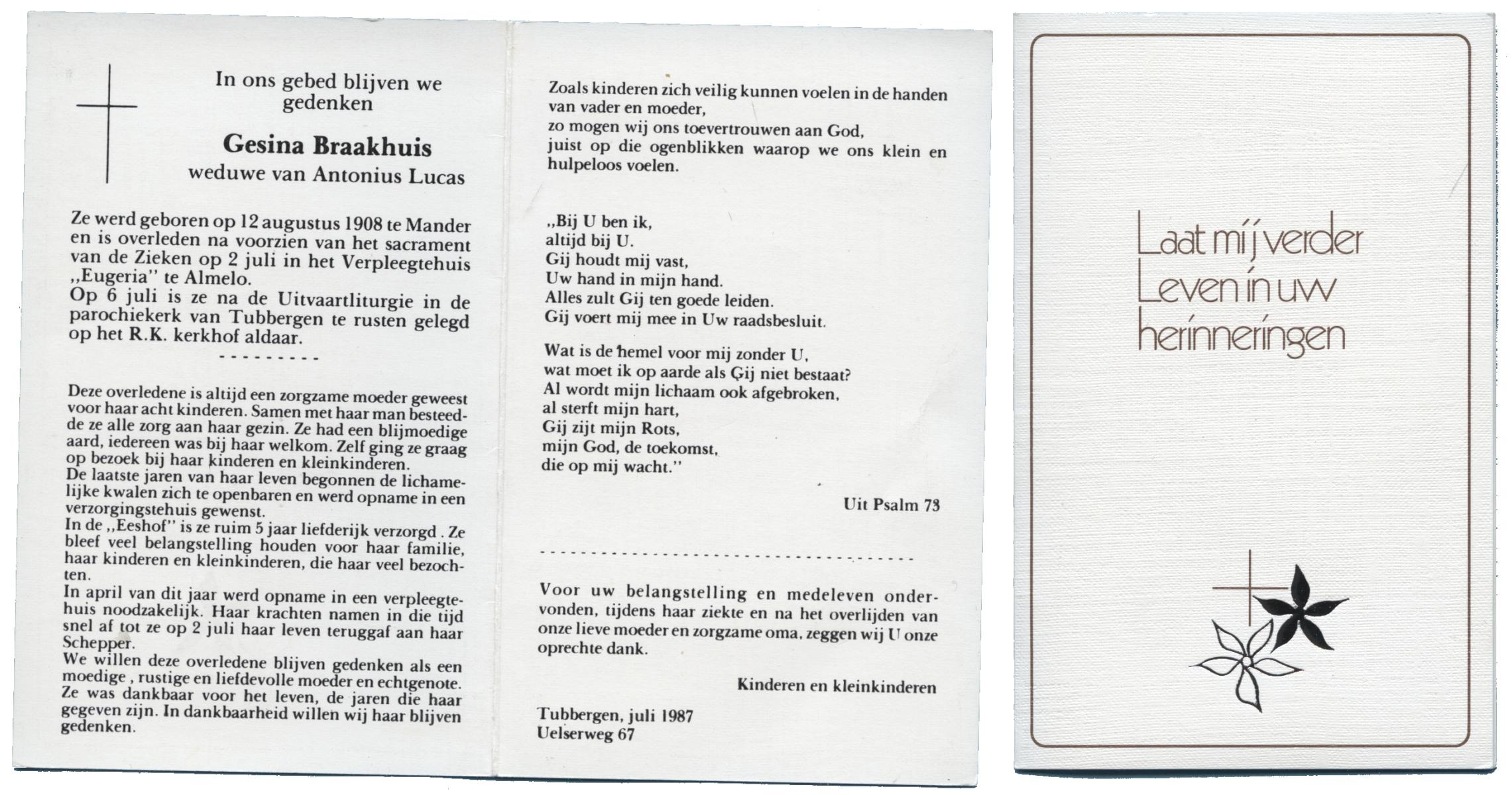 BRAAKHUIS, Gesina, geboren op 12-8-1908 te Mander, overleden op 2-7-1987 te Almelo op 78-jarige leeftijd, begraven op 6-7-1987 te Tubbergen.