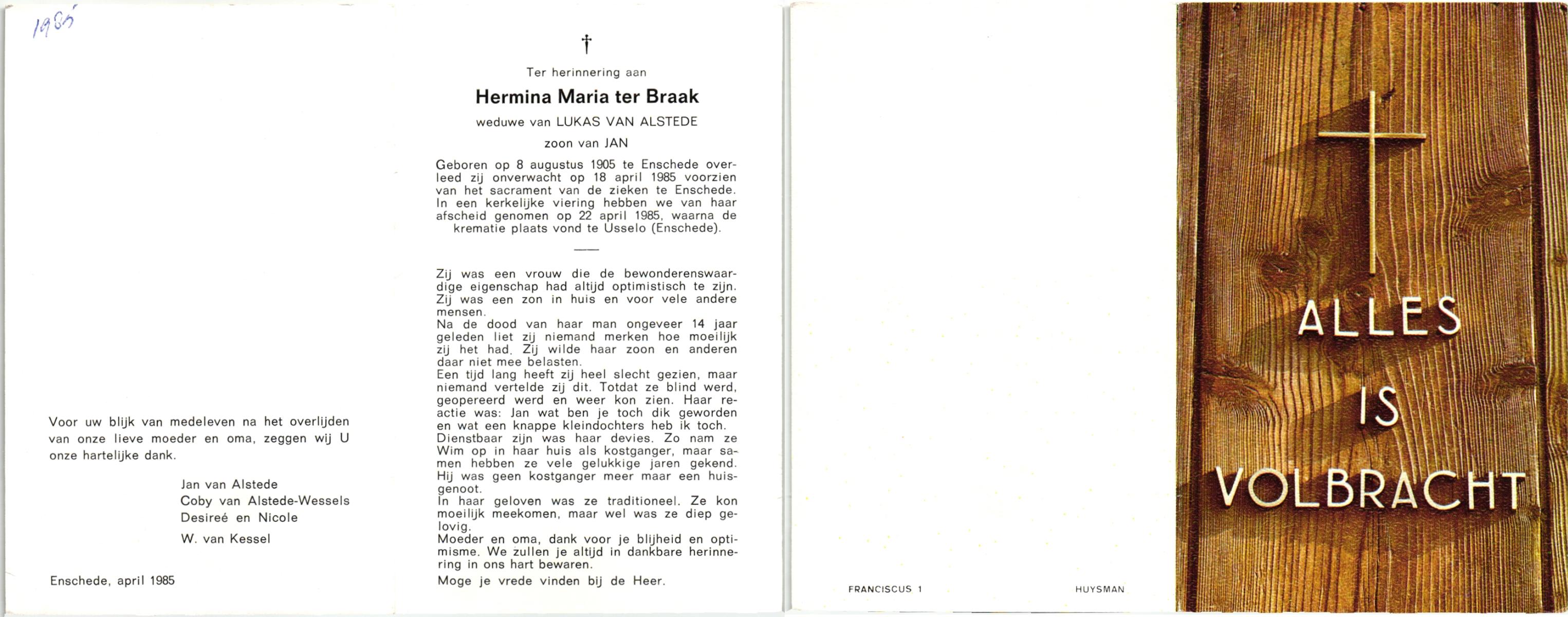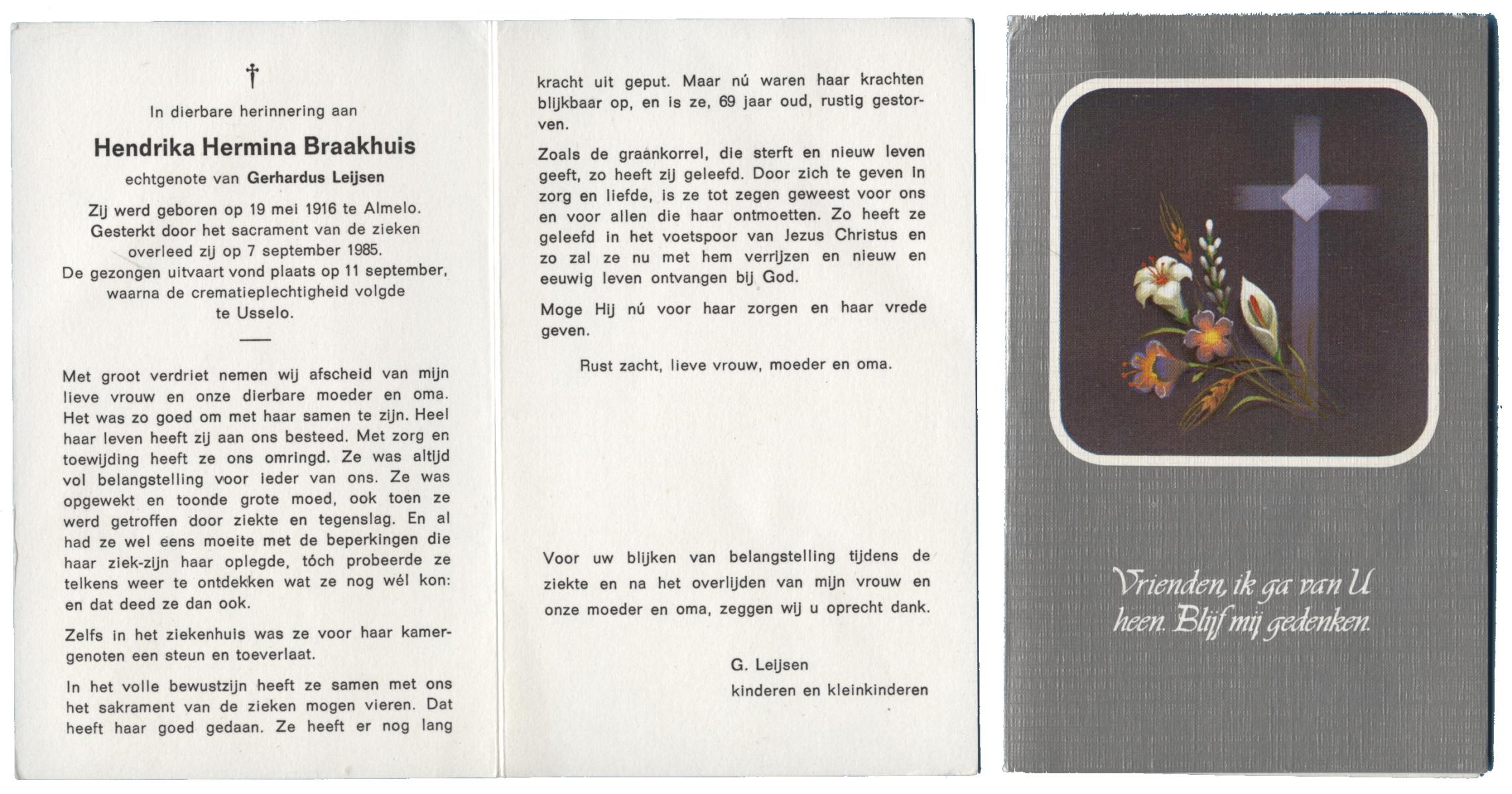 BRAAKHUIS, Hendrika Hermina, geboren op 19-5-1916 te Almelo, overleden op 7-9-1985 op 69-jarige leeftijd, gecremeerd op 11-9-1985 te Usselo.