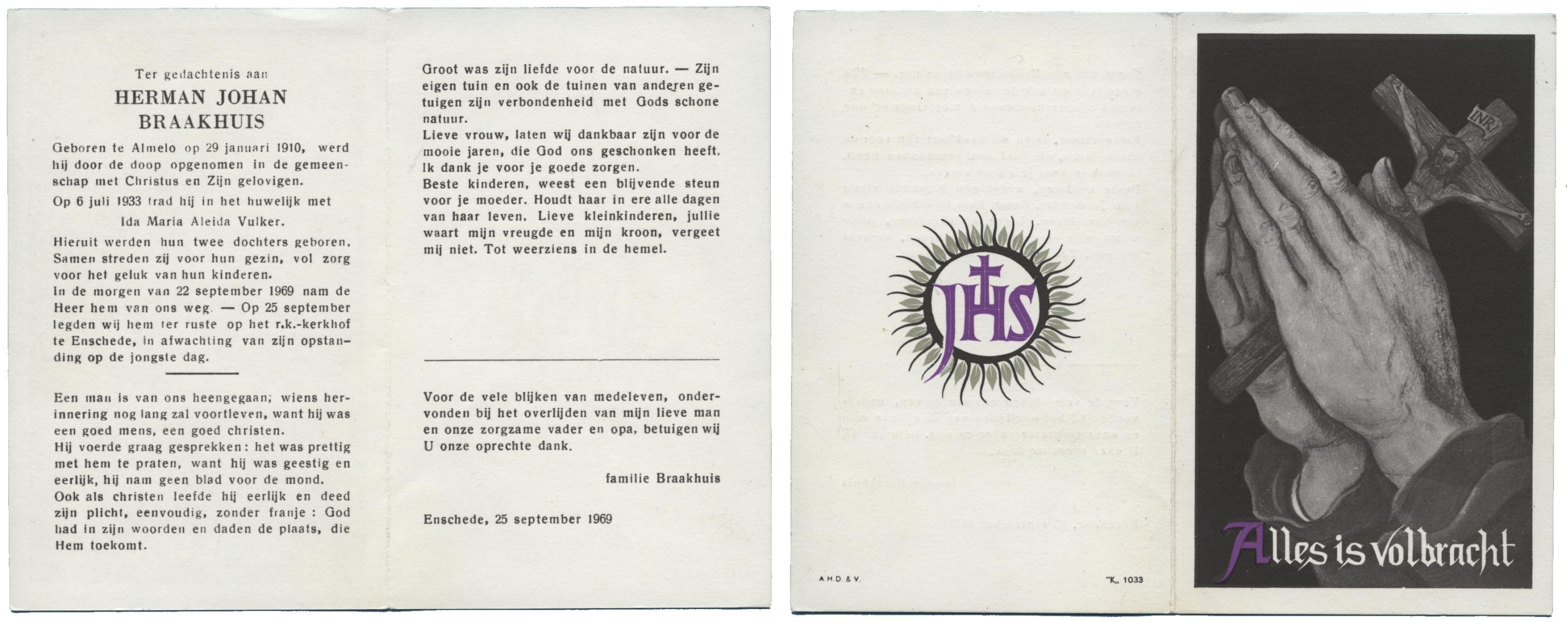 BRAAKHUIS, Herman Johan, geboren op 29-1-1910 te Almelo, overleden op 22-9-1969 op 59-jarige leeftijd, begraven op 25-9-1969 te Enschede.