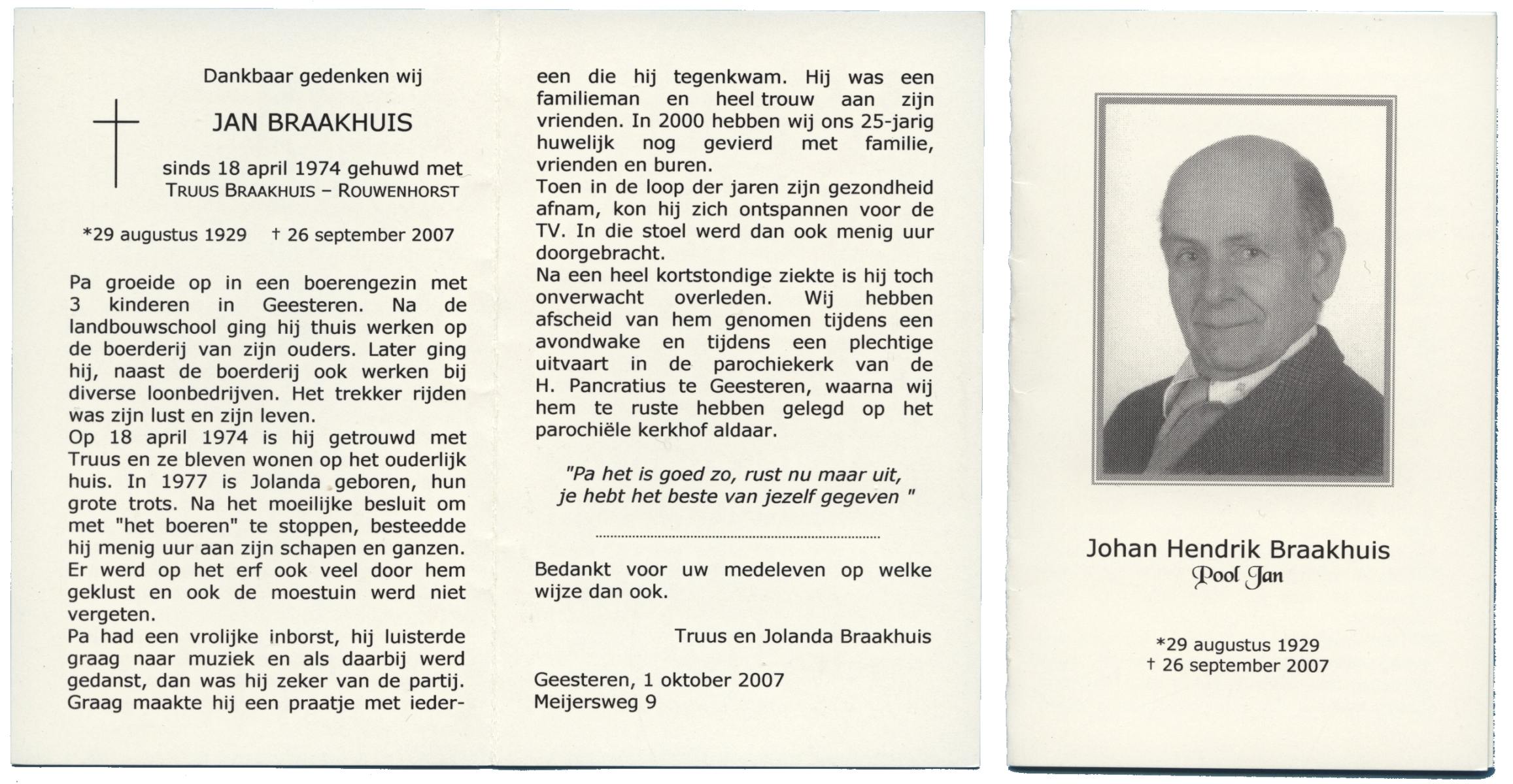 BRAAKHUIS, Jan ('Pool Jan'), geboren op 29-8-1929 te Geesteren (Ov.), overleden op 26-9-2007 op 78-jarige leeftijd, begraven te Geesteren.